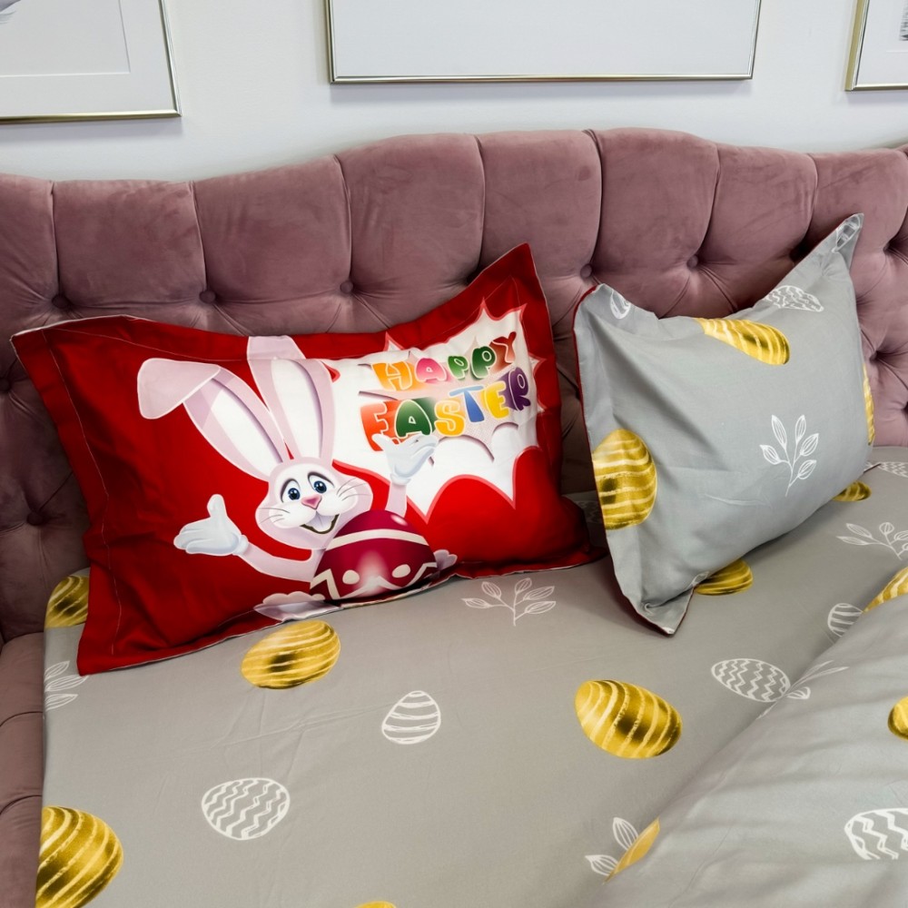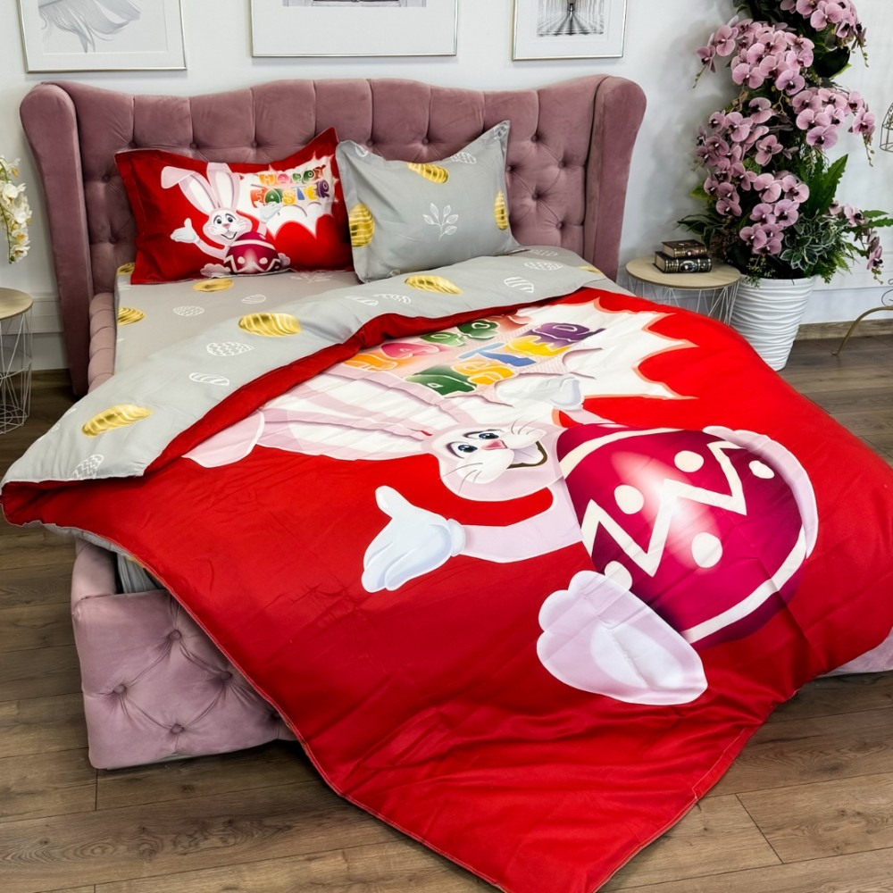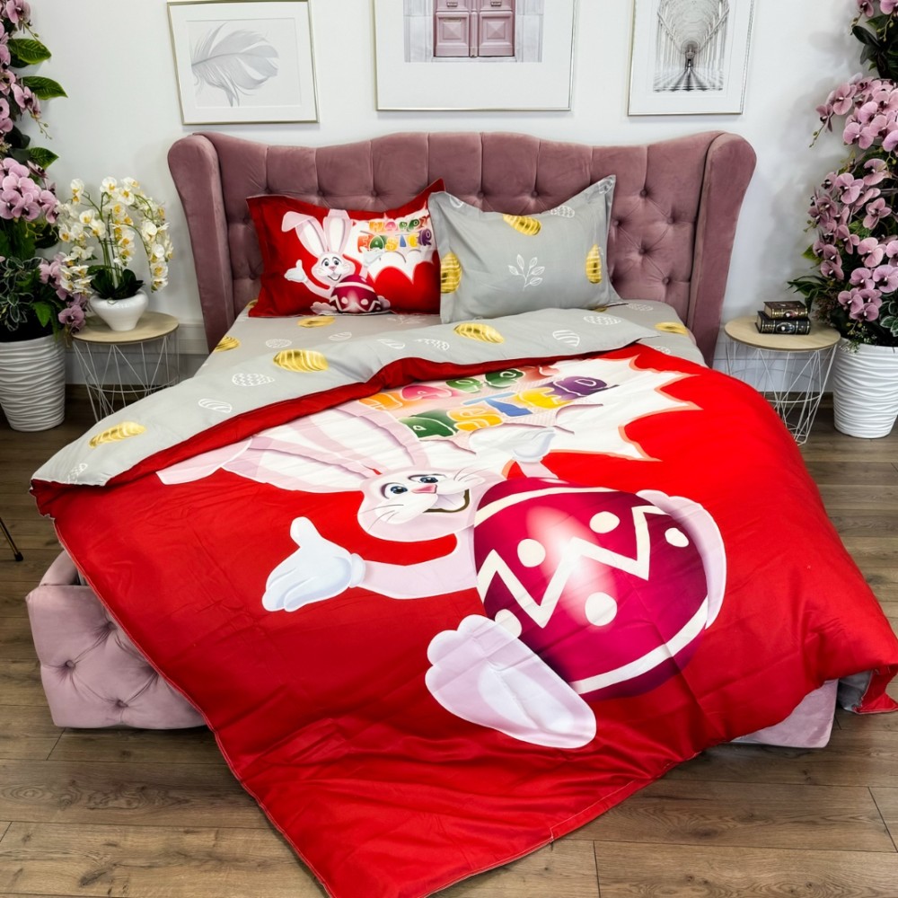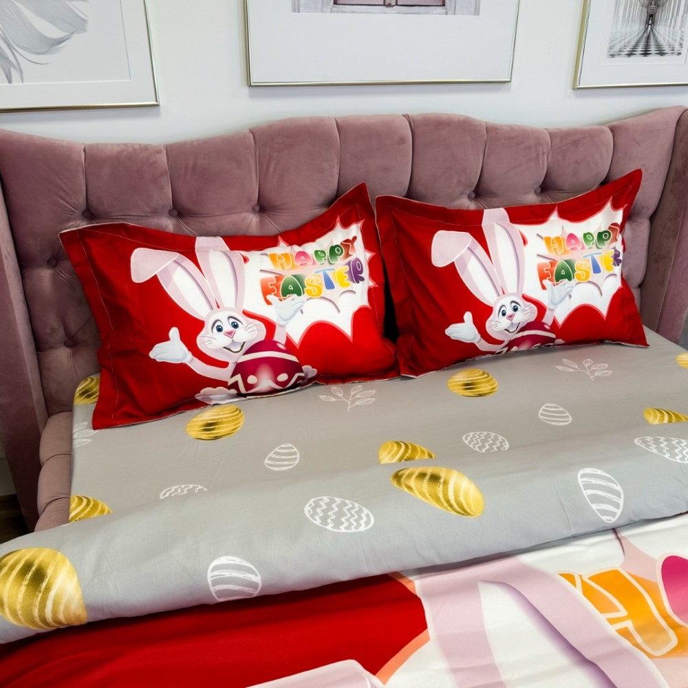 Lenjerie de Pat Dublu, Finet, Imprimeu Digital, 4 Piese, Roșu, Gri, Iepuraș, Happy Easter, Super Design Pucioasa, cod produs: SDP-PF-34