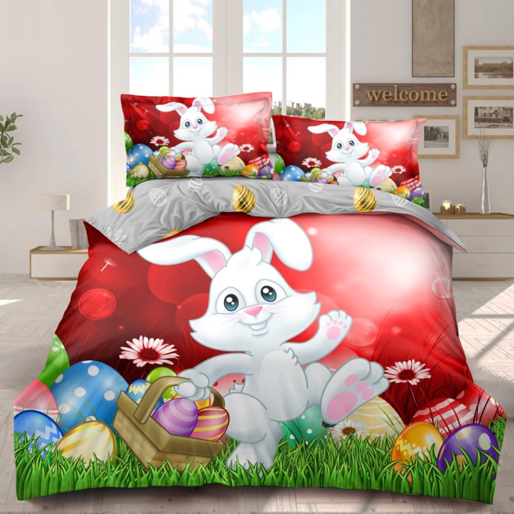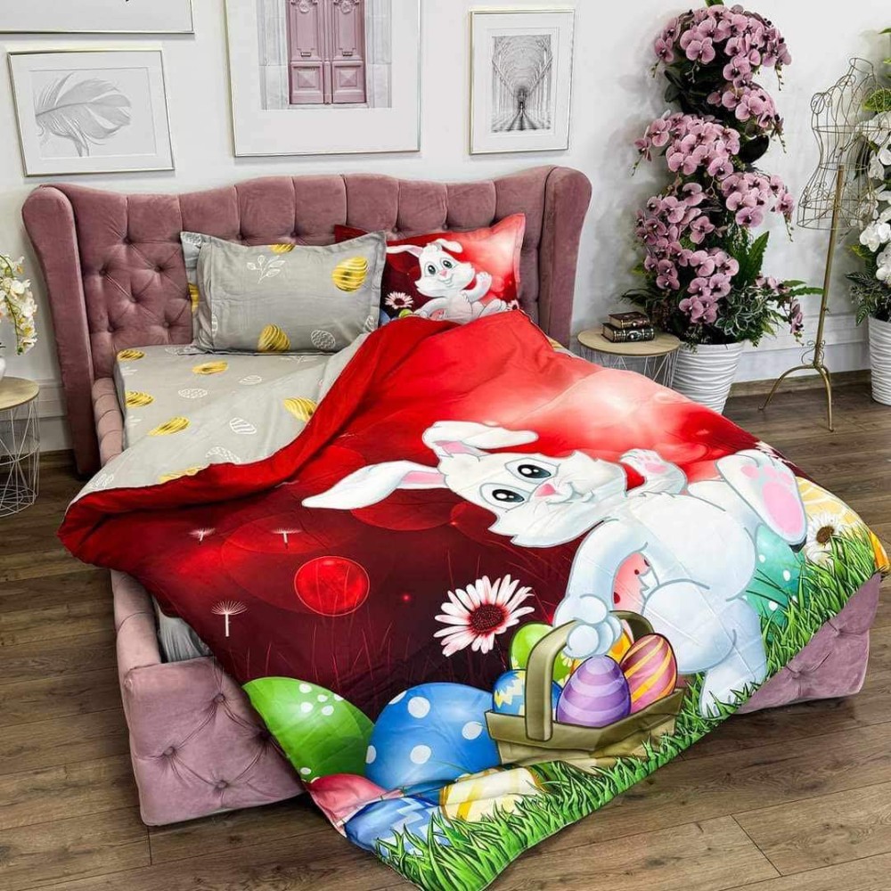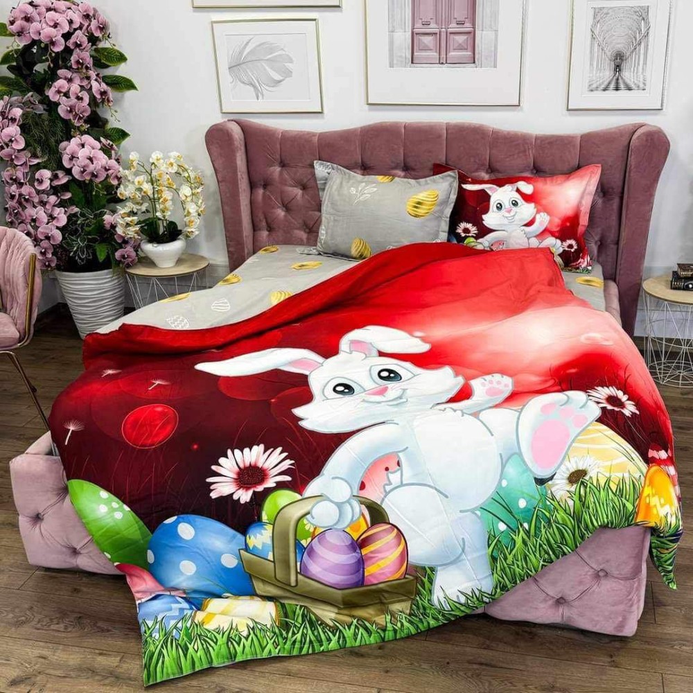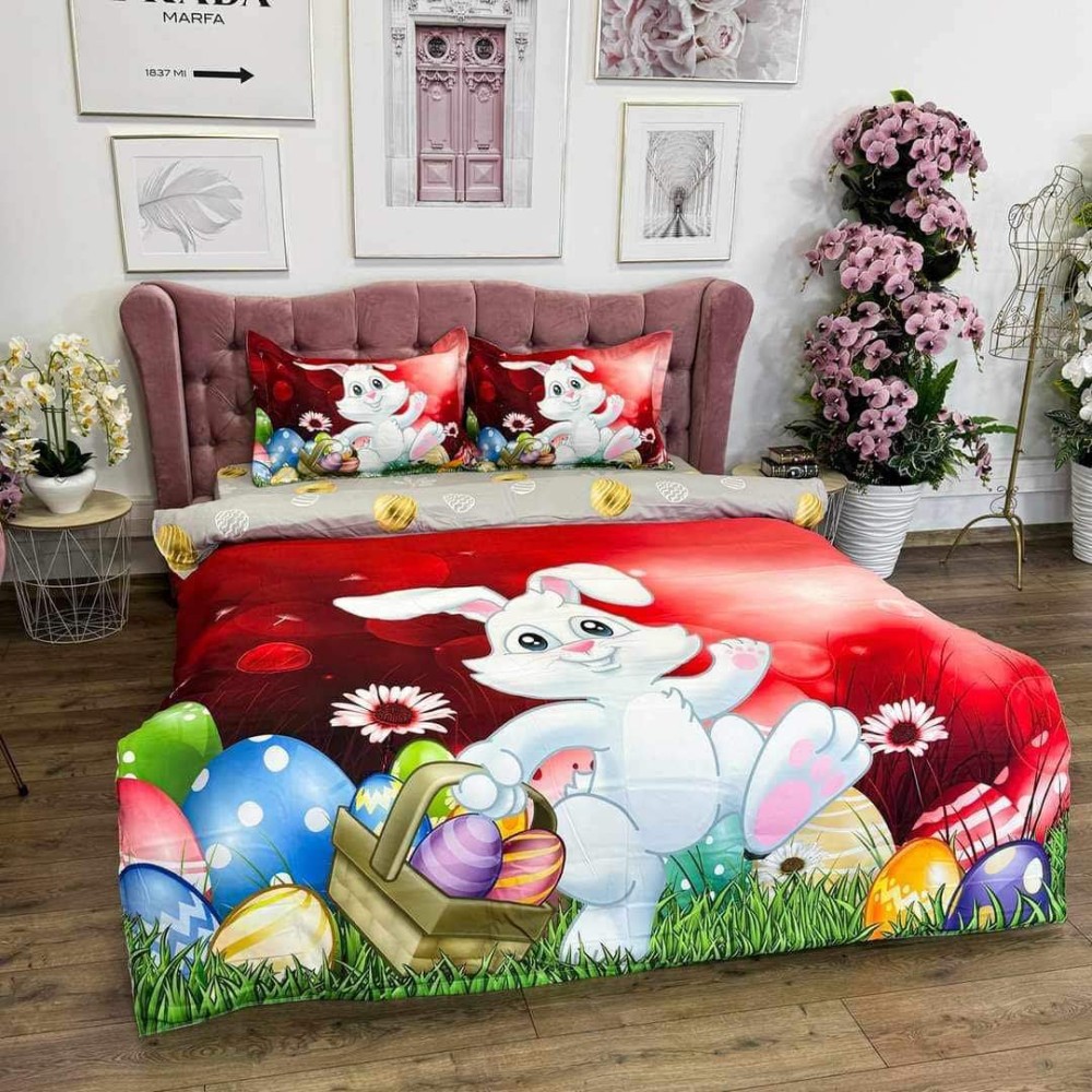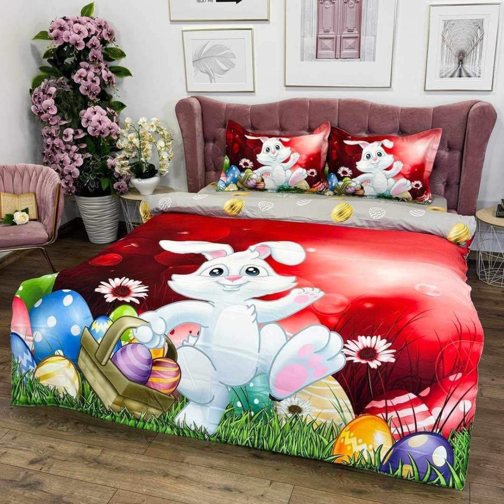 Lenjerie de Pat Dublu, Finet, Imprimeu Digital, 4 Piese, Roșu, Gri, Iepuraș, Oua Colorate, Super Design Pucioasa, cod produs: SDP-PF-35