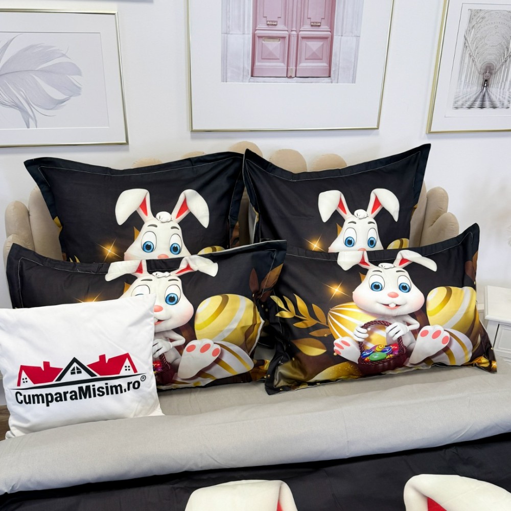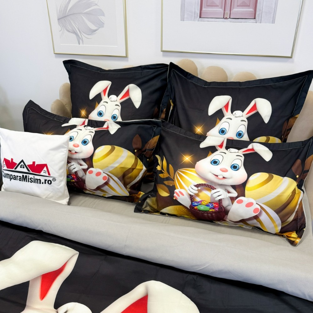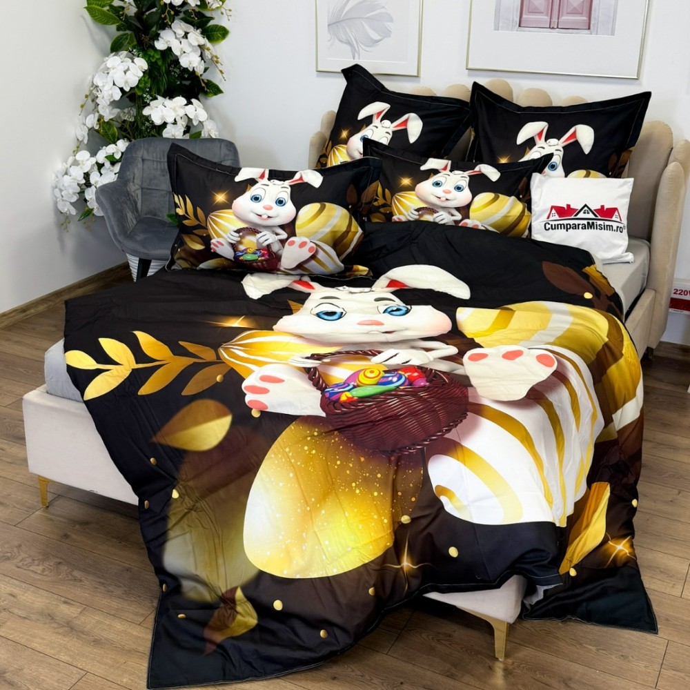 Lenjerie de Pat Dublu, Finet, Imprimeu Digital cu Iepuras si Oua, IDENTIC CU POZA, 4 Piese, Negru, Super Design Pucioasa, cod produs: HRT-LP-04