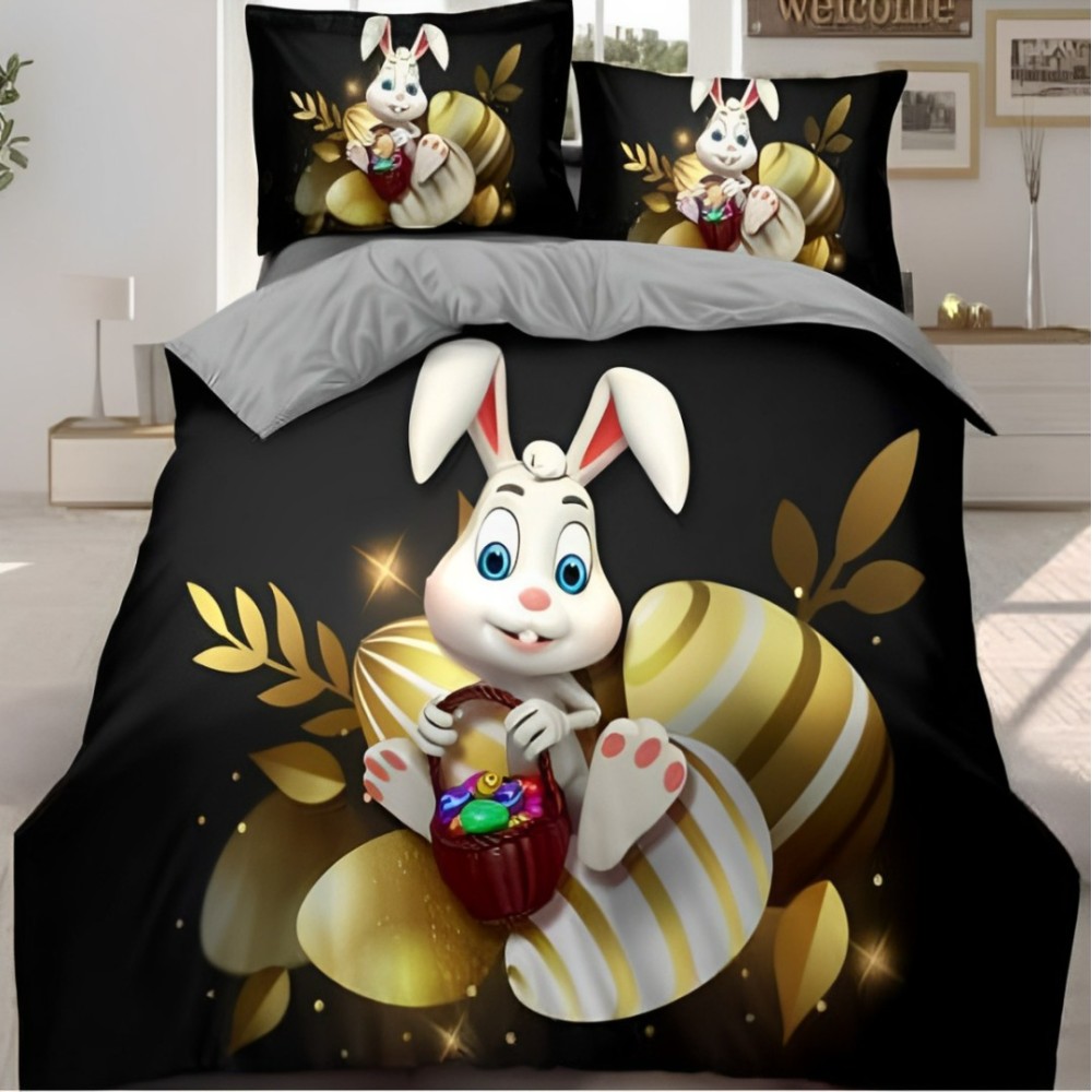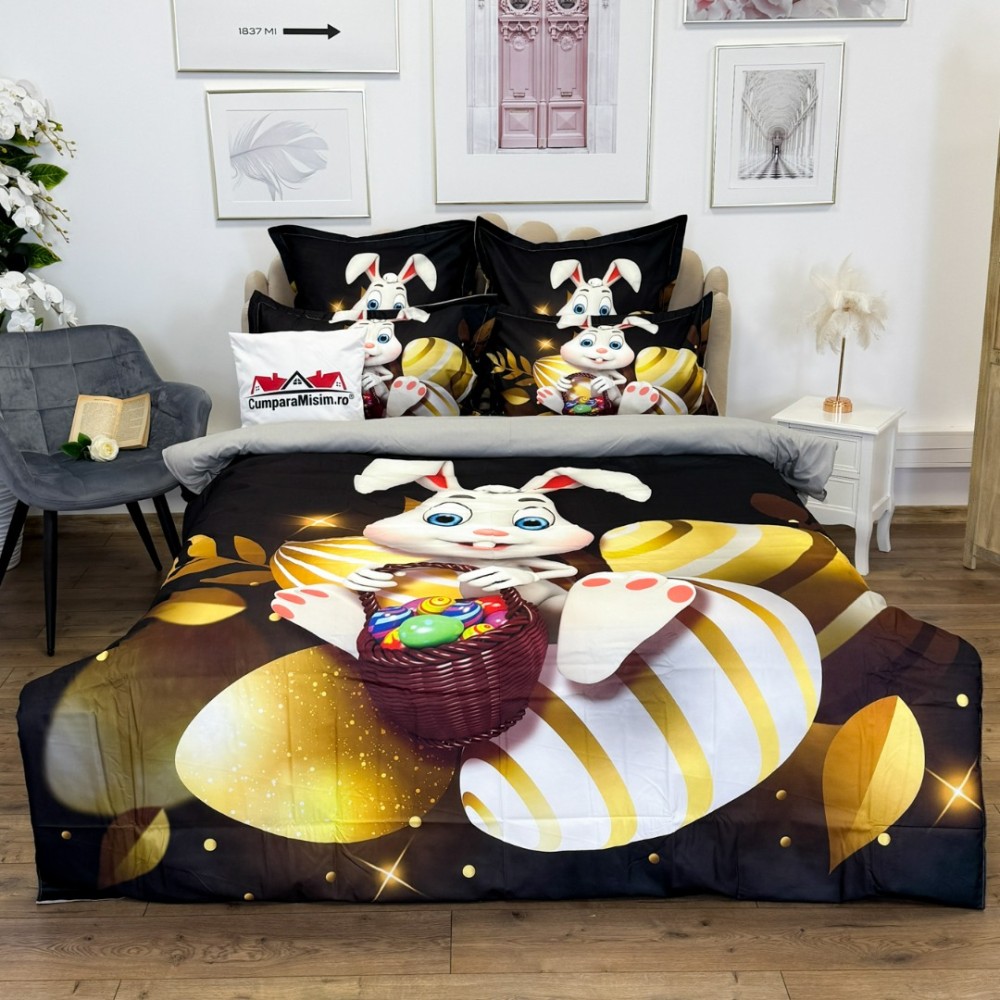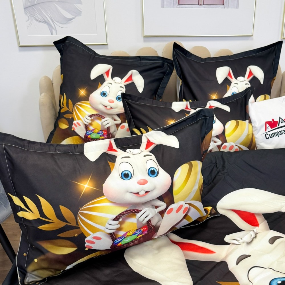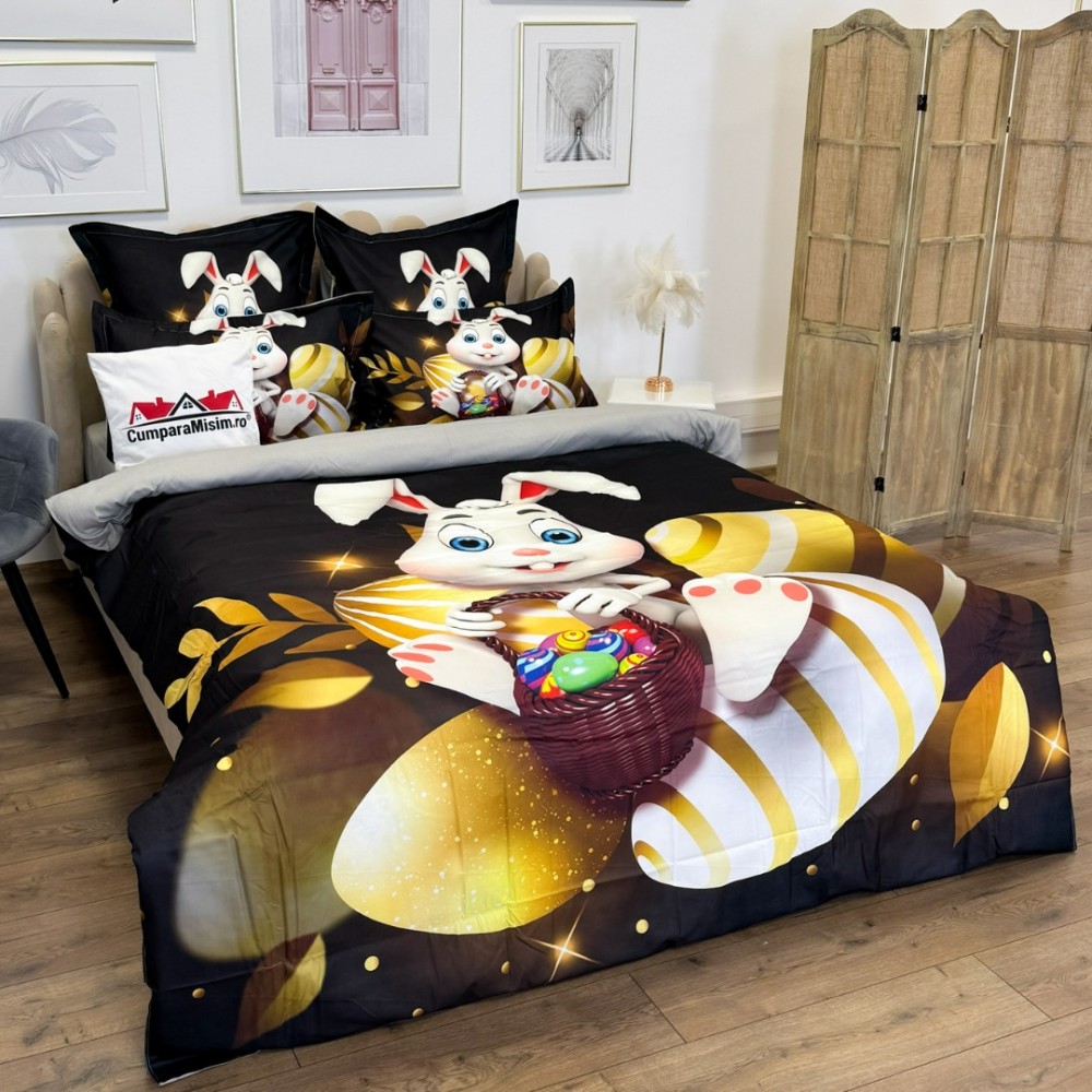 Lenjerie de Pat Dublu, Finet, Imprimeu Digital cu Iepuras si Oua, IDENTIC CU POZA, 4 Piese, Negru, Super Design Pucioasa, cod produs: HRT-LP-04