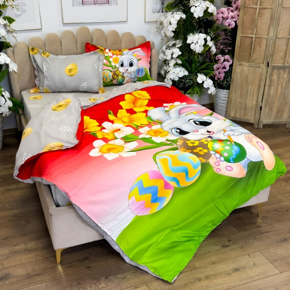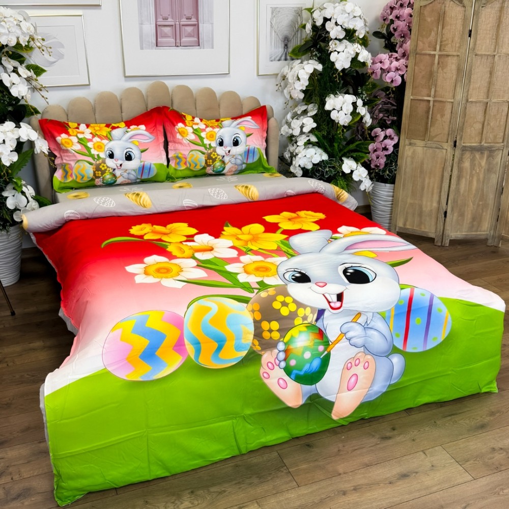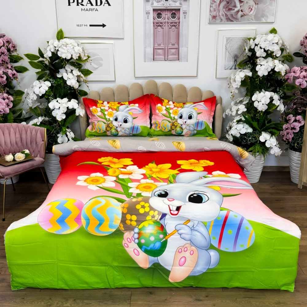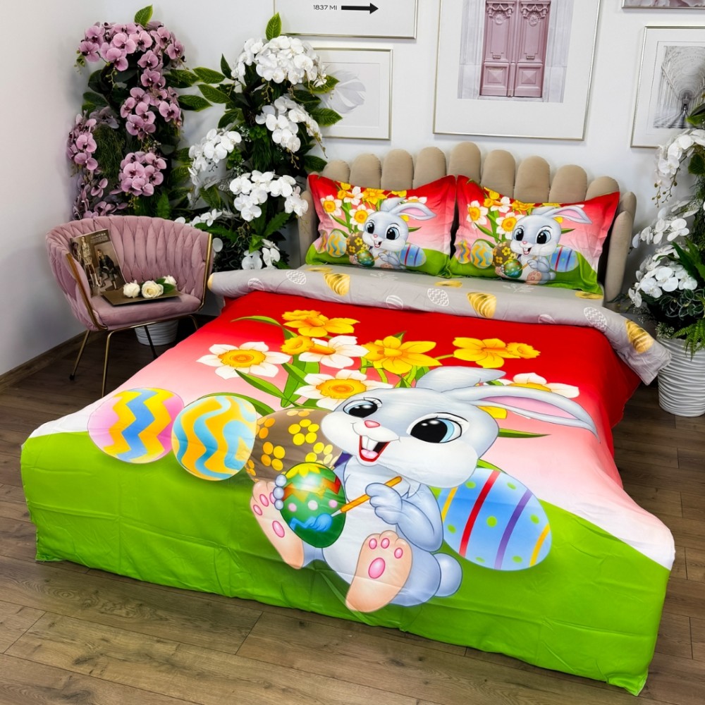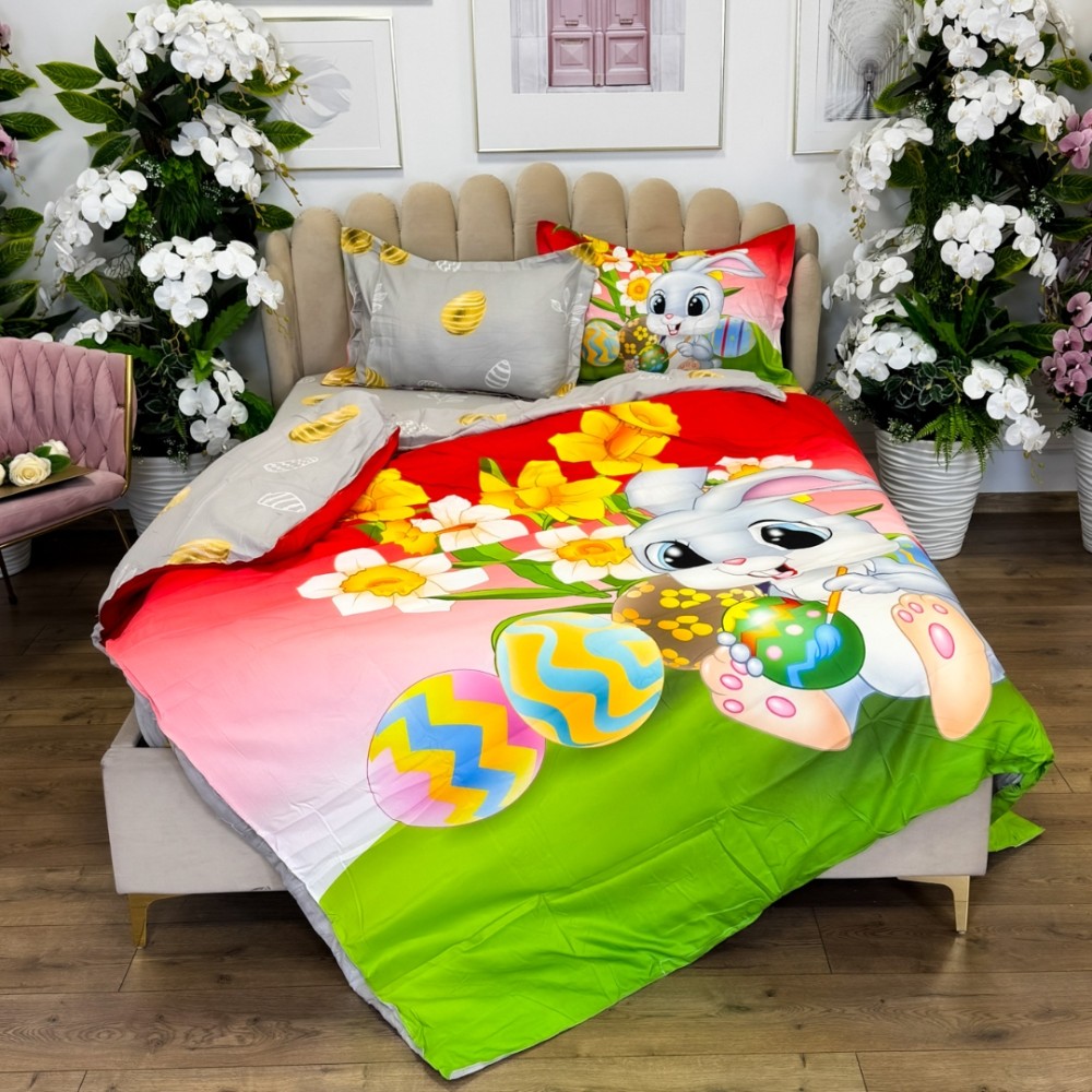 Lenjerie de Pat Dublu, Finet, Imprimeu Digital cu Iepuras si Oua, IDENTIC CU POZA, 4 Piese, Rosu, Verde, Super Design Pucioasa, cod produs: SDP-PF-36