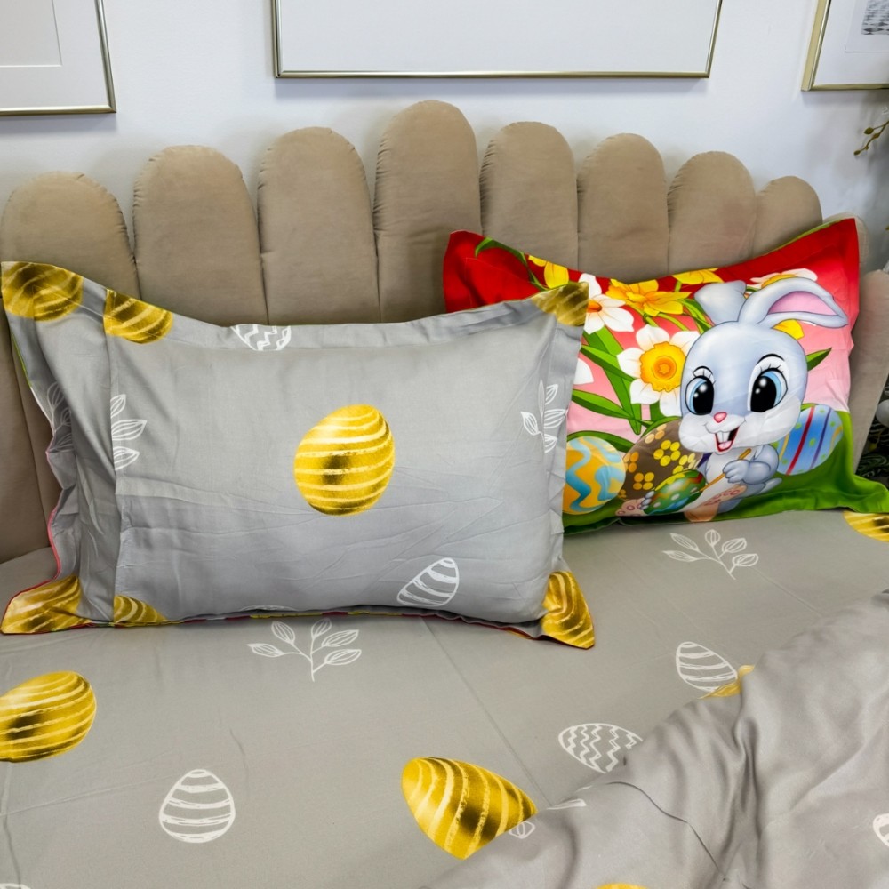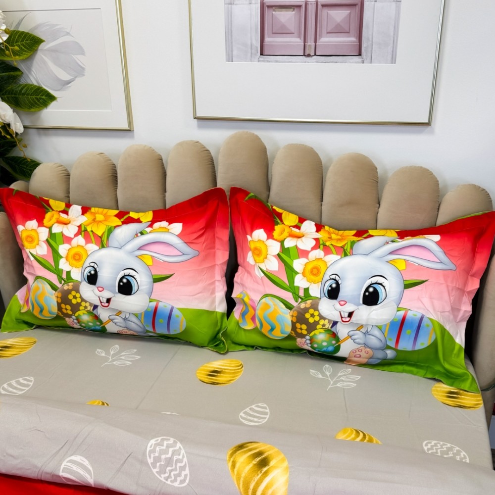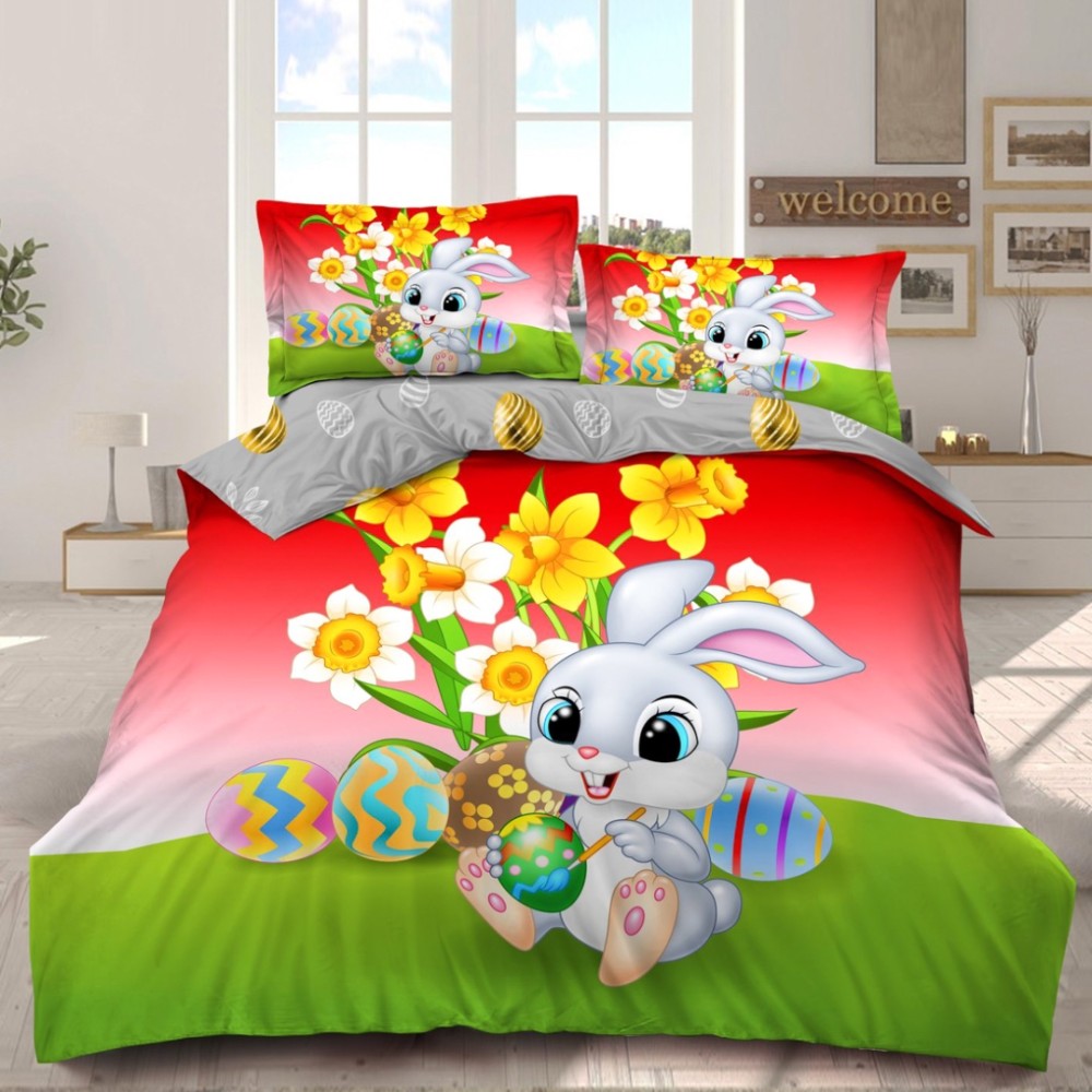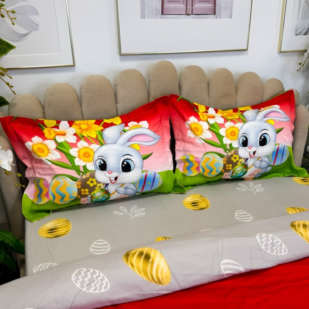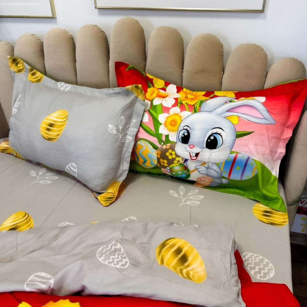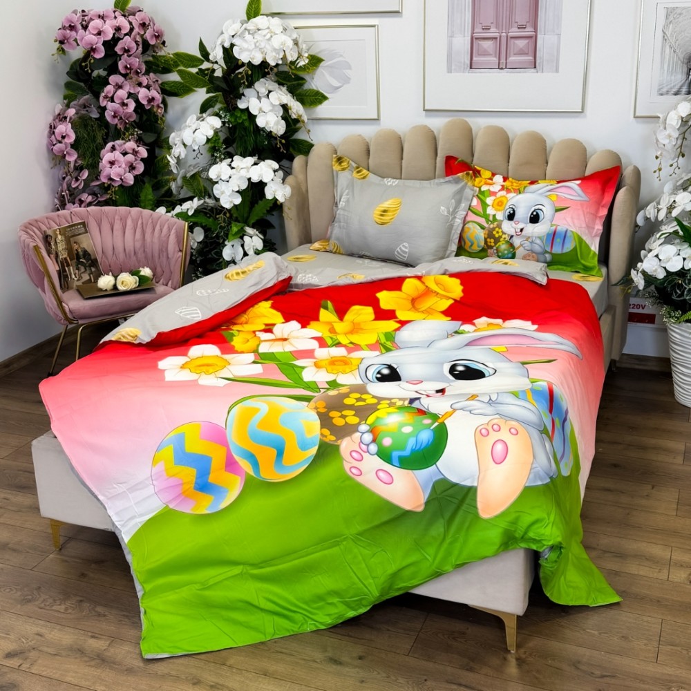 Lenjerie de Pat Dublu, Finet, Imprimeu Digital cu Iepuras si Oua, IDENTIC CU POZA, 4 Piese, Rosu, Verde, Super Design Pucioasa, cod produs: SDP-PF-36