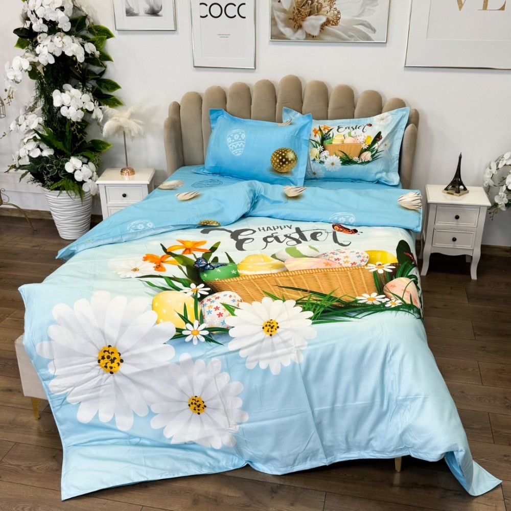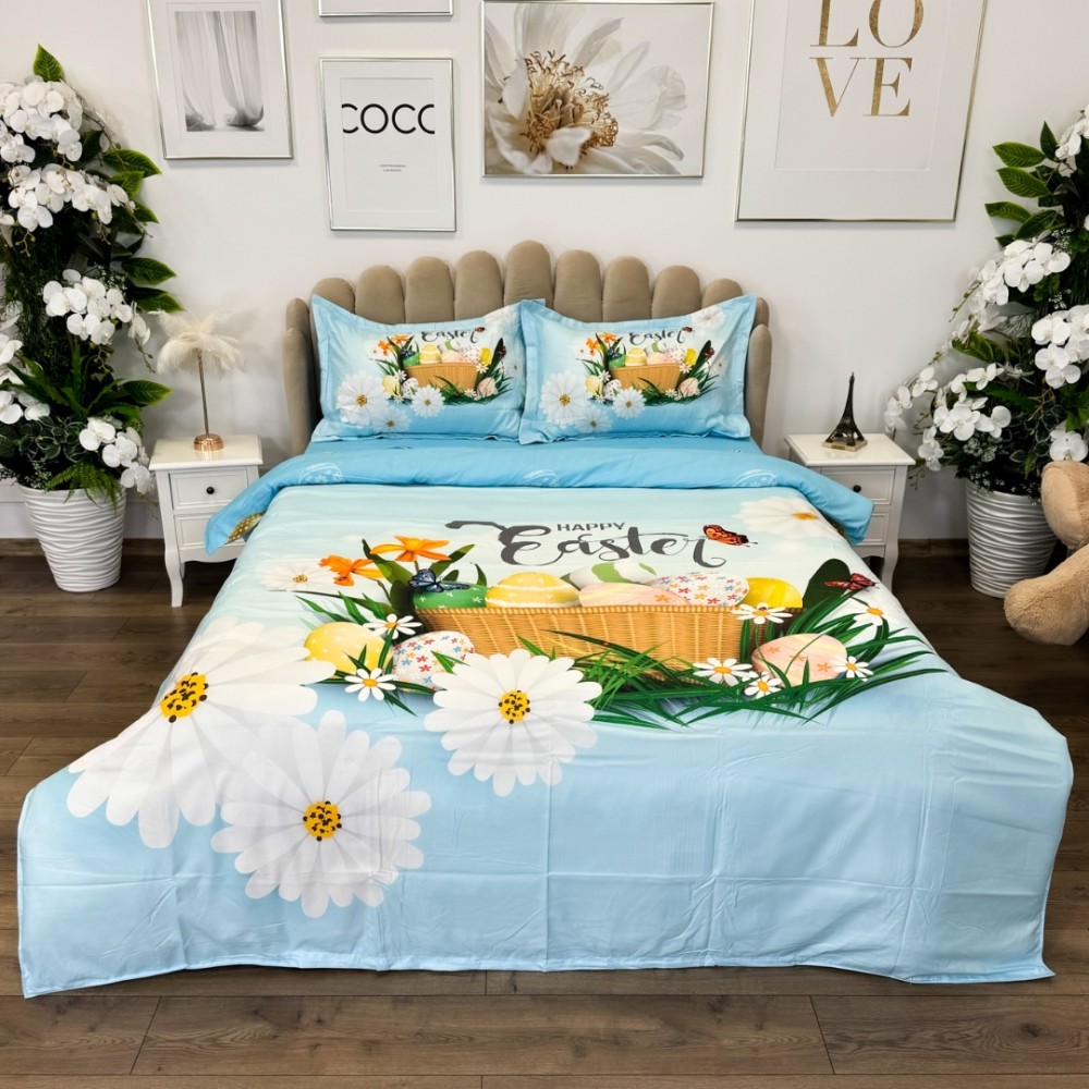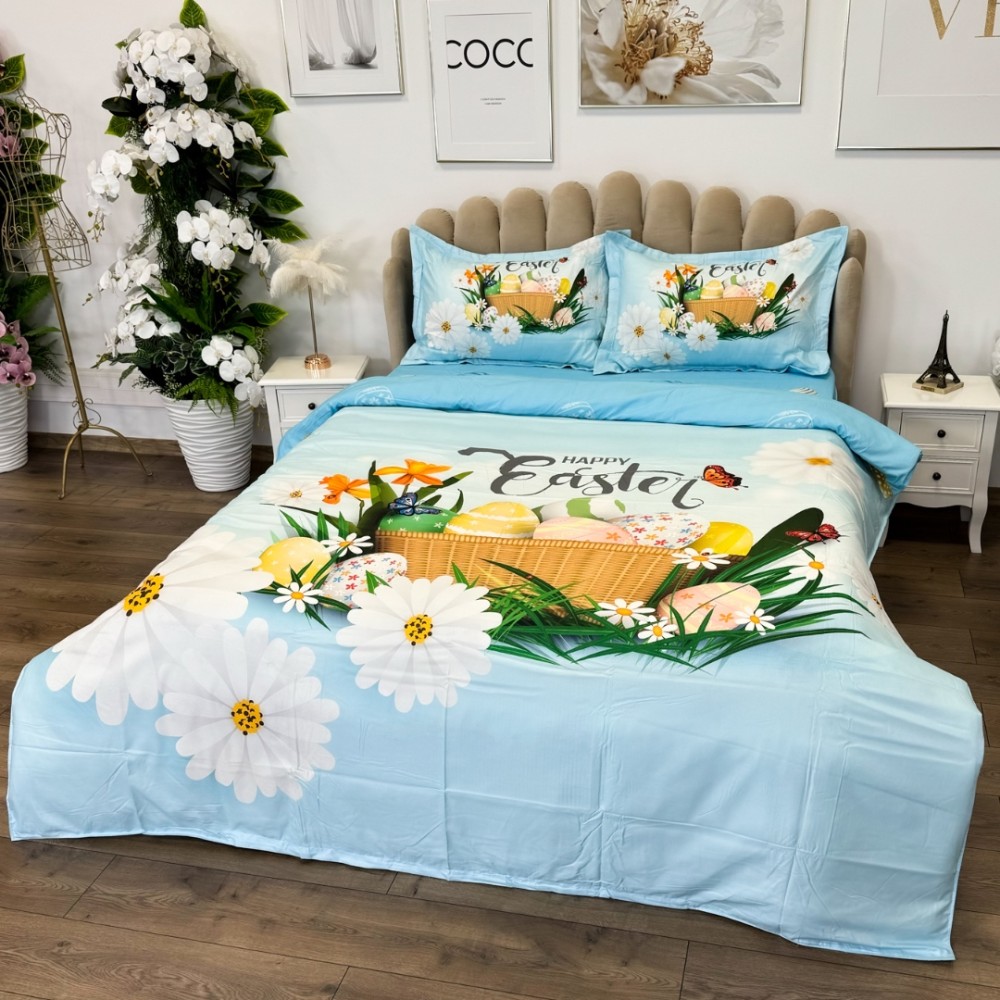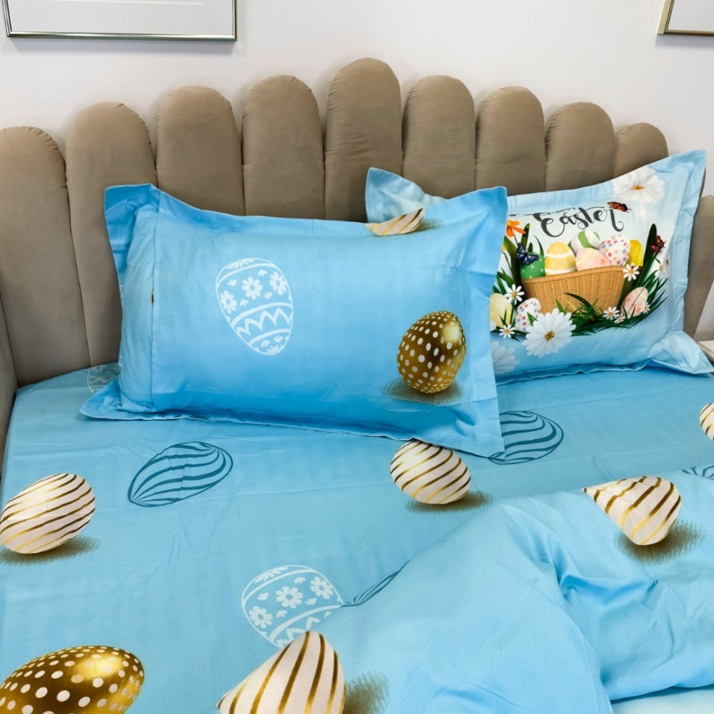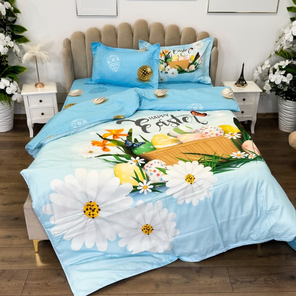 Lenjerie de Pat Dublu, Finet, Imprimeu Digital cu Oua, IDENTIC CU POZA, 4 Piese, Bleu, Super Design Pucioasa, cod produs: SDP-PF-6