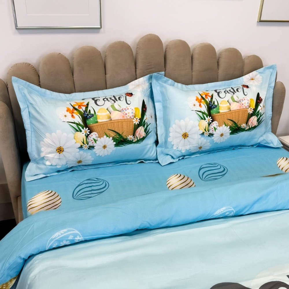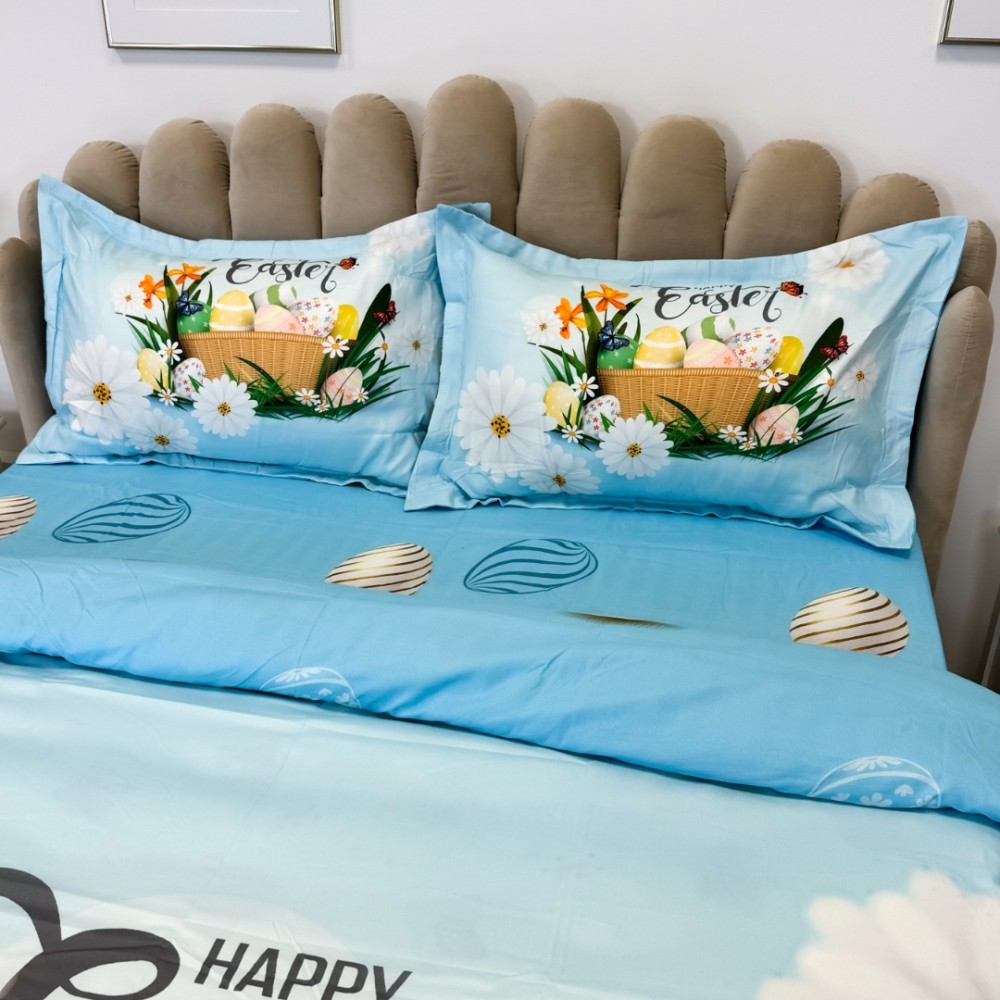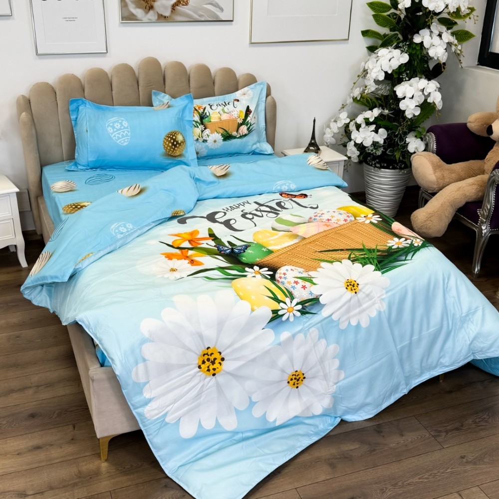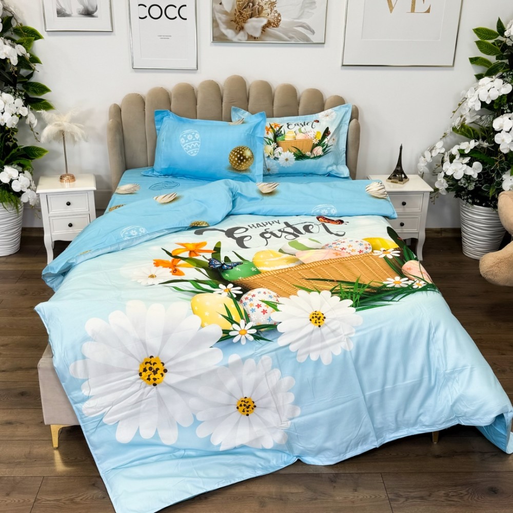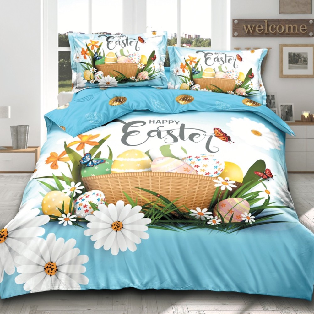 Lenjerie de Pat Dublu, Finet, Imprimeu Digital cu Oua, IDENTIC CU POZA, 4 Piese, Bleu, Super Design Pucioasa, cod produs: SDP-PF-6