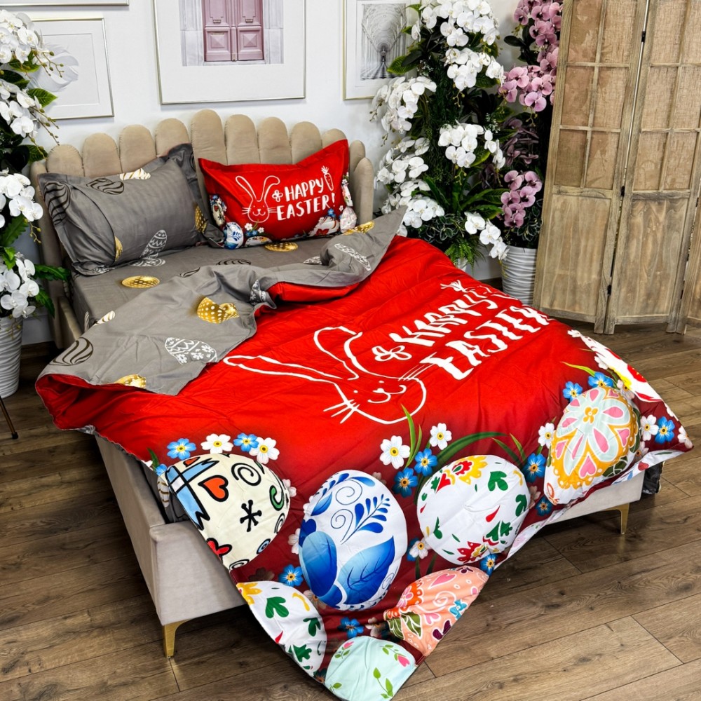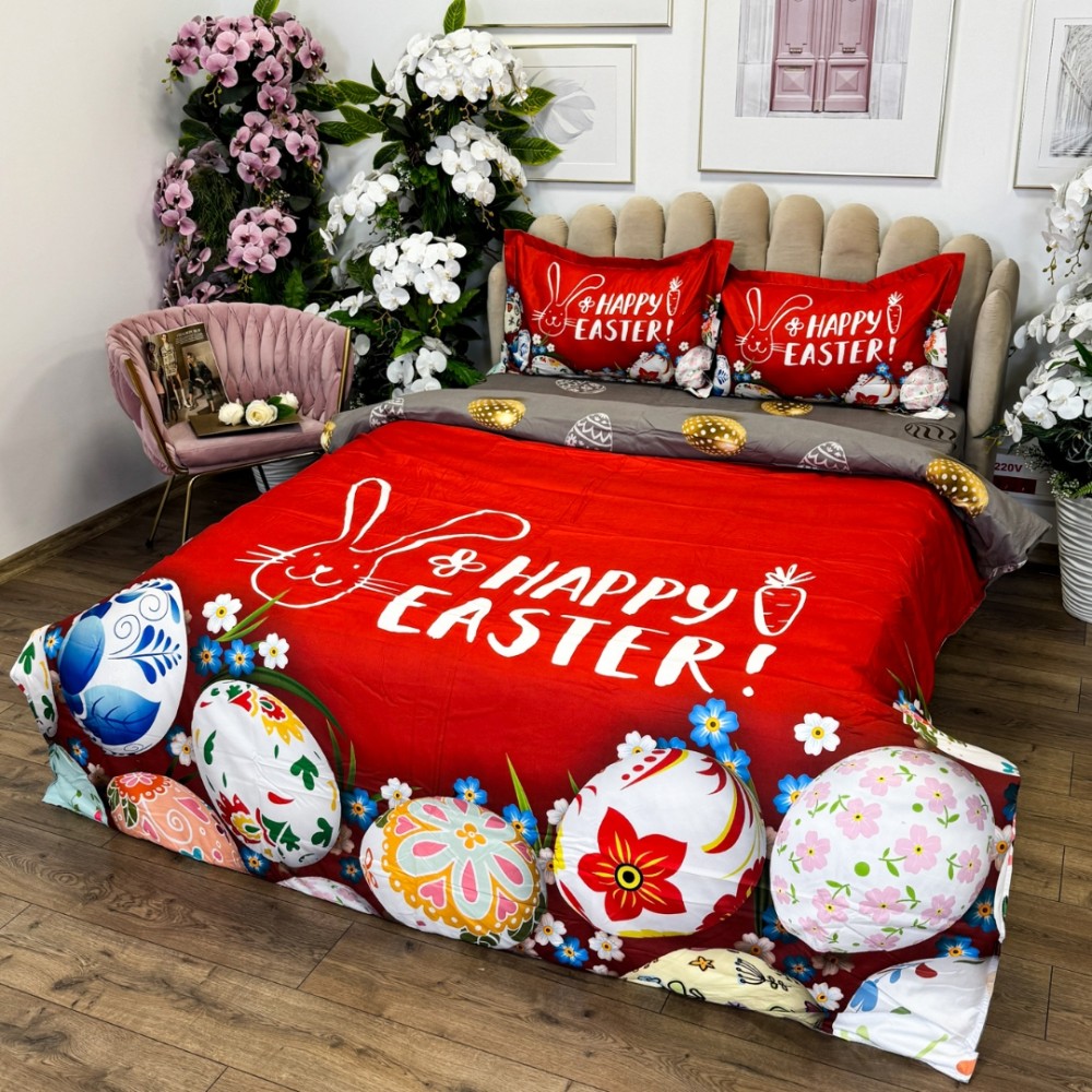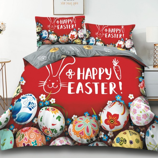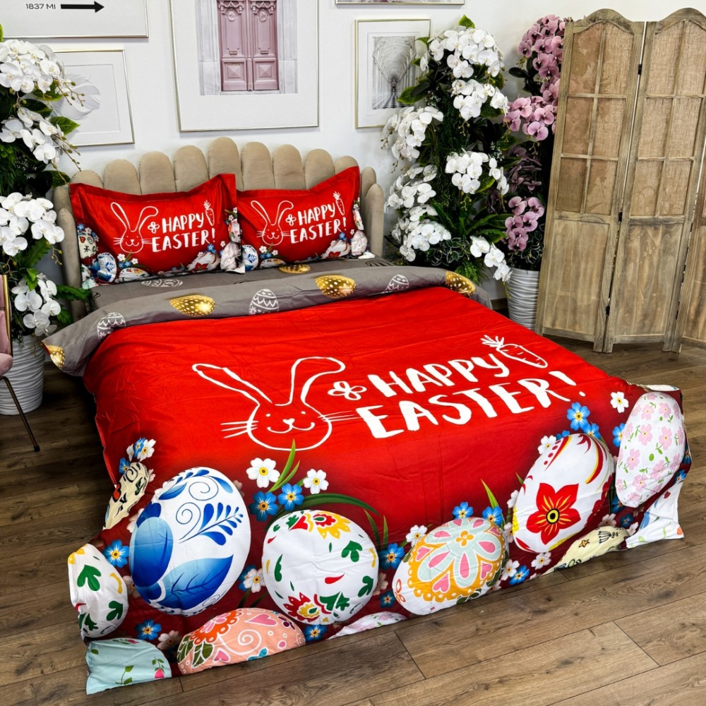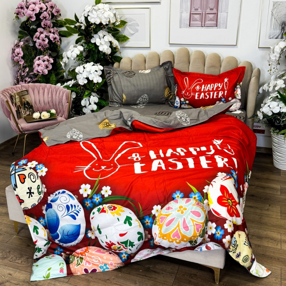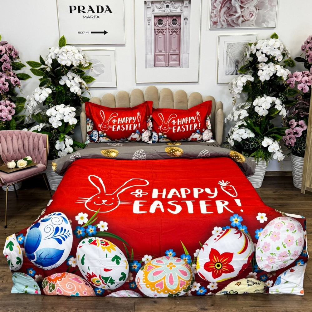 Lenjerie de Pat Dublu, Finet, Imprimeu Digital cu Oua, IDENTIC CU POZA, 4 Piese, Rosu, Super Design Pucioasa, cod produs: SDP-PF-21