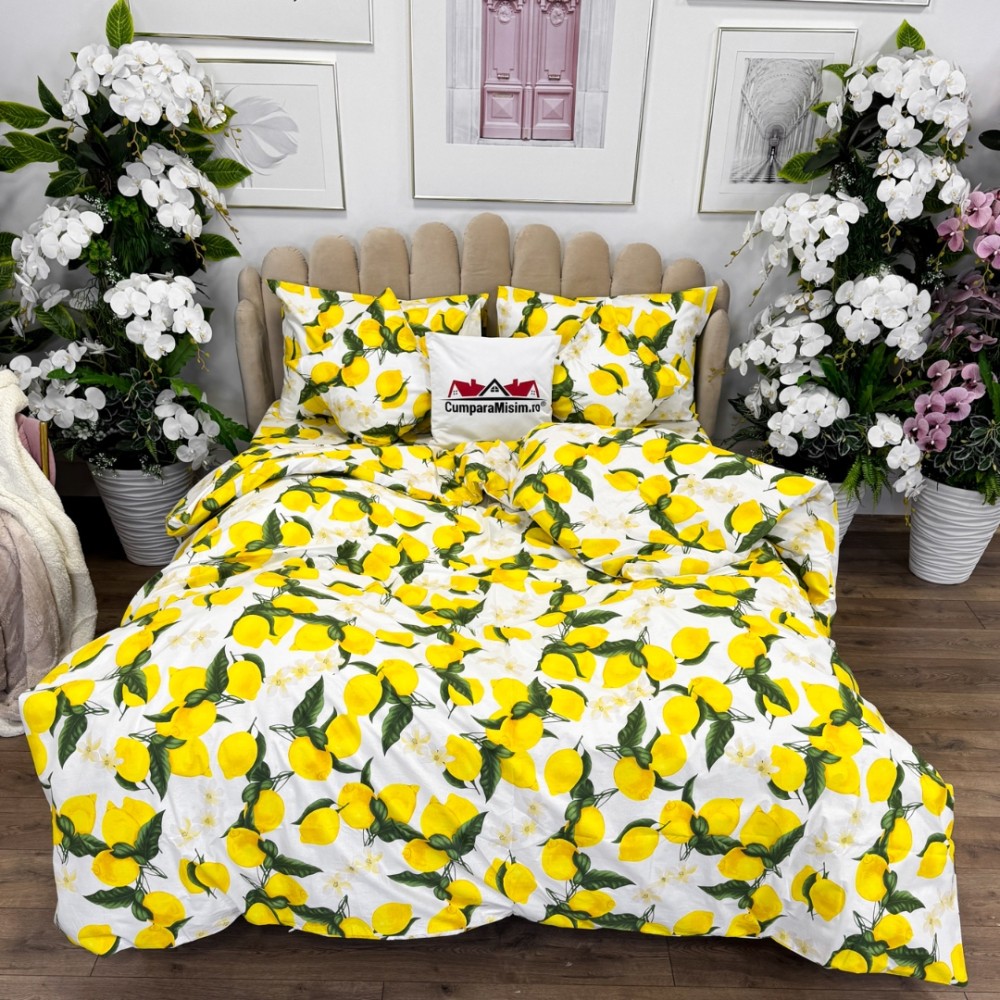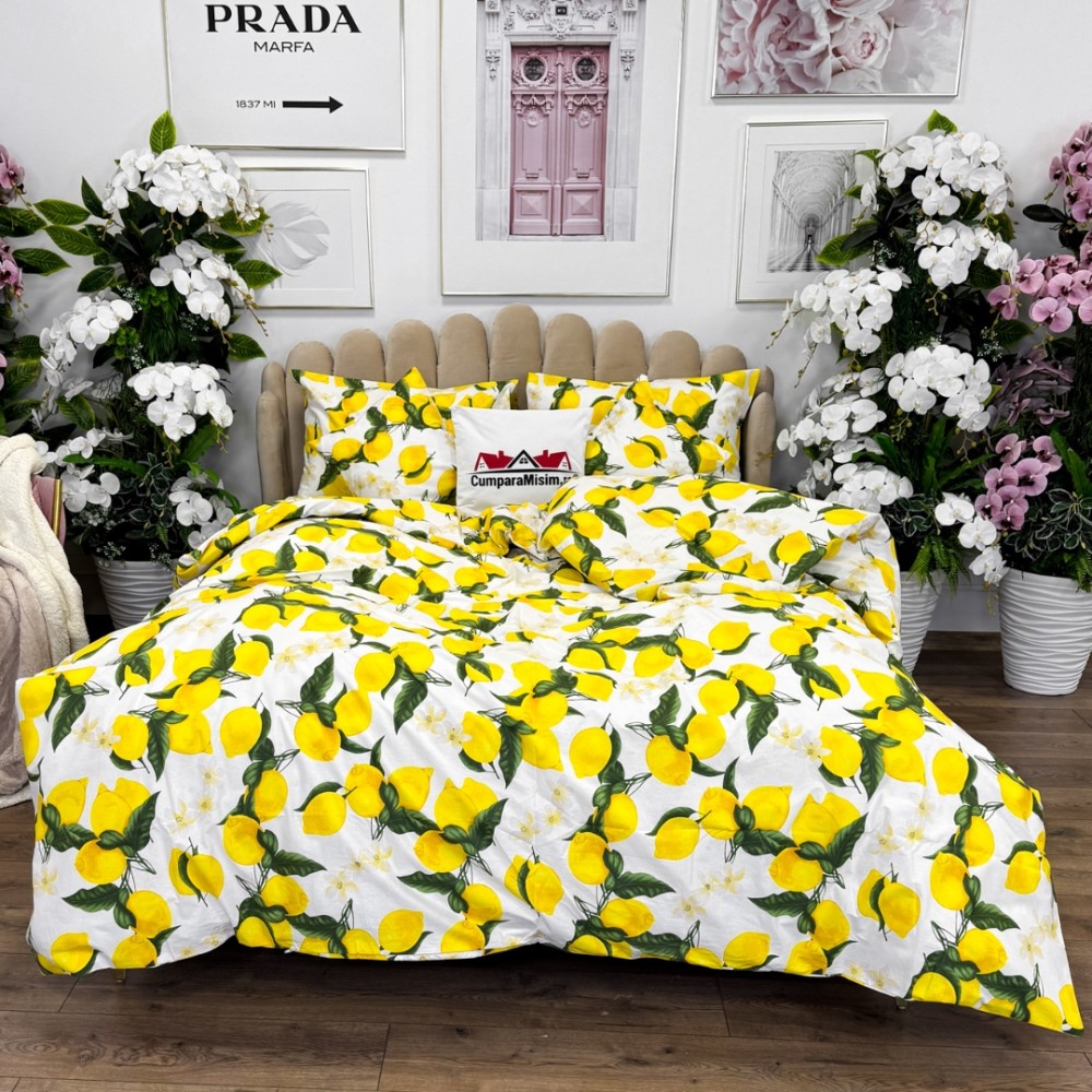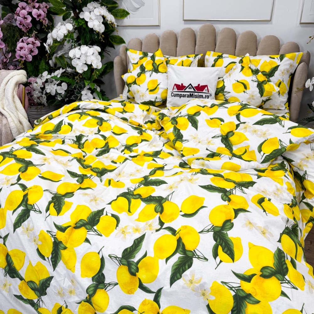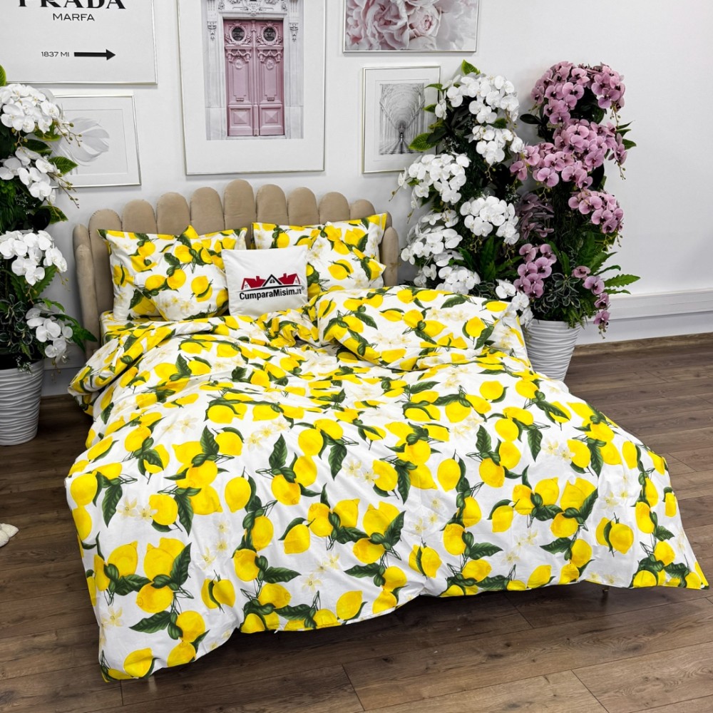 Lenjerie de Pat Dublu, Bumbac Ranforce, 6 piese, Croită cu Grija in Atelierul Cumparamisim - Lux Suprem, Rafinament Desăvârșit, Confort Regal, Alb, Galben, lămâi si flori de lămâi , cod produs: CMP-RF01