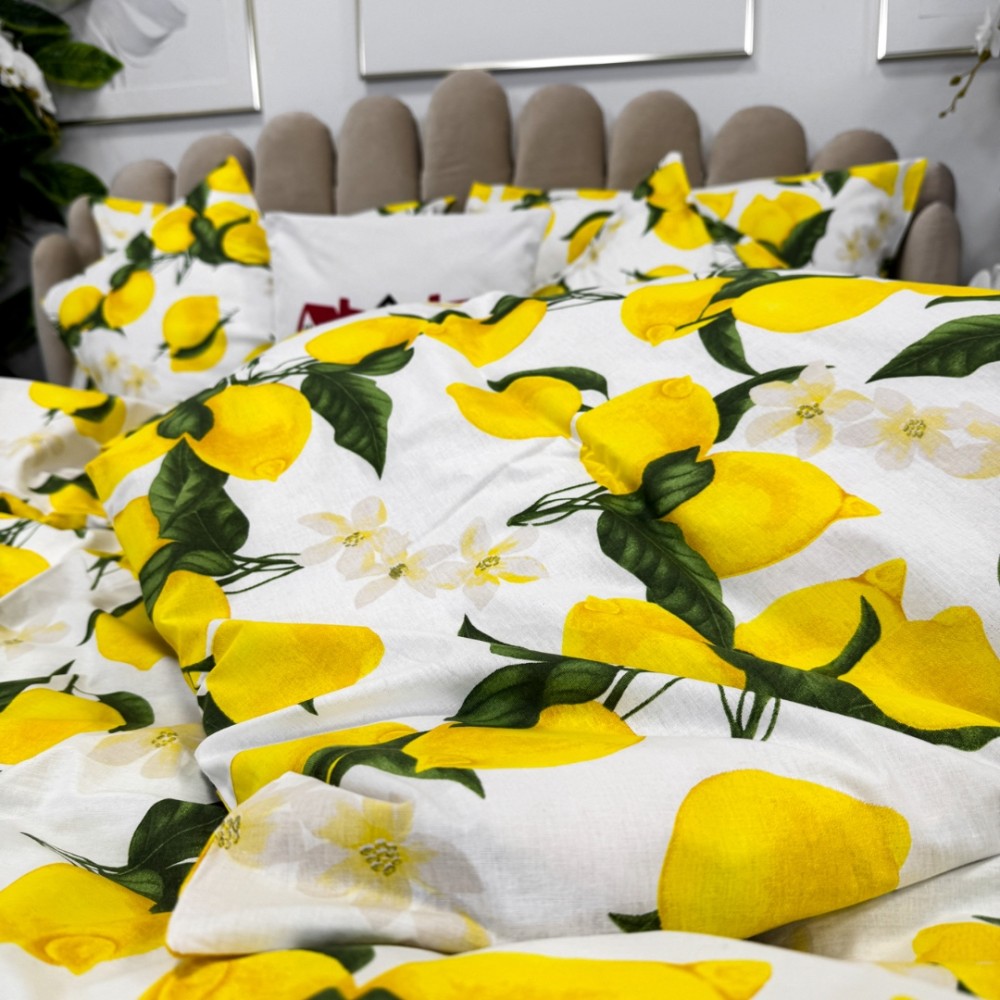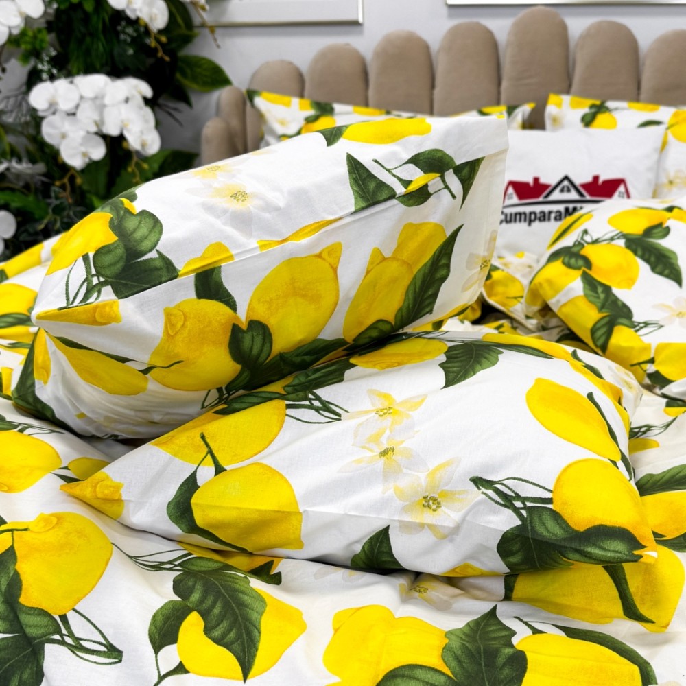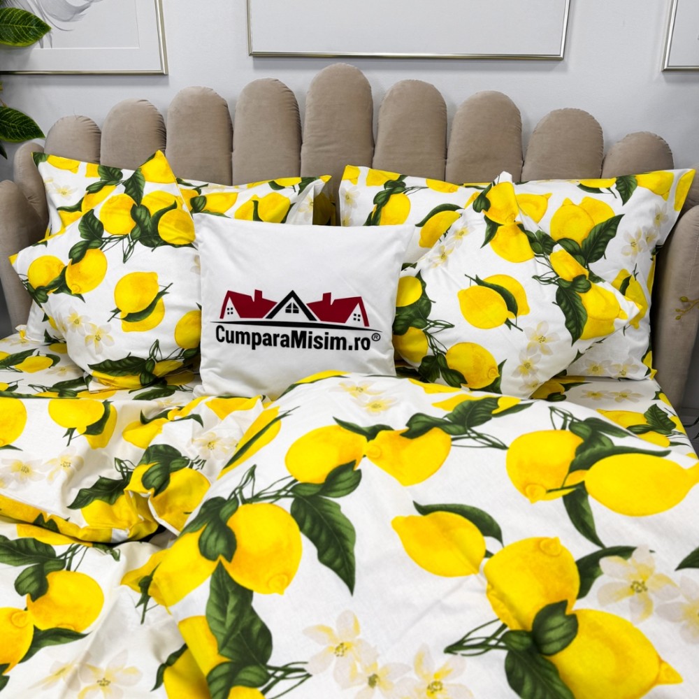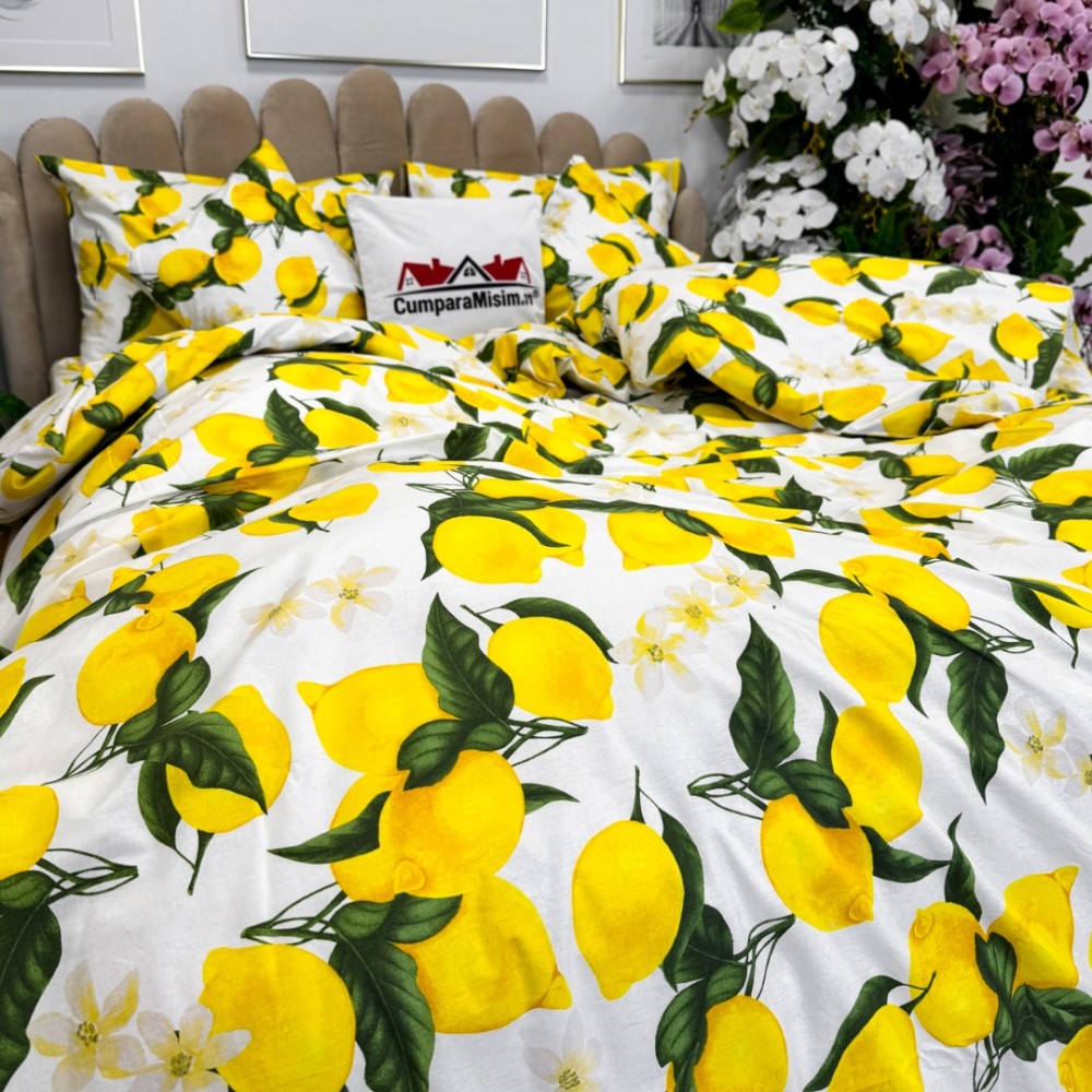 Lenjerie de Pat Dublu, Bumbac Ranforce, 6 piese, Croită cu Grija in Atelierul Cumparamisim - Lux Suprem, Rafinament Desăvârșit, Confort Regal, Alb, Galben, lămâi si flori de lămâi , cod produs: CMP-RF01