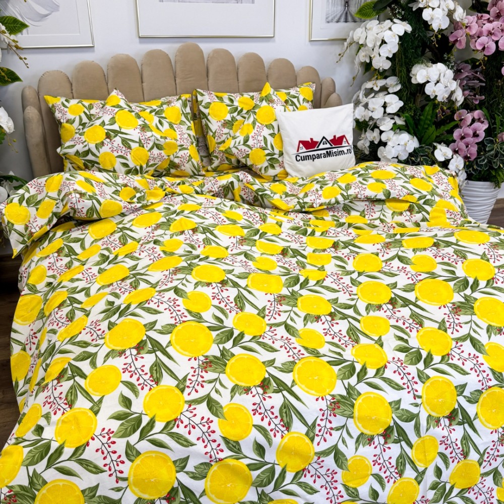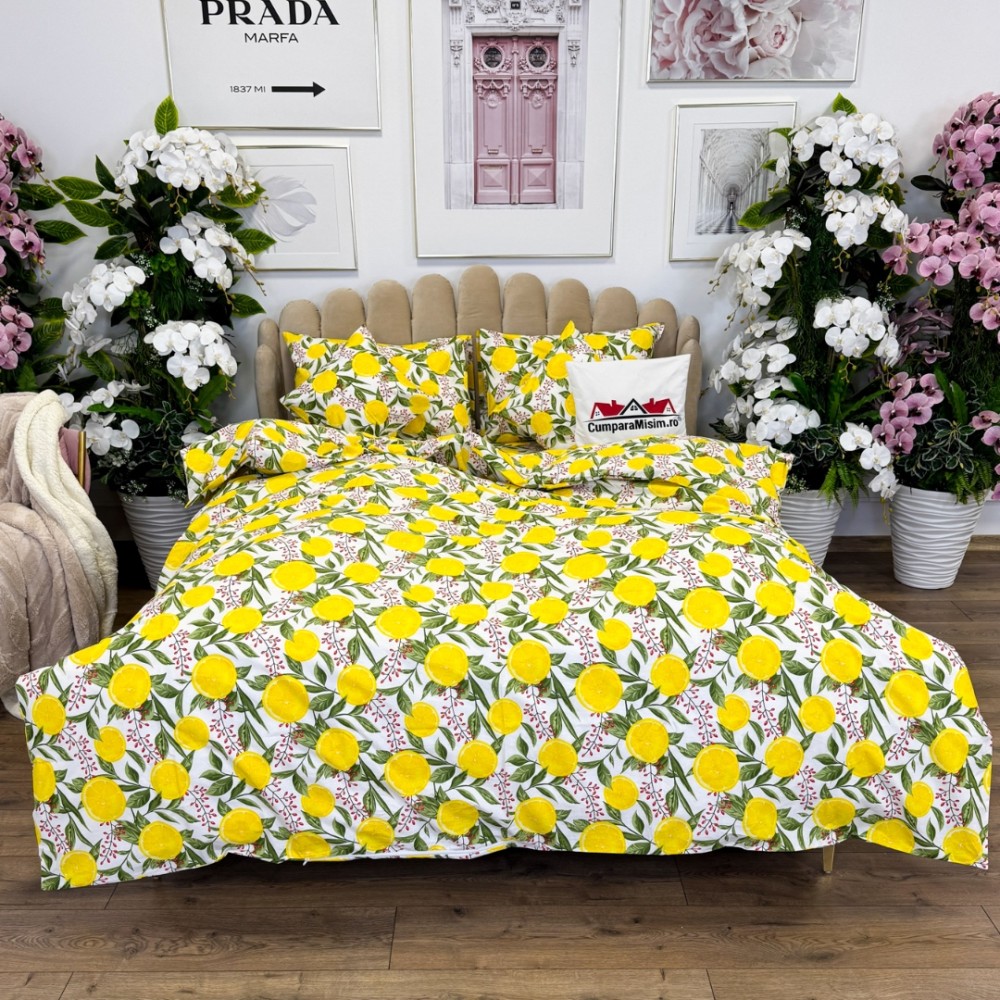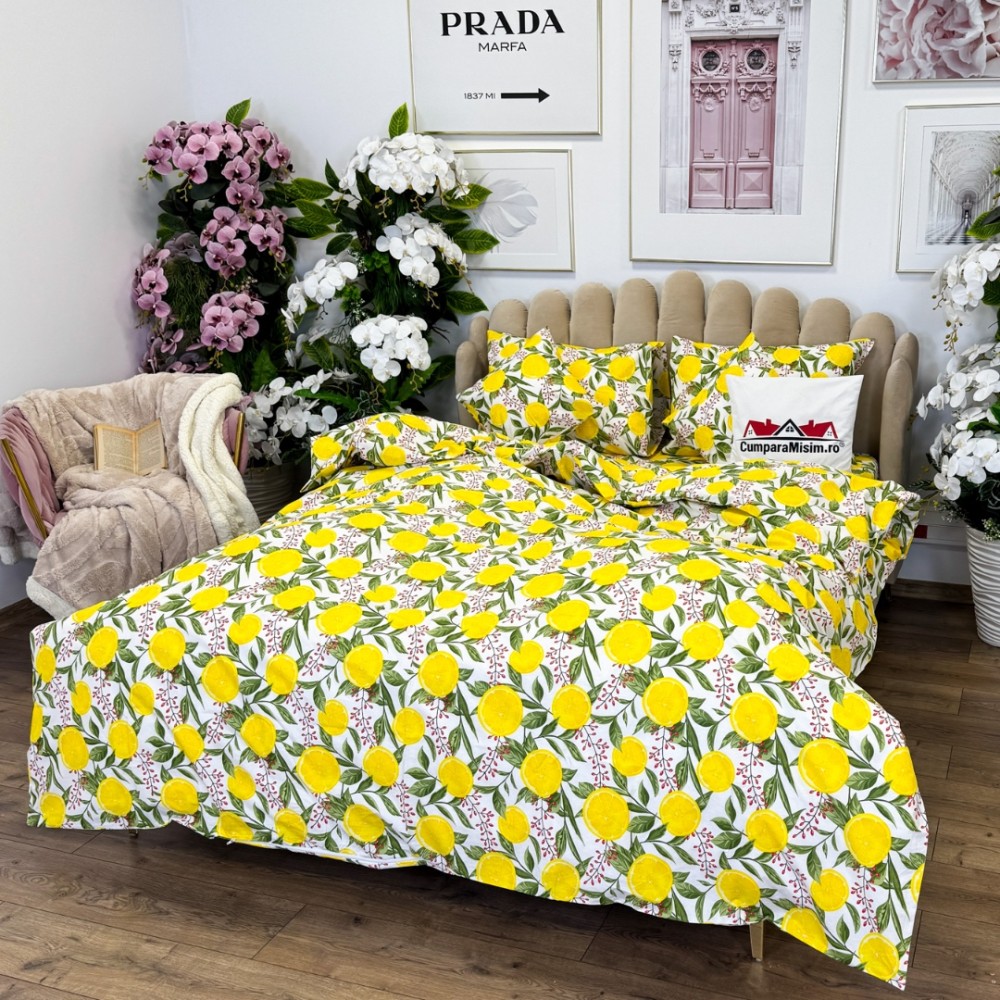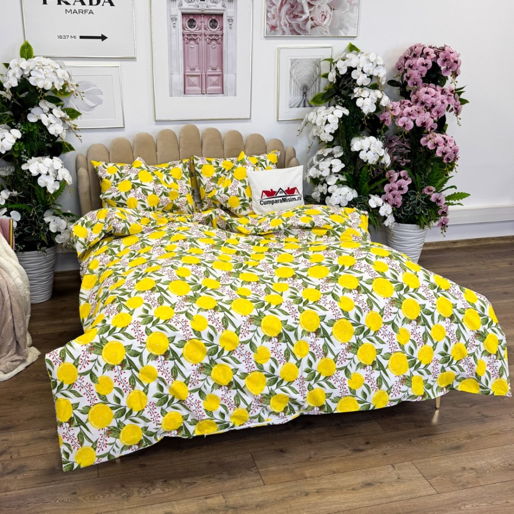 Lenjerie de Pat Dublu, Bumbac Ranforce, 6 piese, Croită cu Grija in Atelierul Cumparamisim - Lux Suprem, Rafinament Desăvârșit, Confort Regal, Alb, Galben, Verde, lămâi si flori, cod produs: CMP-RF08