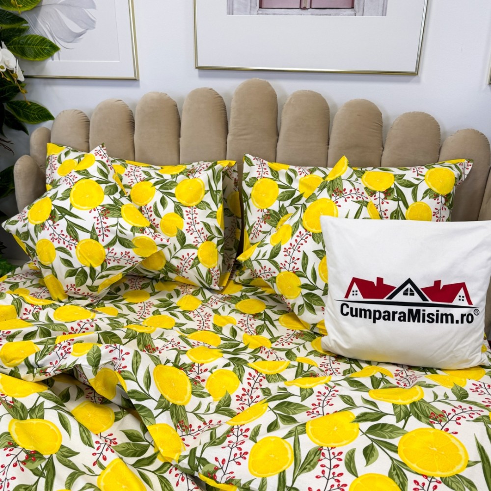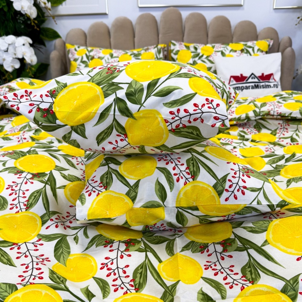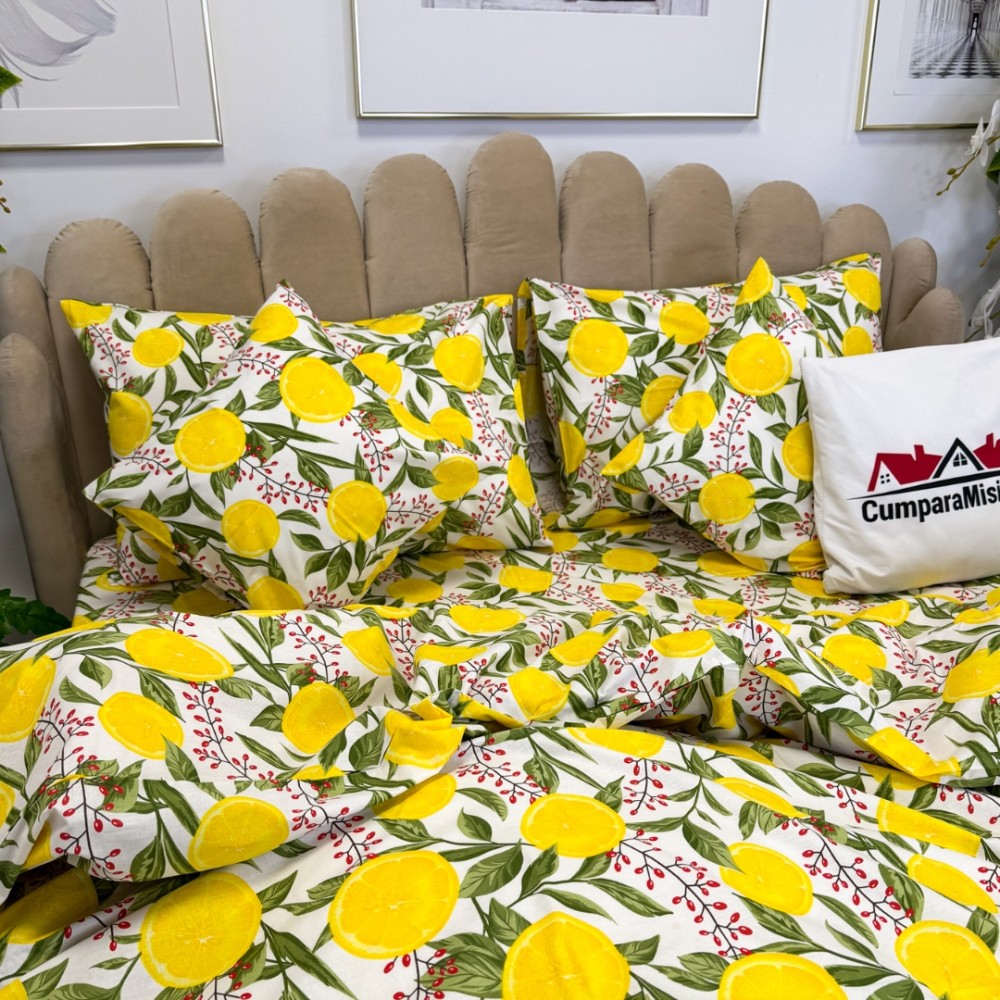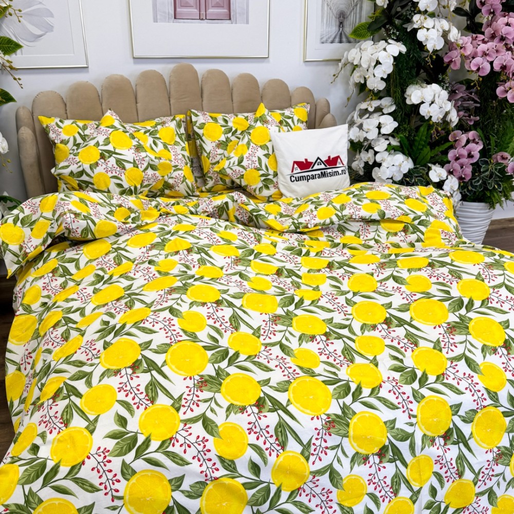 Lenjerie de Pat Dublu, Bumbac Ranforce, 6 piese, Croită cu Grija in Atelierul Cumparamisim - Lux Suprem, Rafinament Desăvârșit, Confort Regal, Alb, Galben, Verde, lămâi si flori, cod produs: CMP-RF08