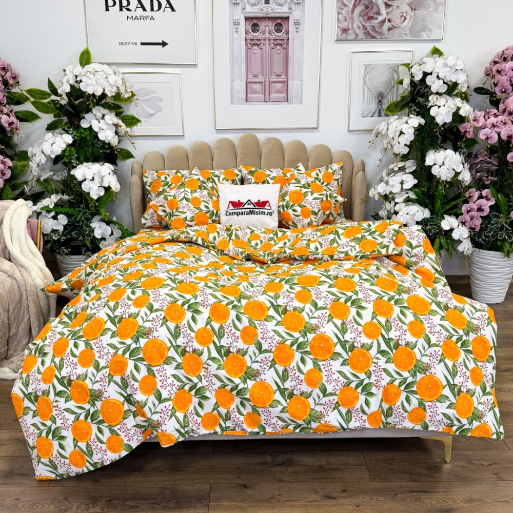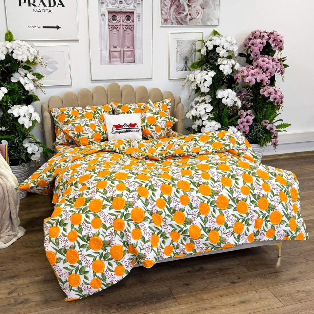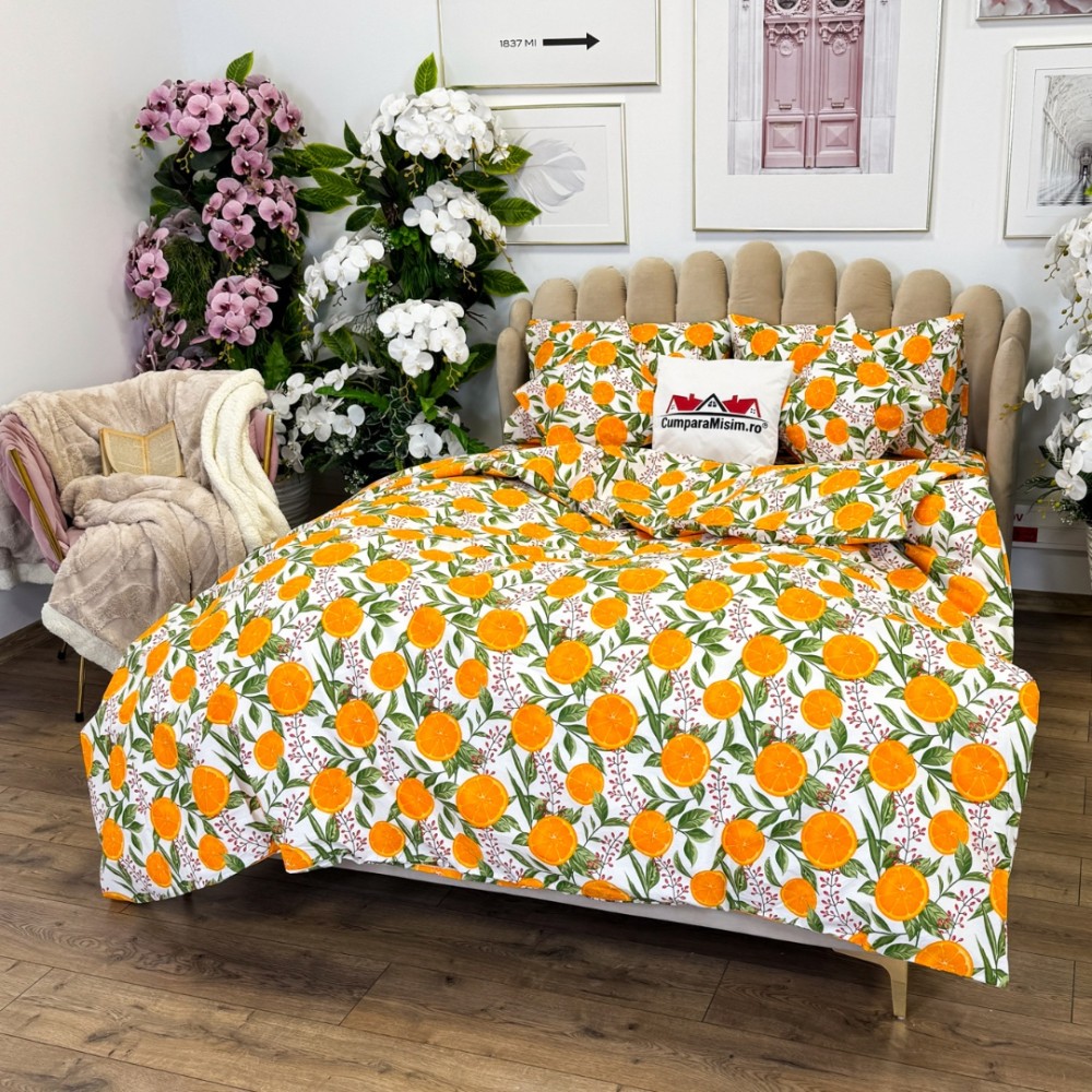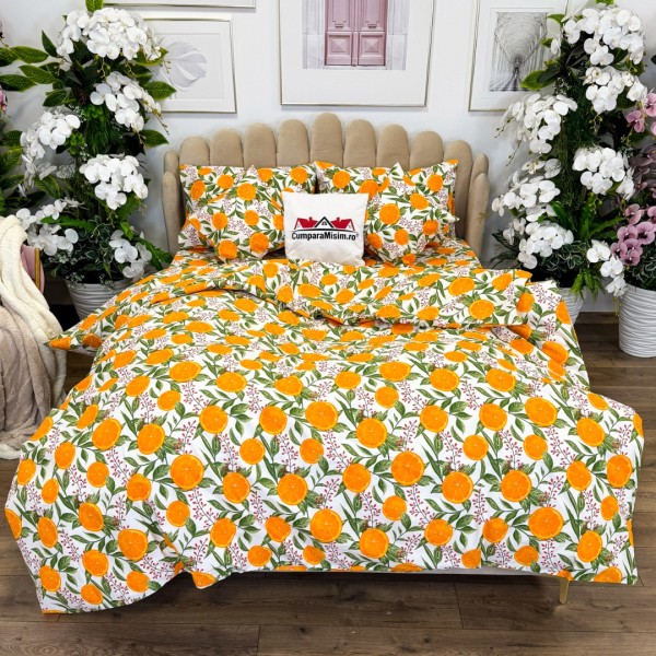 Lenjerie de Pat Dublu, Bumbac Ranforce, 6 piese, Croită cu Grija in Atelierul Cumparamisim - Lux Suprem, Rafinament Desăvârșit, Confort Regal, Alb, Portocaliu, portocale, cod produs: CMP-RF06