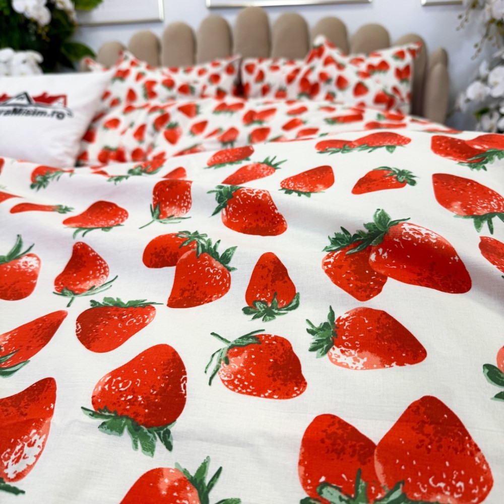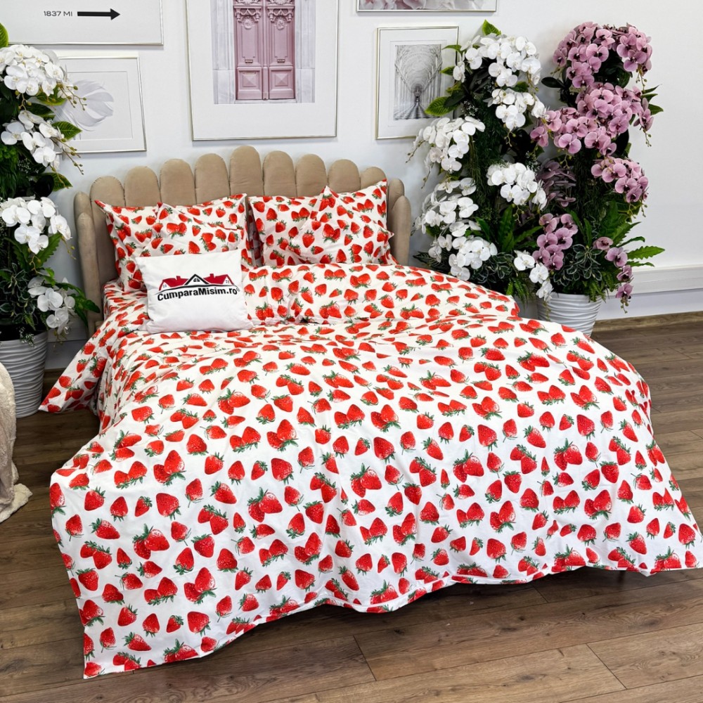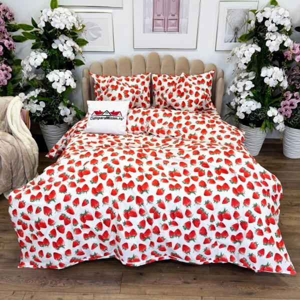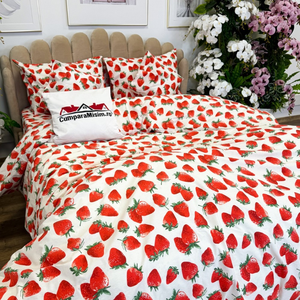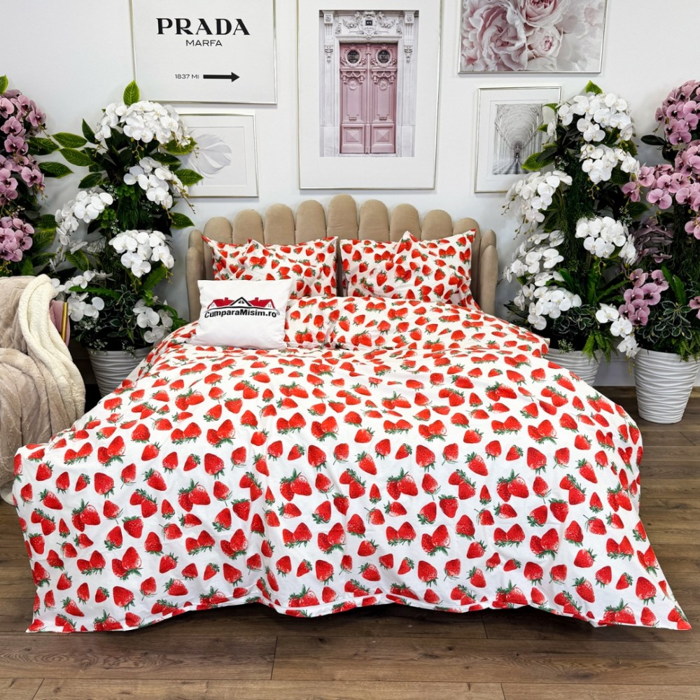 Lenjerie de Pat Dublu, Bumbac Ranforce, 6 piese, Croită cu Grija in Atelierul Cumparamisim - Lux Suprem, Rafinament Desăvârșit, Confort Regal, Alb, Rosu, căpșuni , cod produs: CMP-RF07