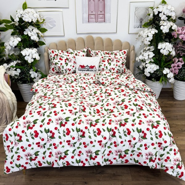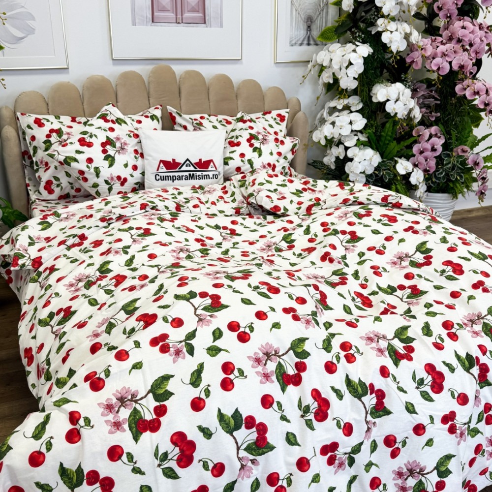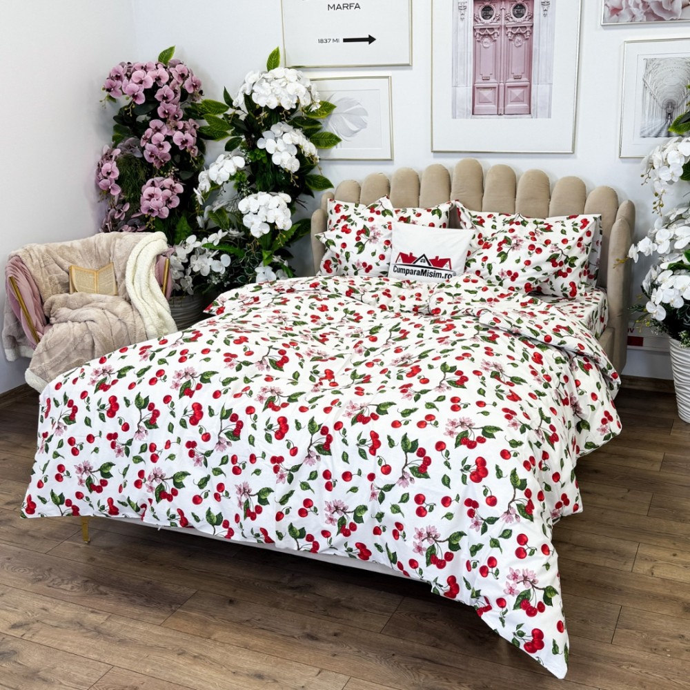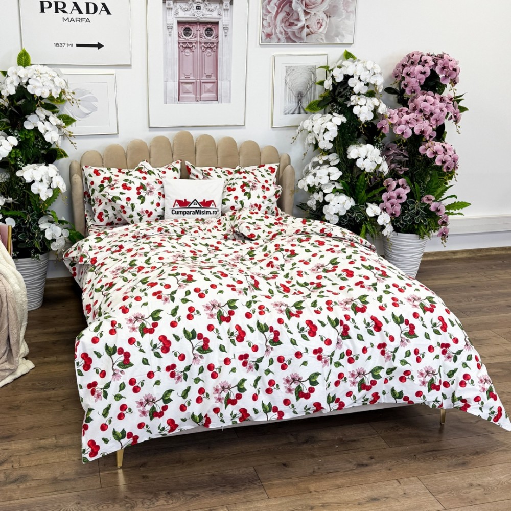 Lenjerie de Pat Dublu, Bumbac Ranforce, 6 piese, Croită cu Grija in Atelierul Cumparamisim - Lux Suprem, Rafinament Desăvârșit, Confort Regal, Alb, Rosu, cireșe si flori de cires, cod produs: CMP-RF05