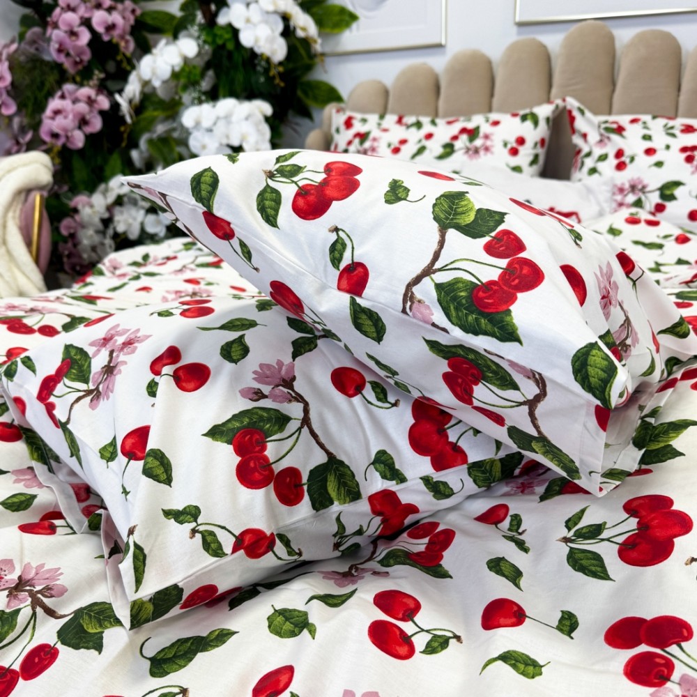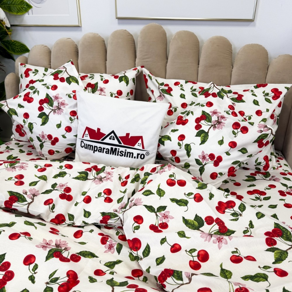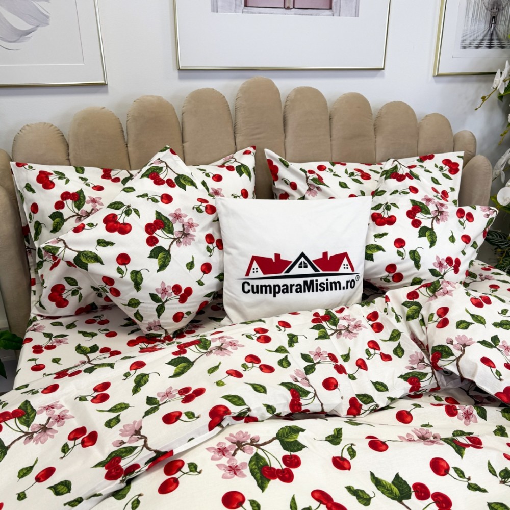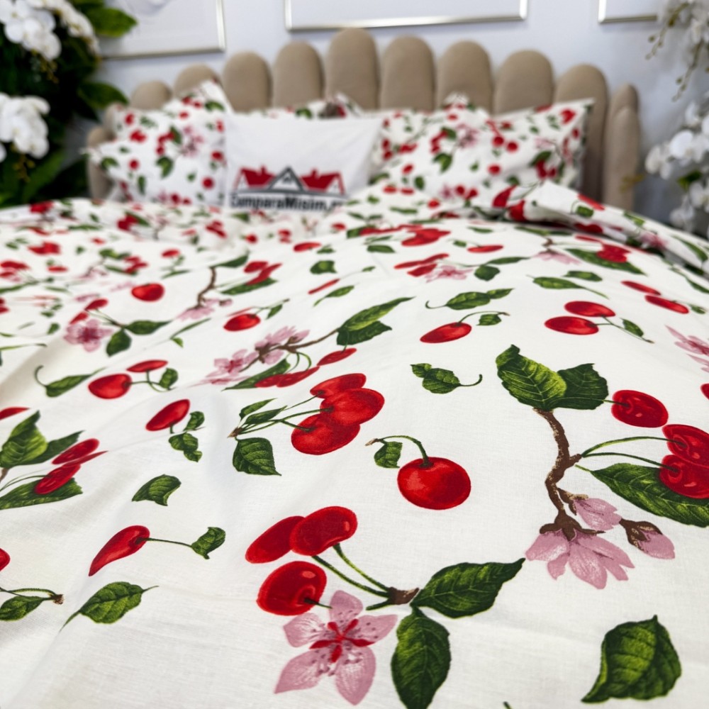 Lenjerie de Pat Dublu, Bumbac Ranforce, 6 piese, Croită cu Grija in Atelierul Cumparamisim - Lux Suprem, Rafinament Desăvârșit, Confort Regal, Alb, Rosu, cireșe si flori de cires, cod produs: CMP-RF05