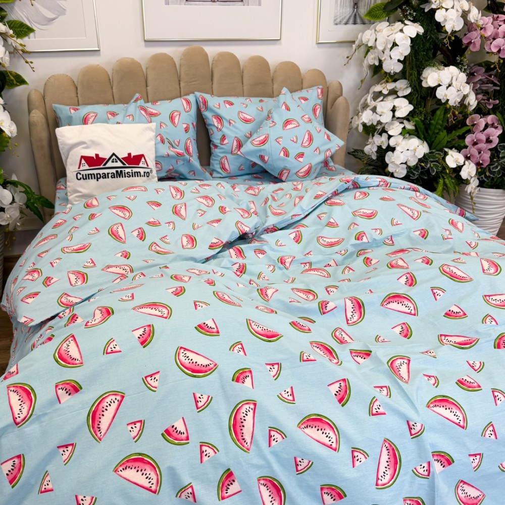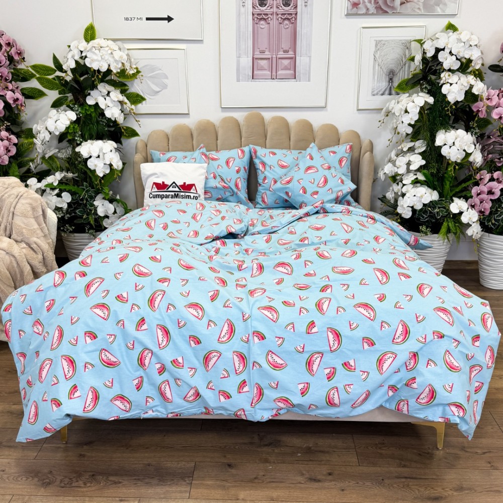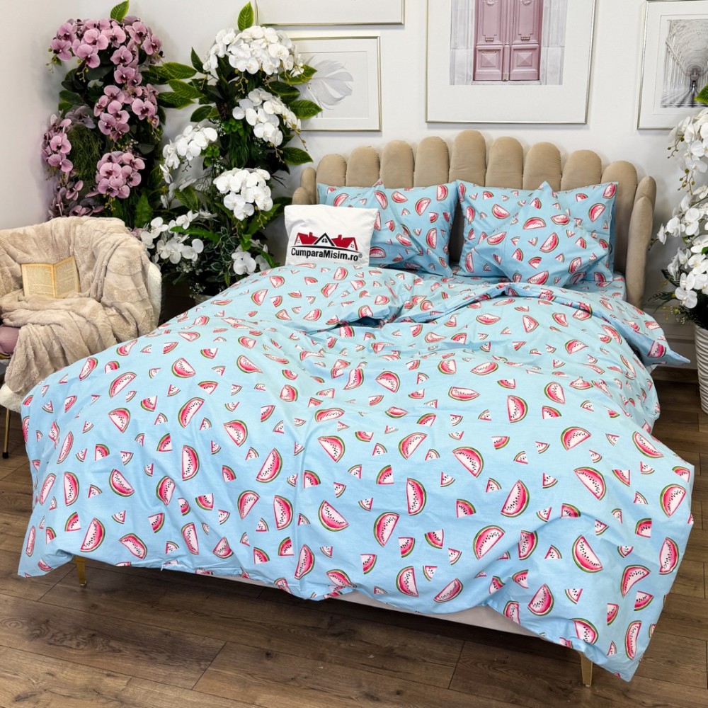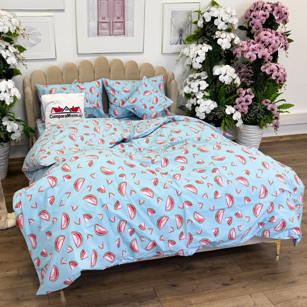Lenjerie de Pat Dublu, Bumbac Ranforce, 6 piese, Croită cu Grija in Atelierul Cumparamisim - Lux Suprem, Rafinament Desăvârșit, Confort Regal, Bleu, Roz, pepene , cod produs: CMP-RF11