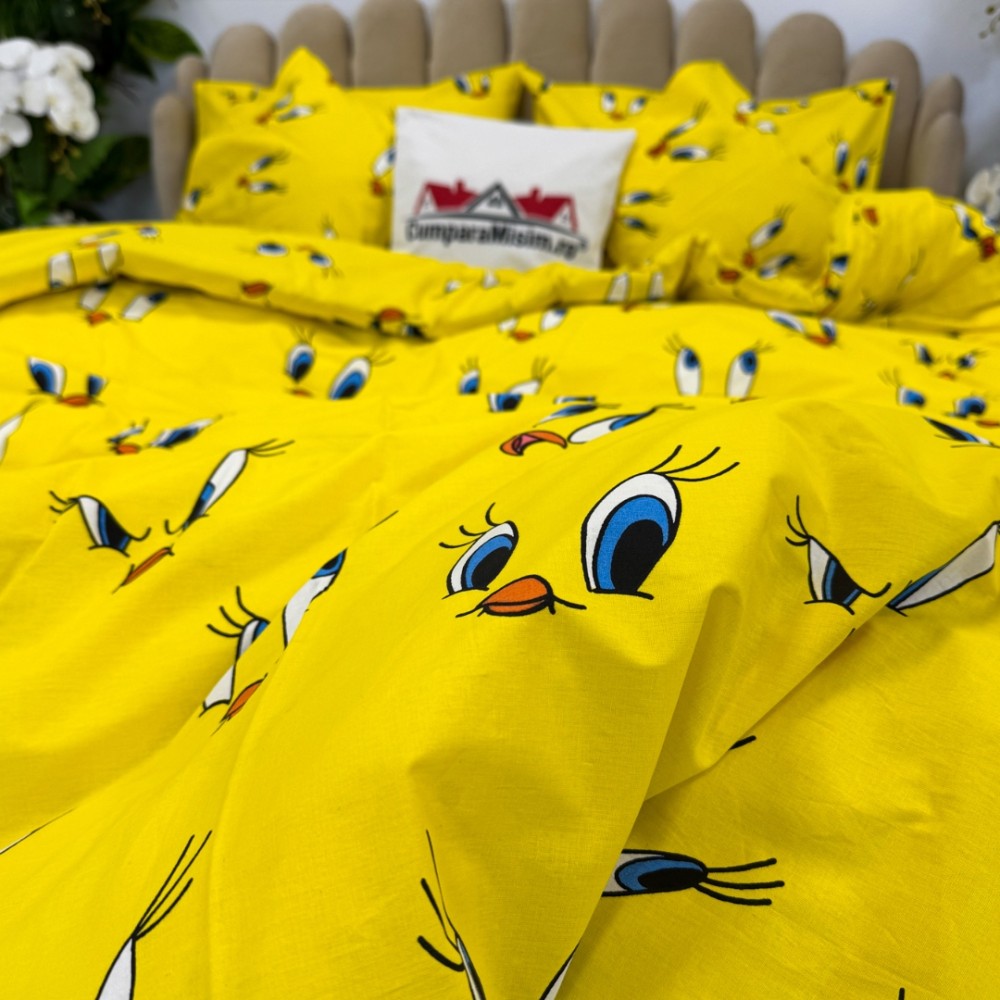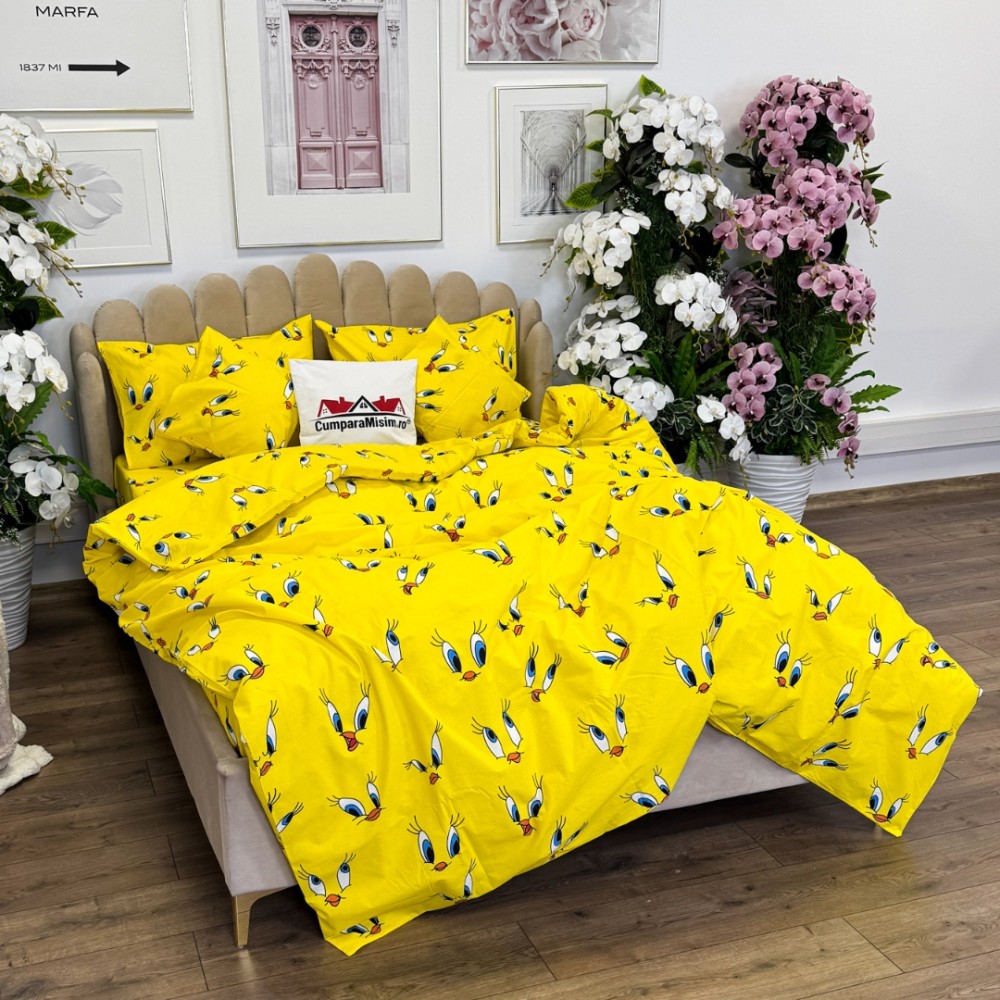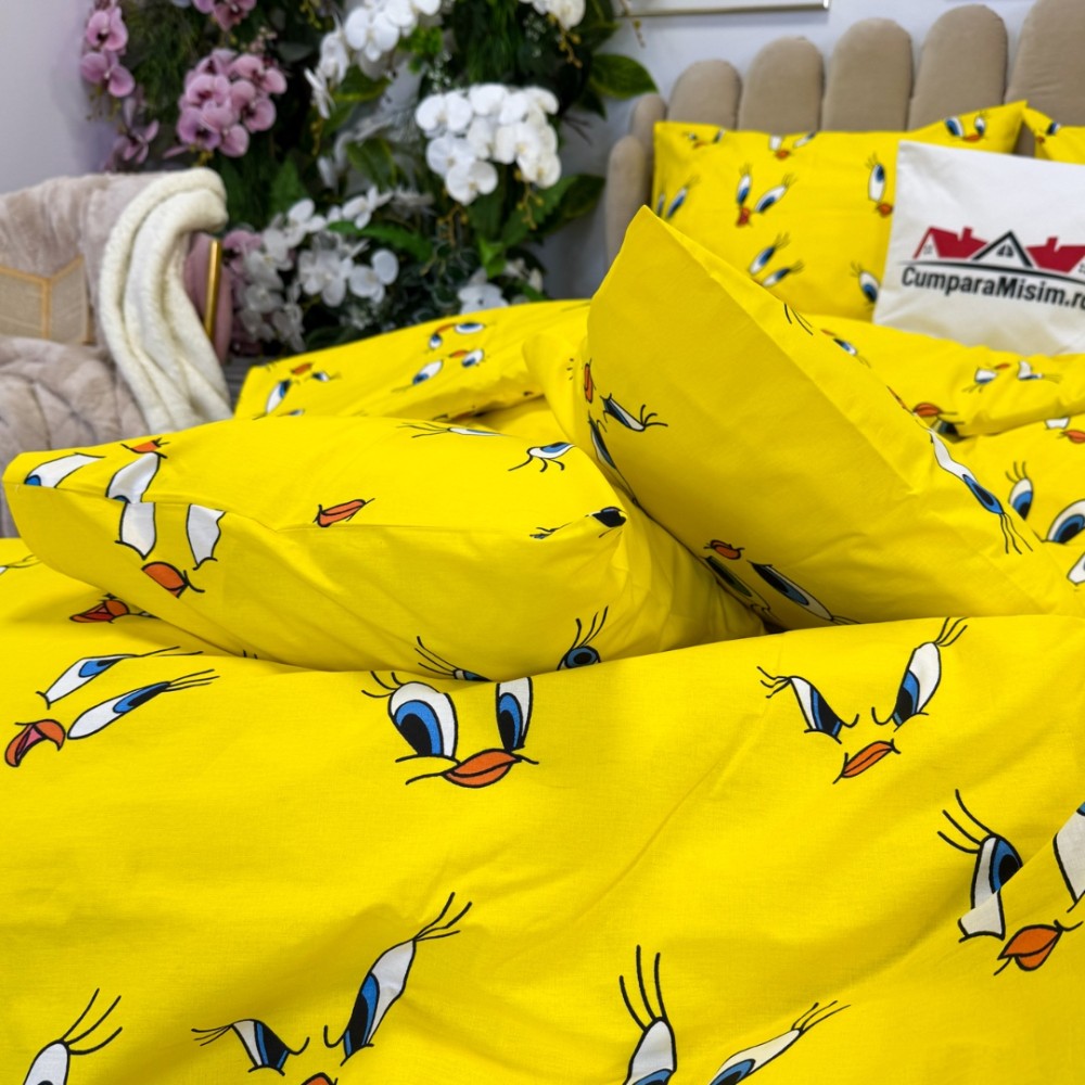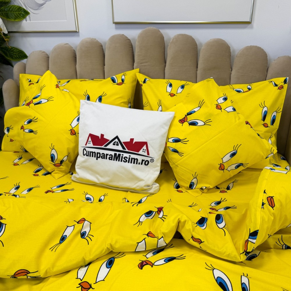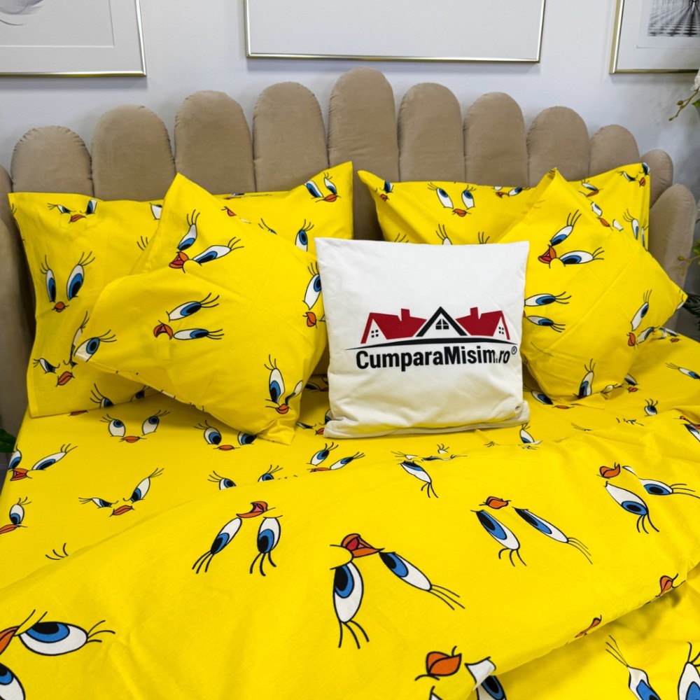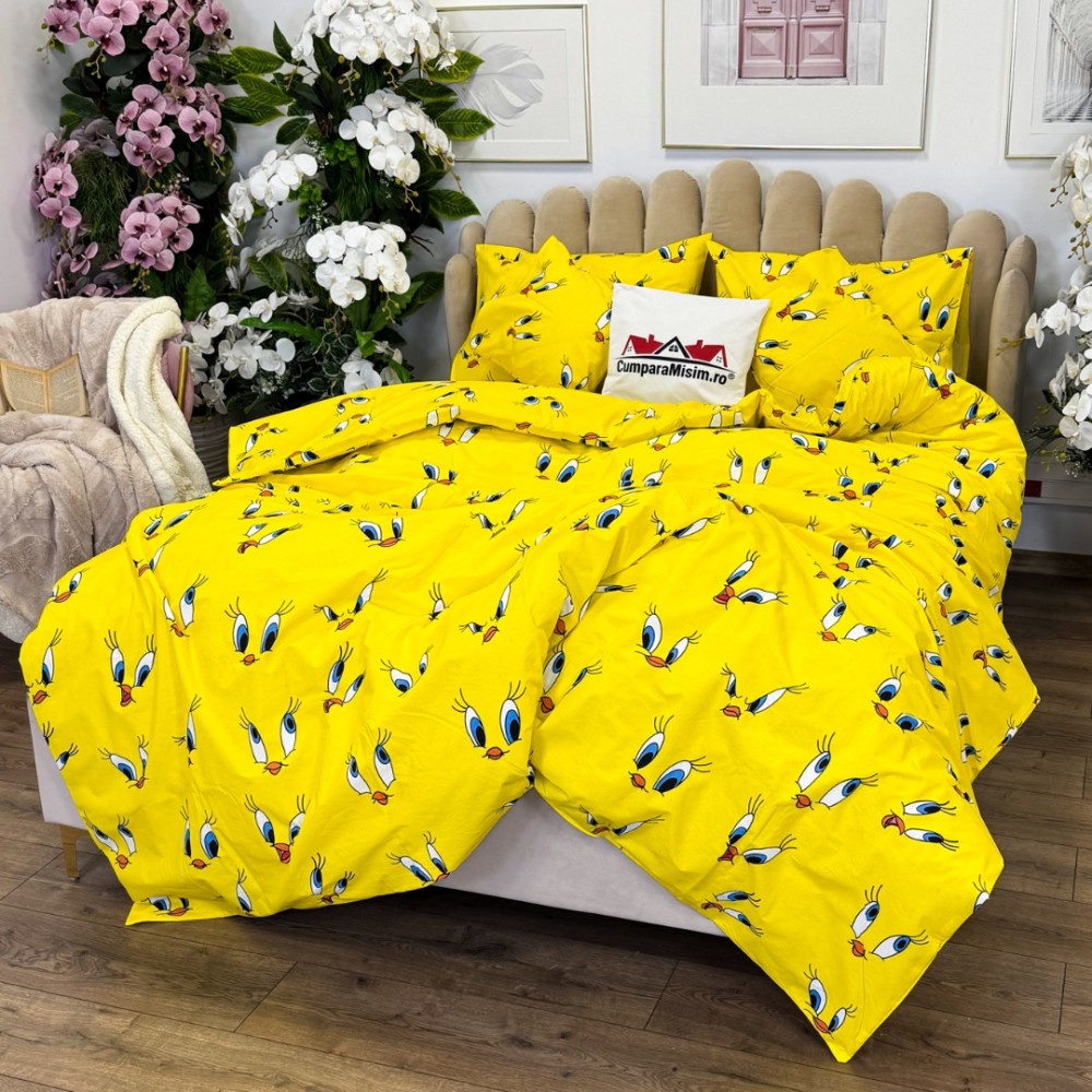 Lenjerie de Pat Dublu, Bumbac Ranforce, 6 piese, Croită cu Grija in Atelierul Cumparamisim - Lux Suprem, Rafinament Desăvârșit, Confort Regal, Galben, Tweety, cod produs: CMP-RF02