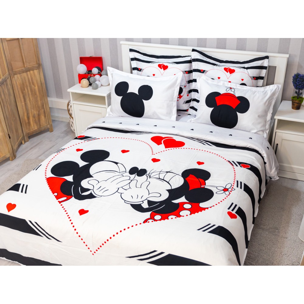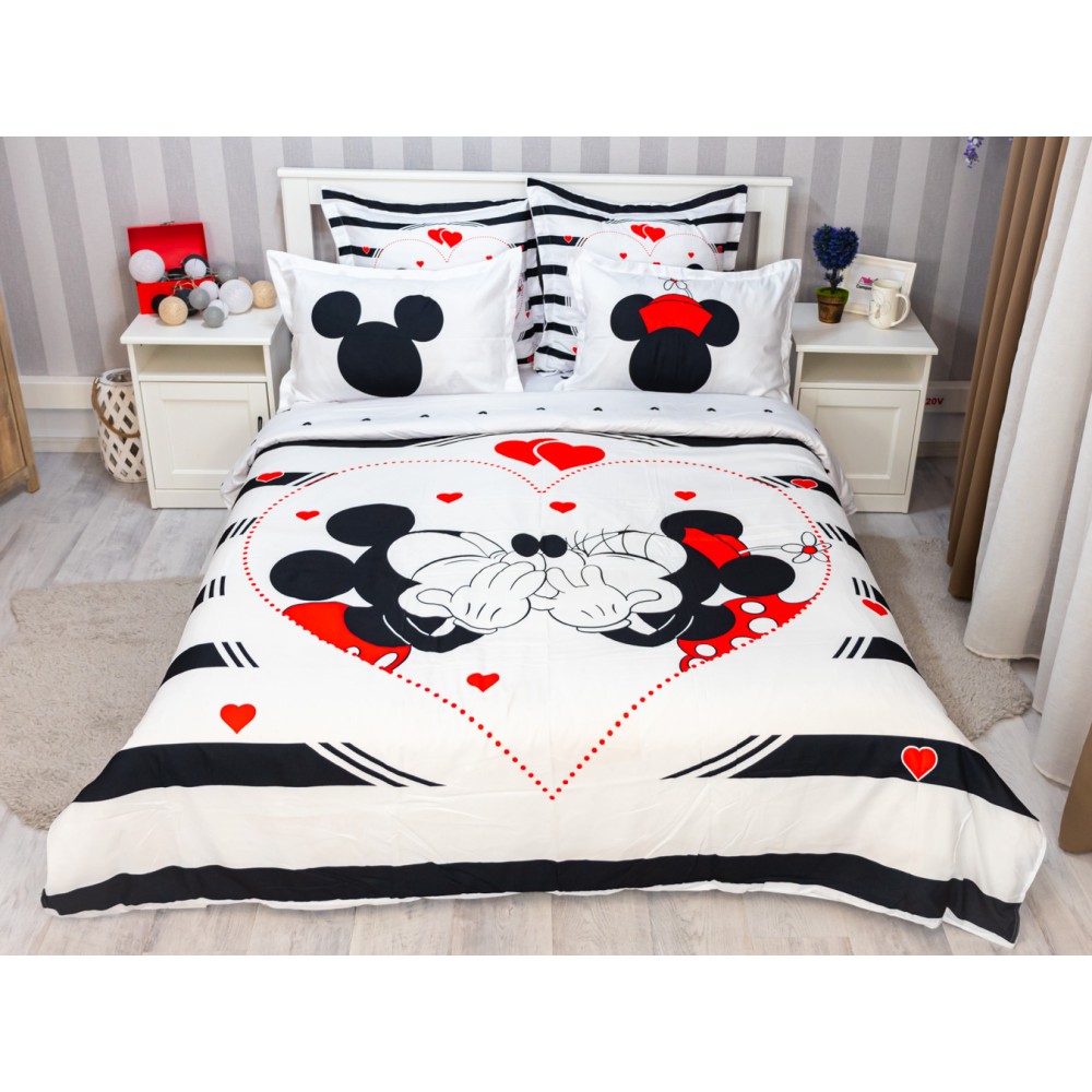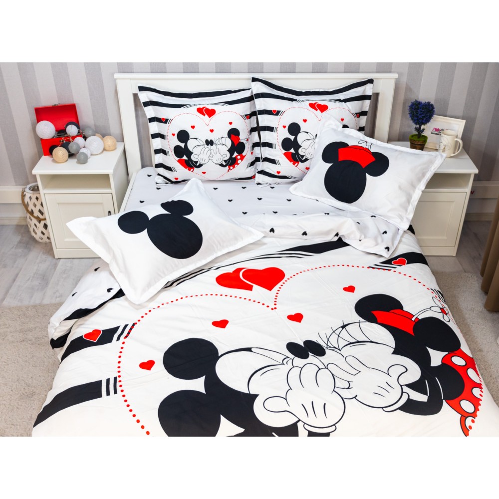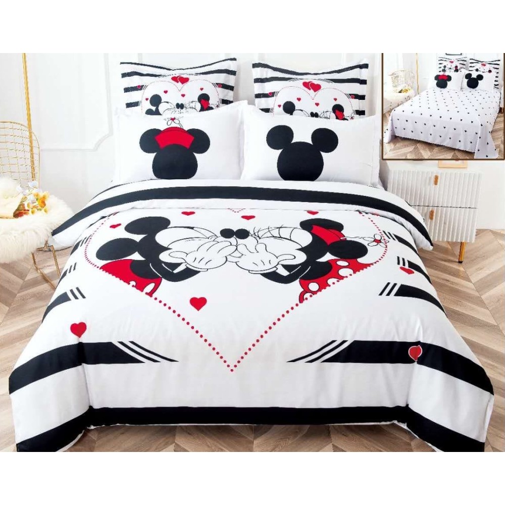 Lenjerie pat dublu, FINET, 6 piese, IDENTICA CU POZA, Alb-Negru, inimioare, Mickey&Minnie, Disney, cod produs: PTF6