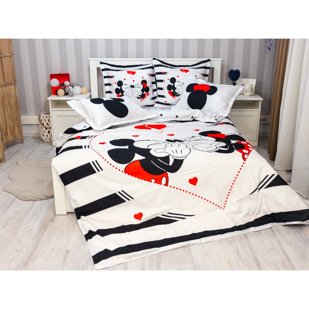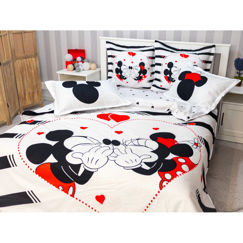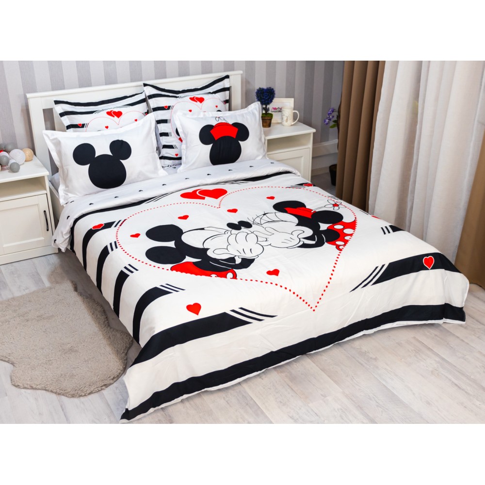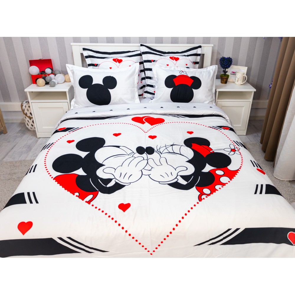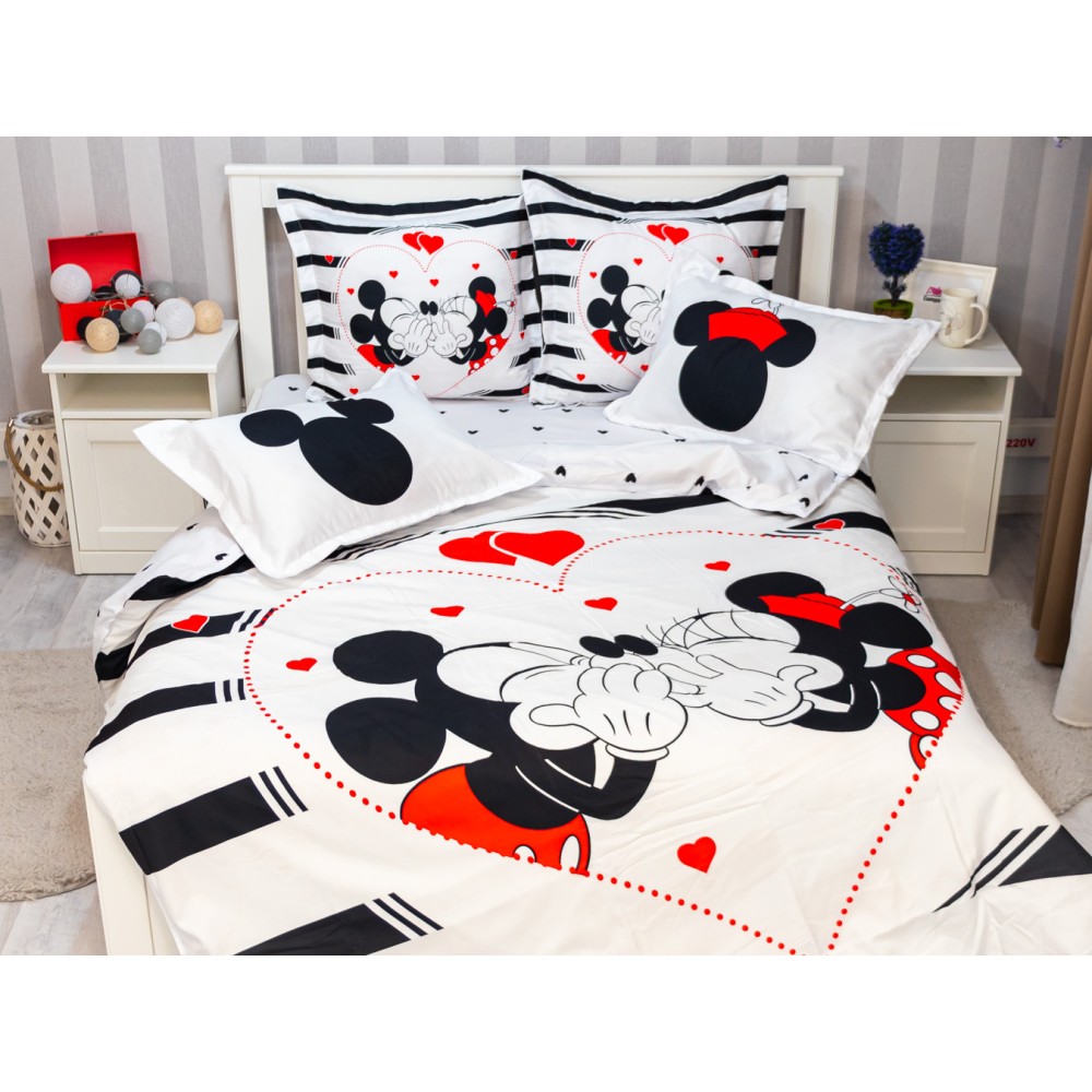 Lenjerie pat dublu, FINET, 6 piese, IDENTICA CU POZA, Alb-Negru, inimioare, Mickey&Minnie, Disney, cod produs: PTF6