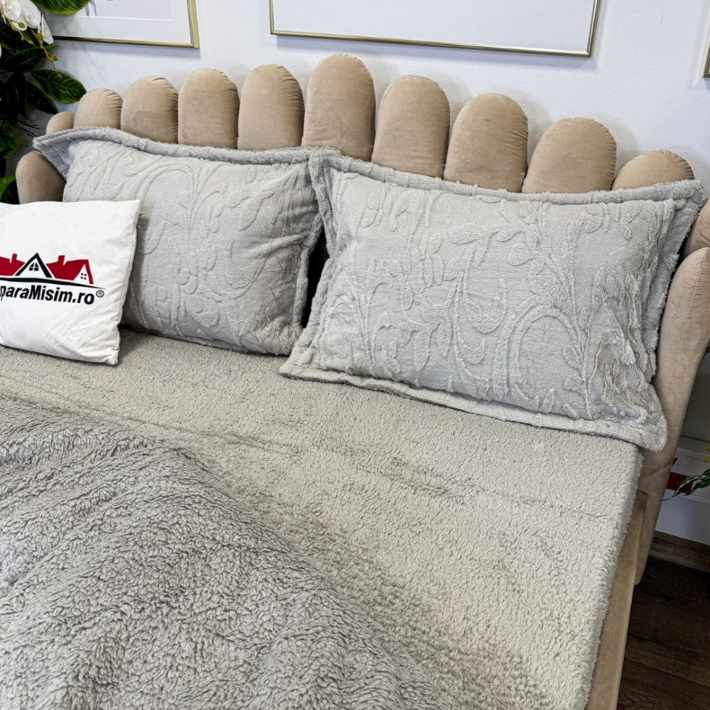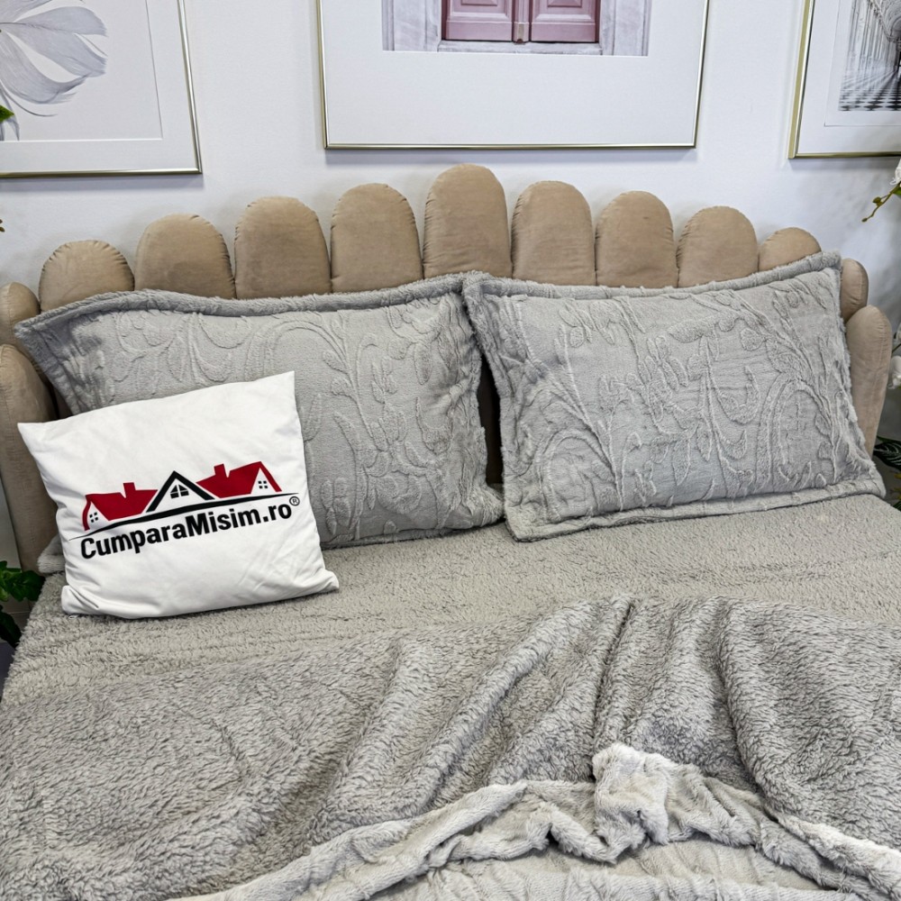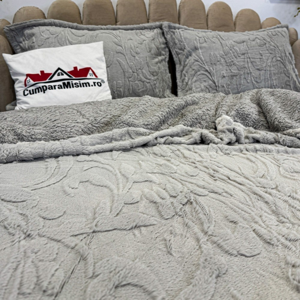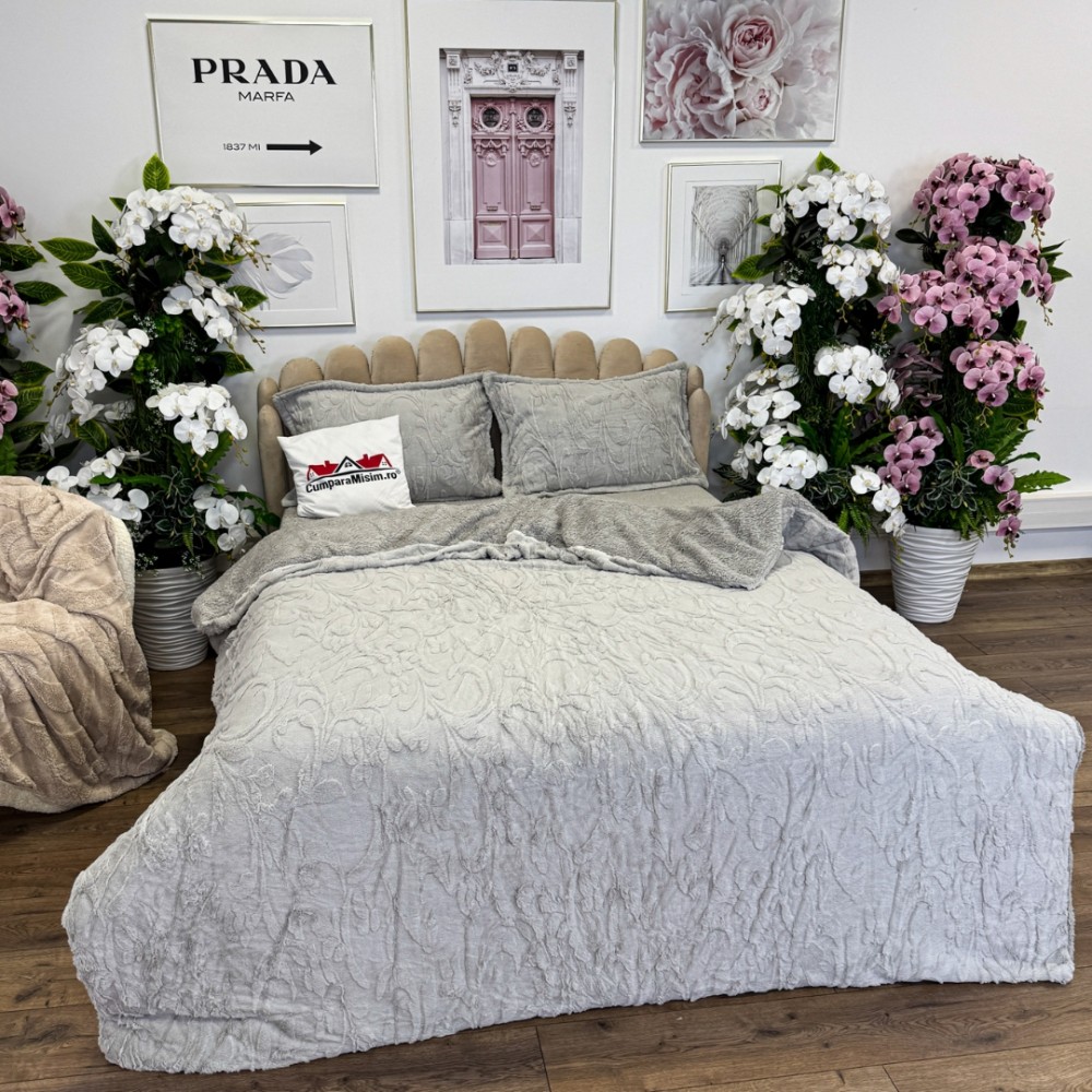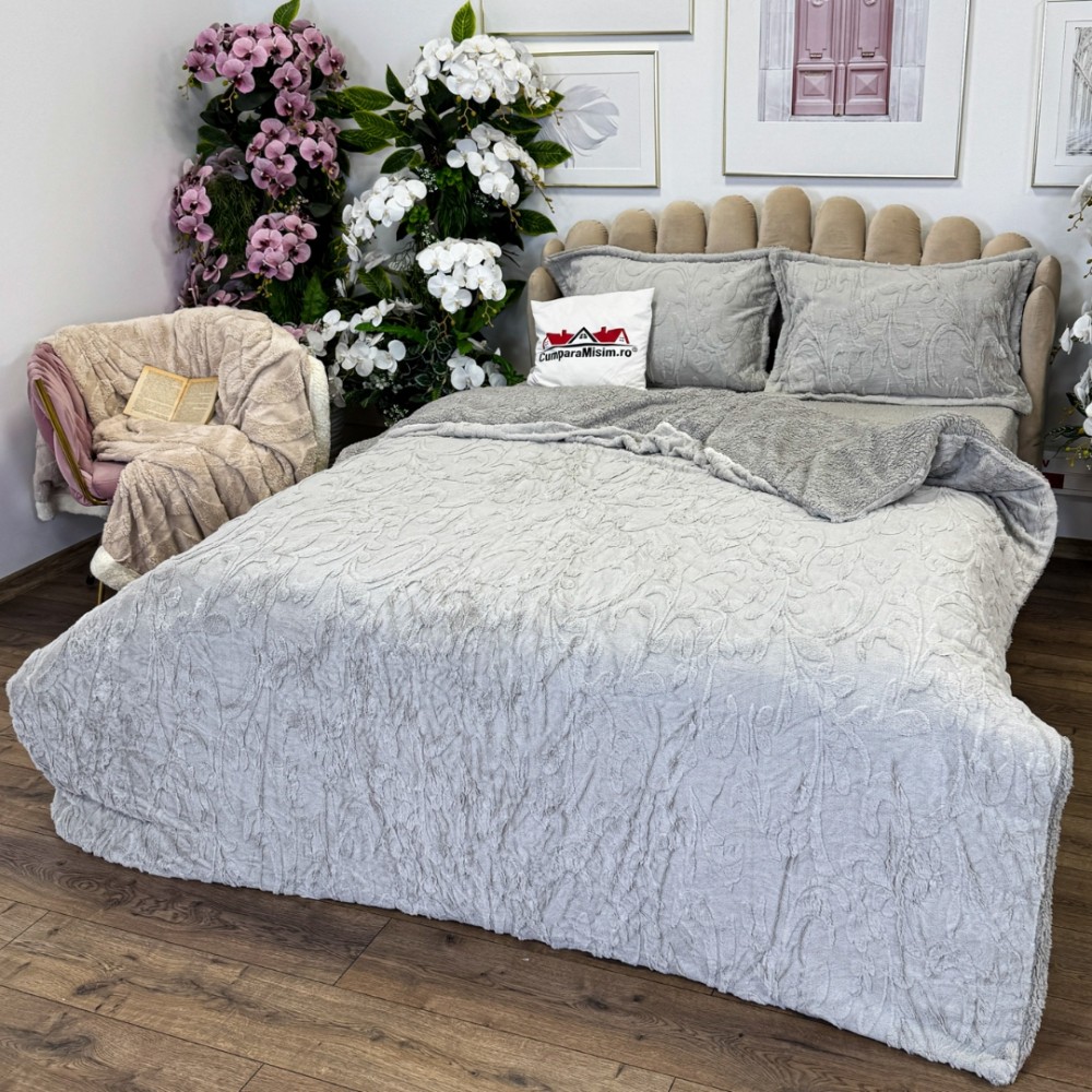 Lenjerie de pat dublu, Luxoasă și Super Pufoasă CoCoLiNo 3D, cu Blăniță Sherpa, 4 Piese, Cearșaf cu Elastic – Microfibră Plusată, Căldură și Stil pentru Dormitorul Tău, Floral print, Gri deschis, Casa Minunata, cod produs: INS-CC05