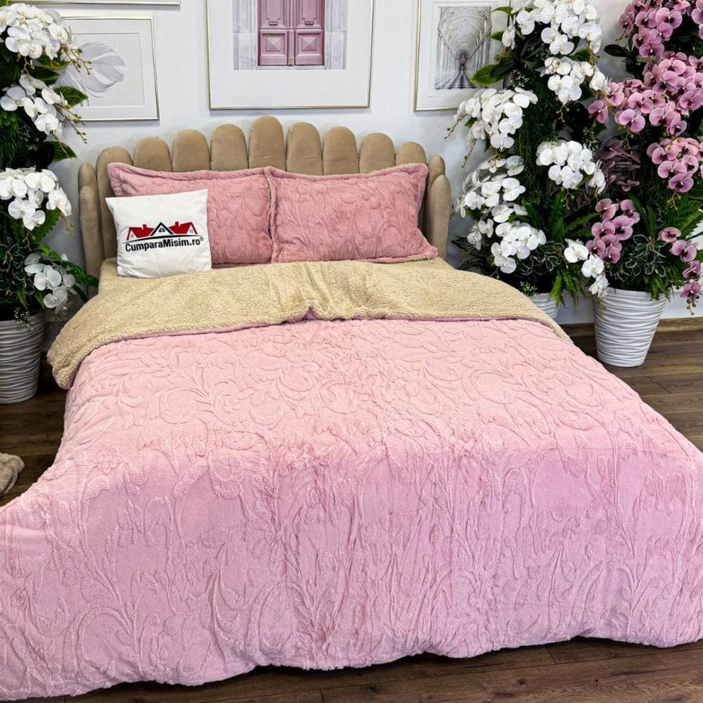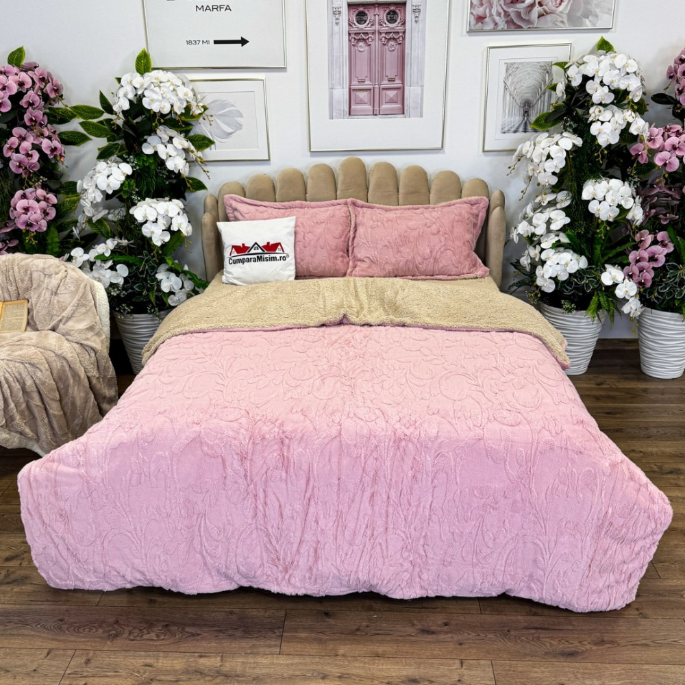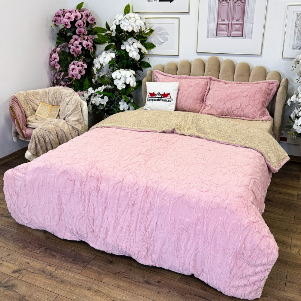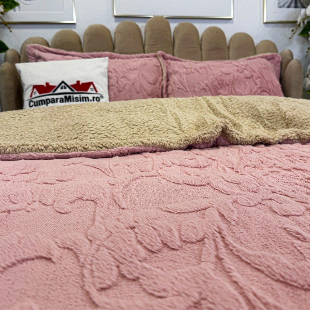 Lenjerie de pat dublu, Luxoasă și Super Pufoasă CoCoLiNo 3D, cu Blăniță Sherpa, 4 Piese, Cearșaf cu Elastic – Microfibră Plusată, Căldură și Stil pentru Dormitorul Tău, Floral print, Roz, Casa Minunata, cod produs: INS-CC03