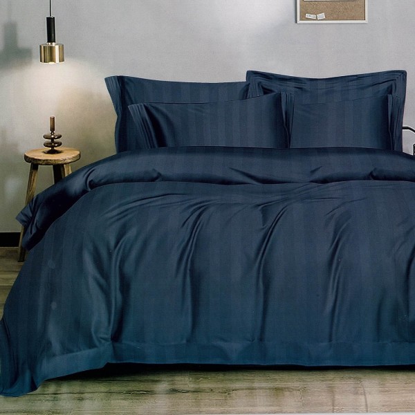 Lenjerie HoReCa DeLuxe, pat dublu, Damasc cu Dunga latã de 3cm, 6 piese, cearșaf cu ELASTIC, Bleumarin, JOJO Home, cod produs: DKE50
