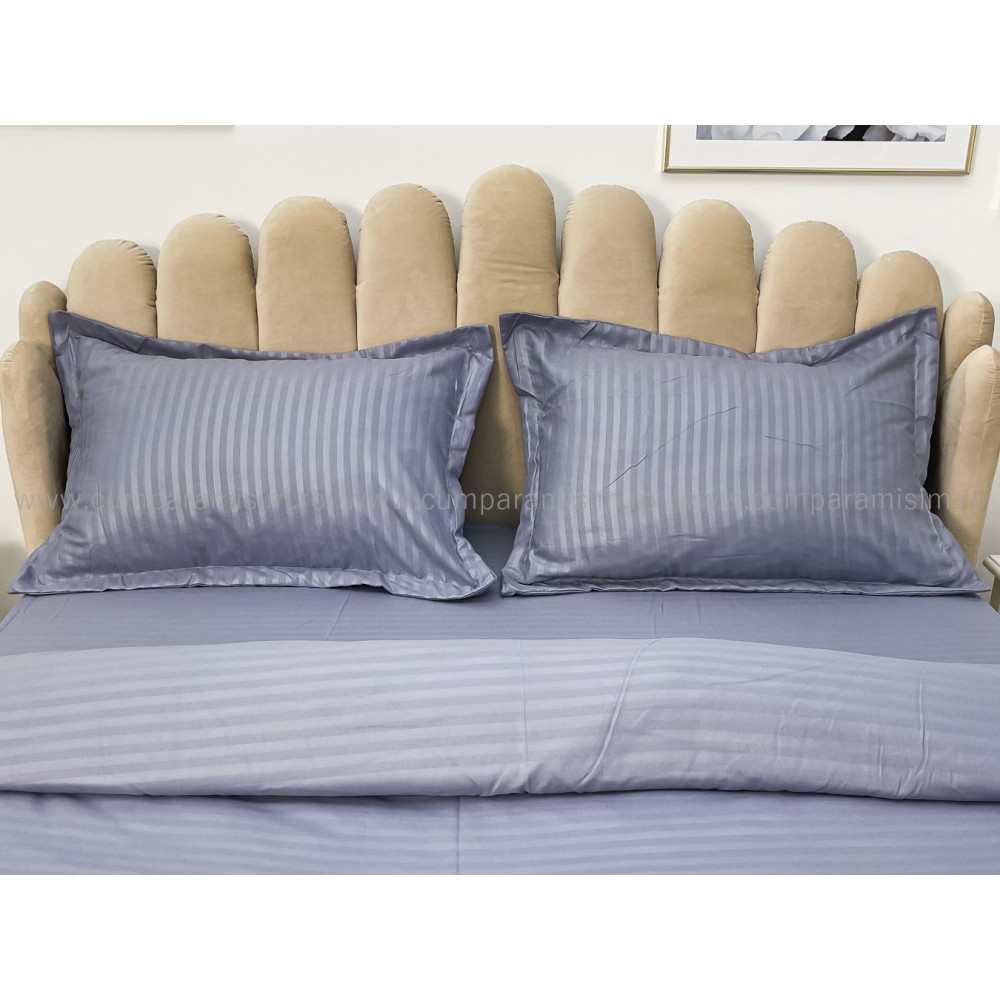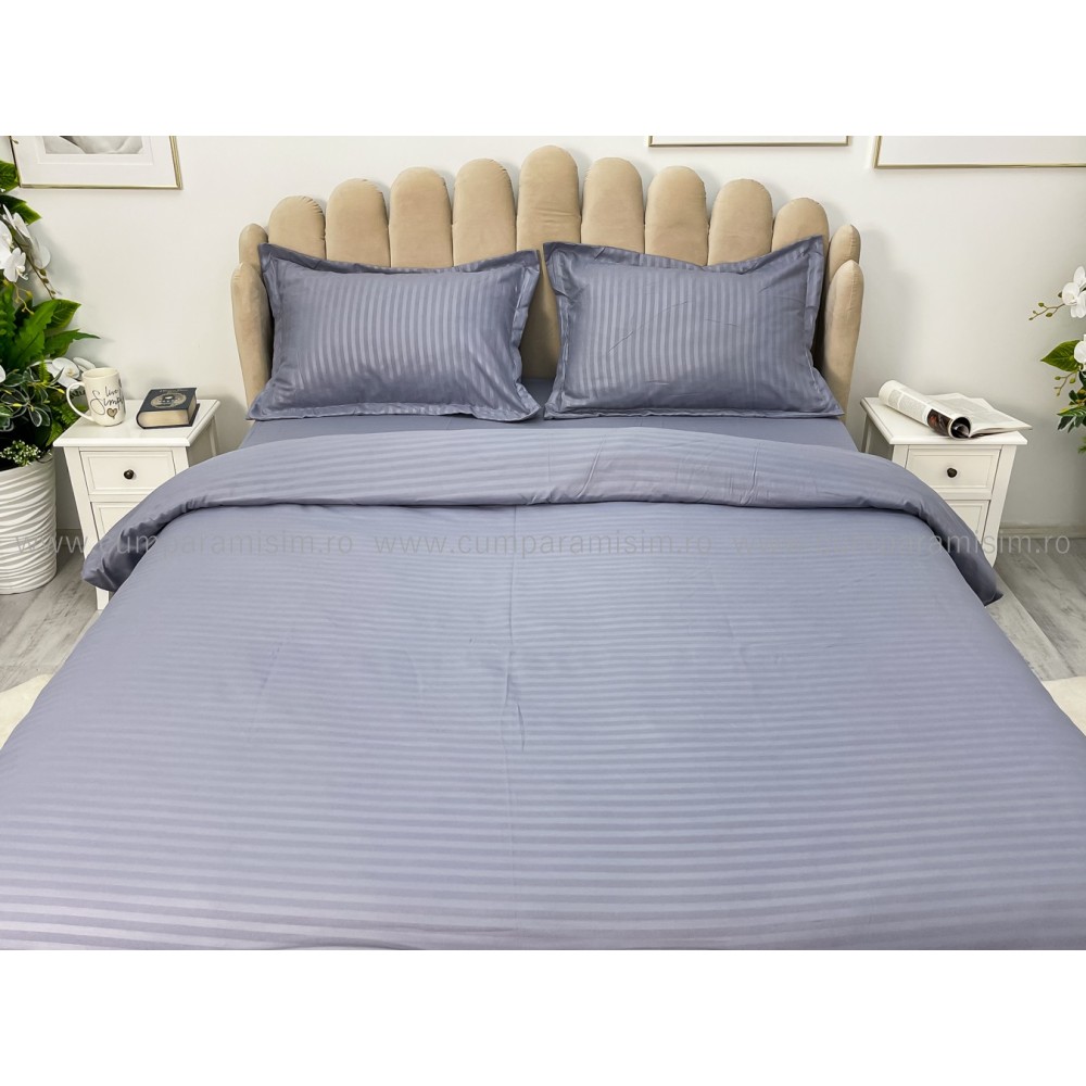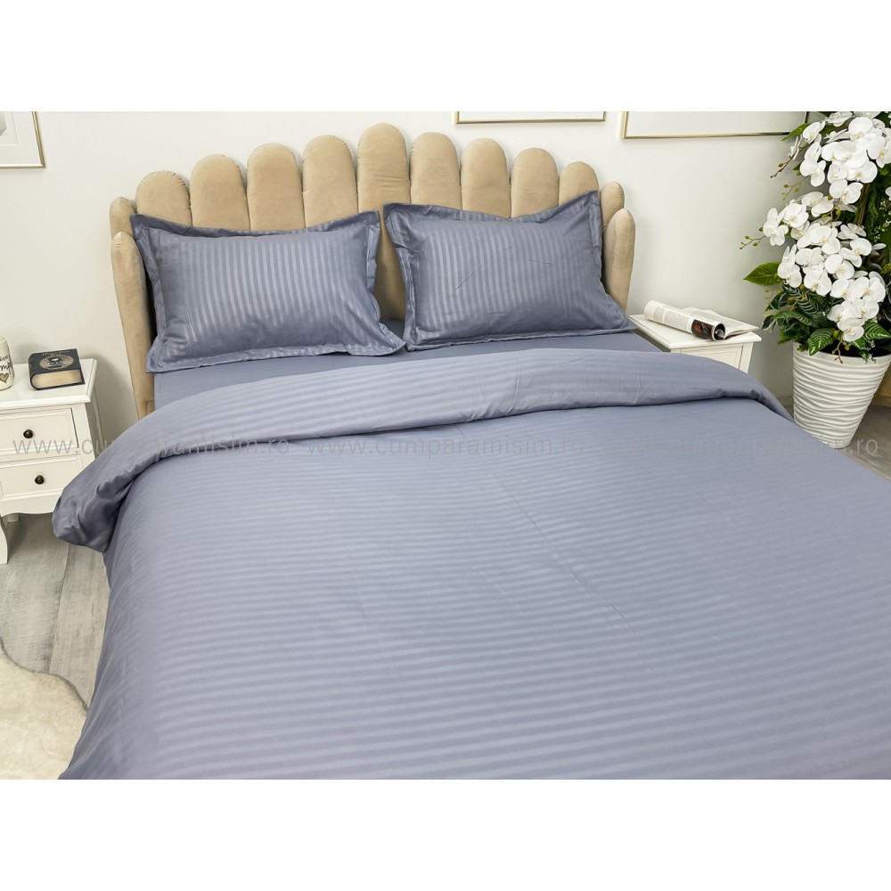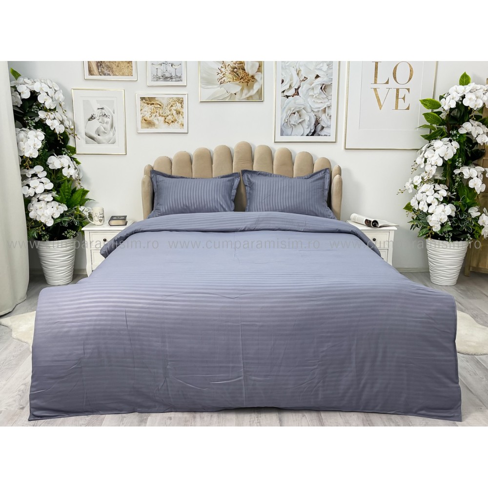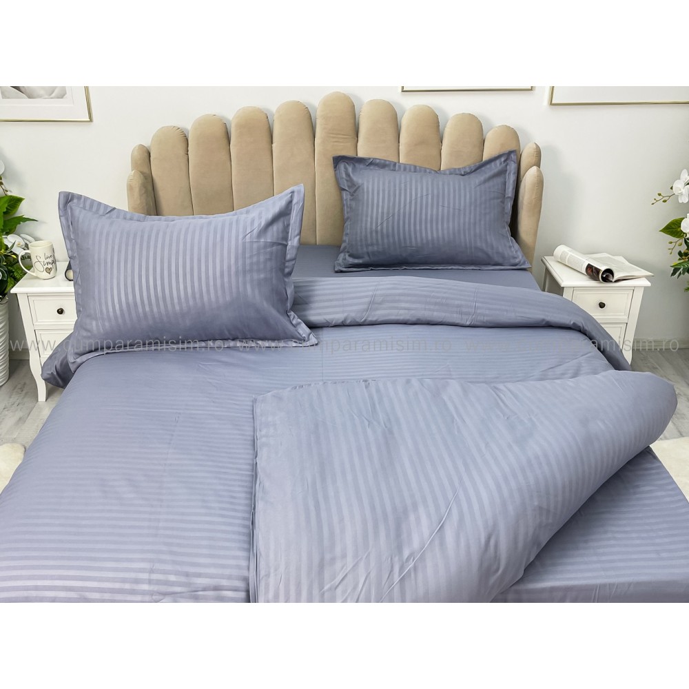 Lenjerie de pat dublu din damasc finetat, linear (tesatura din fabrica, ci nu imprimata, cu dunga de 1 cm grosime), confectionata din bumbac 70% + 30% poliester, cu 4 piese, folosita cel mai mult in regimul hotelier, datorita simplitatii si calitatii extraordinare. Materialul are un aspect usor lucios pentru o nota de eleganta si rafinament, datorita tesaturii speciale. Damascul este recunoscut pentru rezistenta sa in timp la nenumarate spalari, nemodificandu-si aspectul.