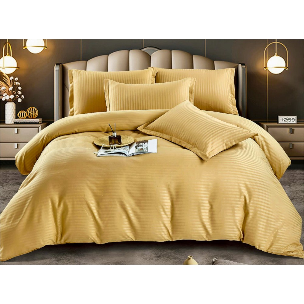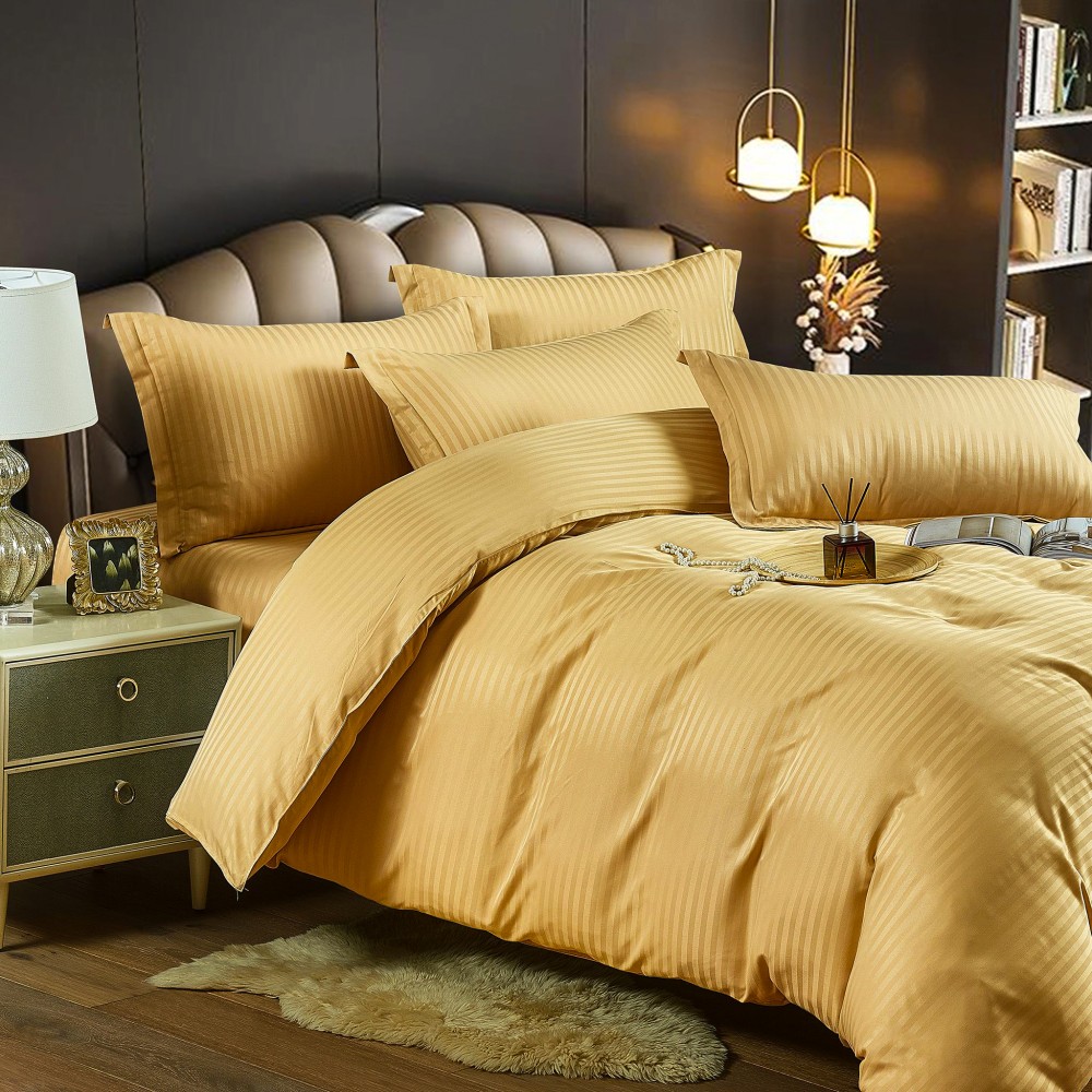 Lenjerie de pat dublu din damasc finetat, linear (tesatura din fabrica, ci nu imprimata, cu dunga de 1 cm grosime), confectionata din bumbac 70% + 30% poliester, cu 6 piese, folosita cel mai mult in regimul hotelier, datorita simplitatii si calitatii extraordinare. Materialul are un aspect usor lucios pentru o nota de eleganta si rafinament, datorita tesaturii speciale. Damascul este recunoscut pentru rezistenta sa in timp la nenumarate spalari, nemodificandu-si aspectul.