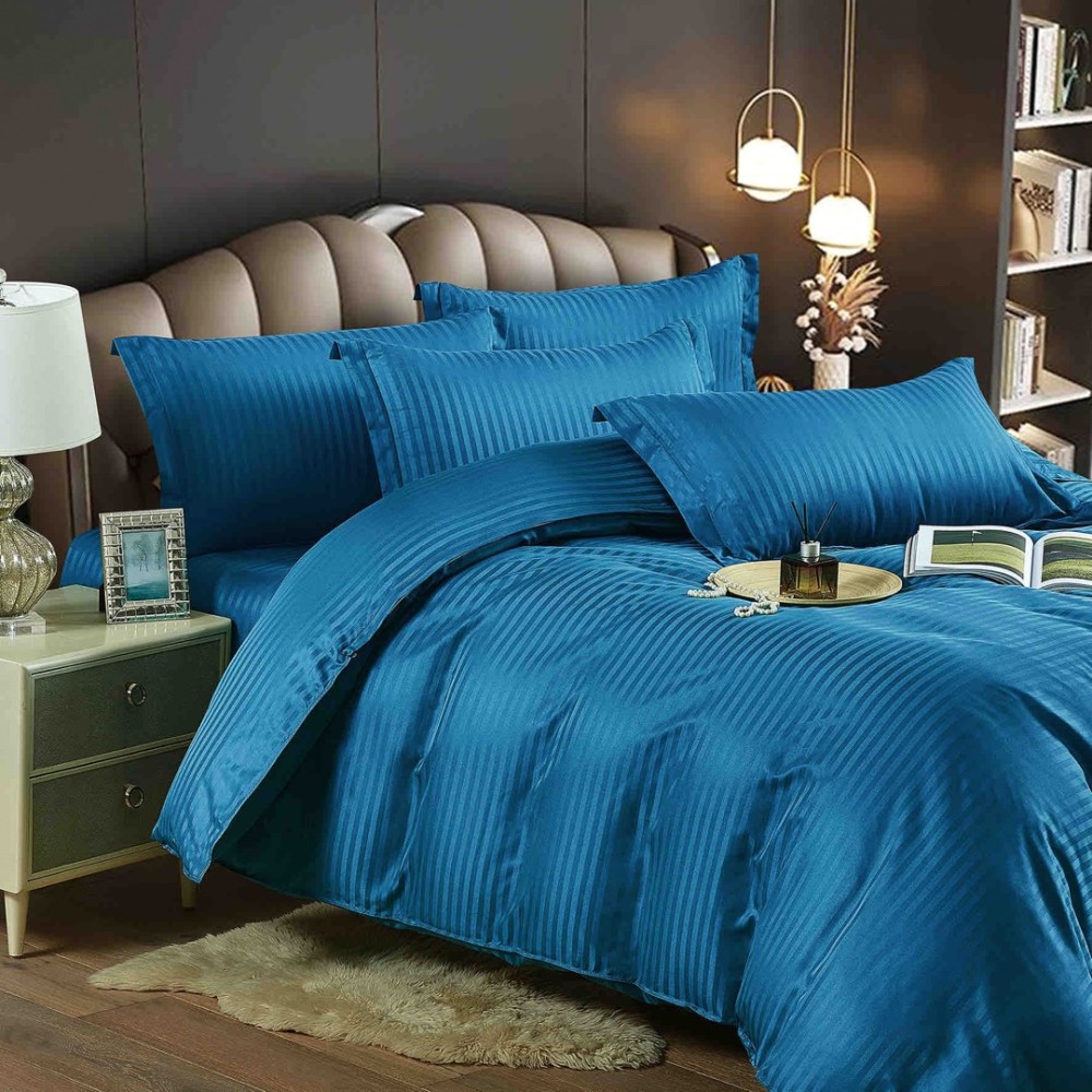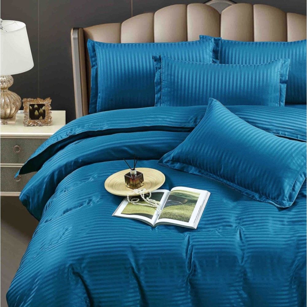 Lenjerie de pat dublu din damasc finetat, linear (tesatura din fabrica, ci nu imprimata, cu dunga de 1 cm grosime), confectionata din bumbac 70% + 30% poliester, cu 6 piese, folosita cel mai mult in regimul hotelier, datorita simplitatii si calitatii extraordinare. Materialul are un aspect usor lucios pentru o nota de eleganta si rafinament, datorita tesaturii speciale. Damascul este recunoscut pentru rezistenta sa in timp la nenumarate spalari, nemodificandu-si aspectul.