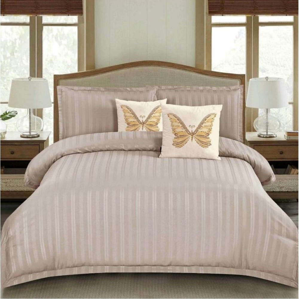 Lenjerie de pat dublu din damasc satinat, linear (tesatura din fabrica, ci nu imprimata, cu dunga de 1 cm grosime), confectionata din bumbac 70% + 30% poliester, cu 4 piese, folosita cel mai mult in regimul hotelier, datorita simplitatii si calitatii extraordinare. Materialul are un aspect usor lucios pentru o nota de eleganta si rafinament, datorita tesaturii speciale. Damascul este recunoscut pentru rezistenta sa in timp la nenumarate spalari, nemodificandu-si aspectul.