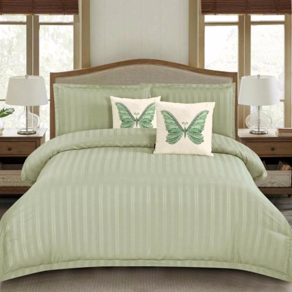 Lenjerie de pat dublu din damasc satinat, linear (tesatura din fabrica, ci nu imprimata, cu dunga de 1 cm grosime), confectionata din bumbac 70% + 30% poliester, cu 4 piese, folosita cel mai mult in regimul hotelier, datorita simplitatii si calitatii extraordinare. Materialul are un aspect usor lucios pentru o nota de eleganta si rafinament, datorita tesaturii speciale. Damascul este recunoscut pentru rezistenta sa in timp la nenumarate spalari, nemodificandu-si aspectul.