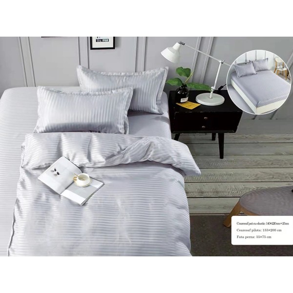 Lenjerie de pat single din damasc linear (tesatura din fabrica, ci nu imprimata, cu dunga de 1 cm grosime), confectionata din bumbac 70% + 30% poliester, cu 4 piese, folosita cel mai mult in regimul hotelier, datorita simplitatii si calitatii extraordinare. Materialul are un aspect usor lucios pentru o nota de eleganta si rafinament, datorita tesaturii speciale. Damascul este recunoscut pentru rezistenta sa in timp la nenumarate spalari, nemodificandu-si aspectul.