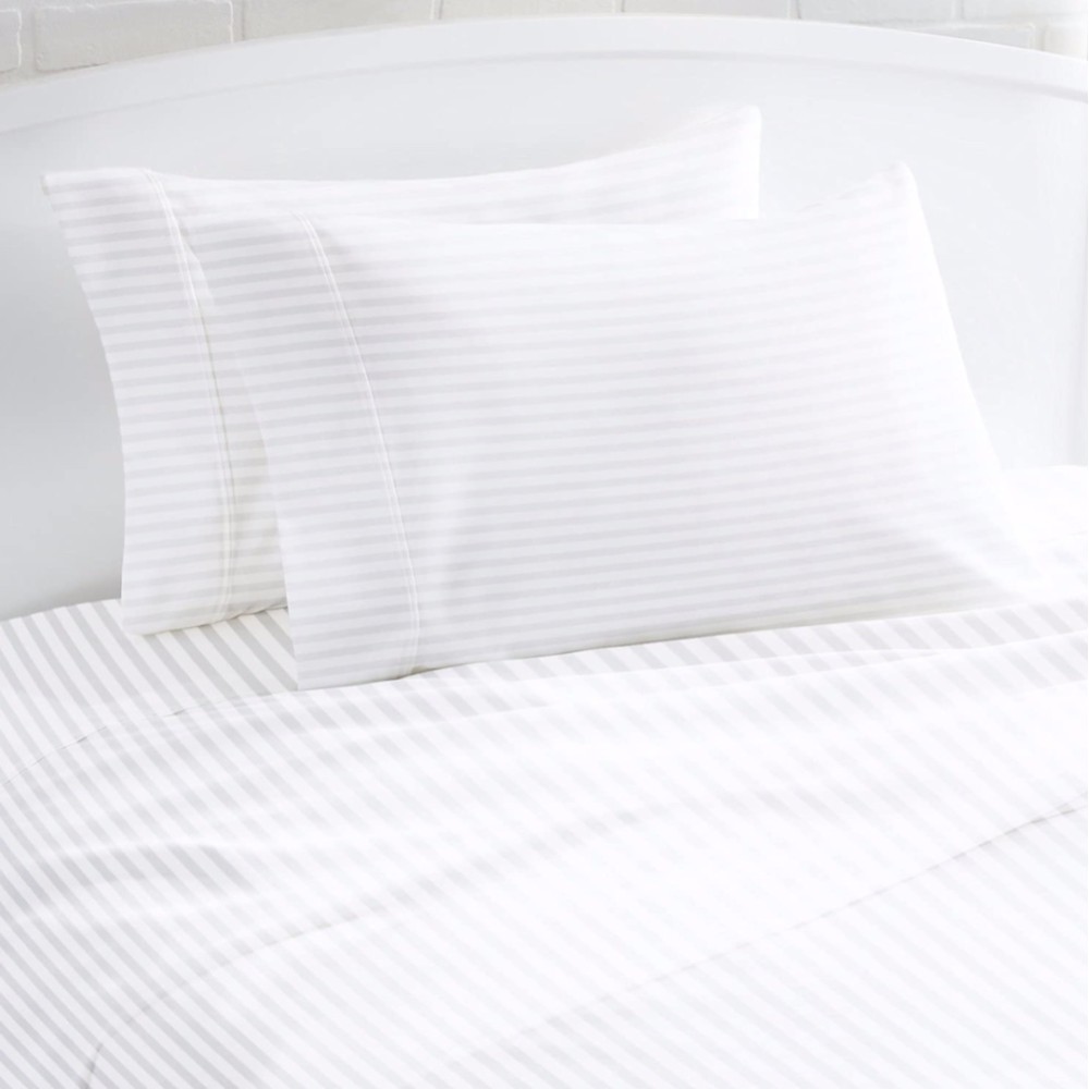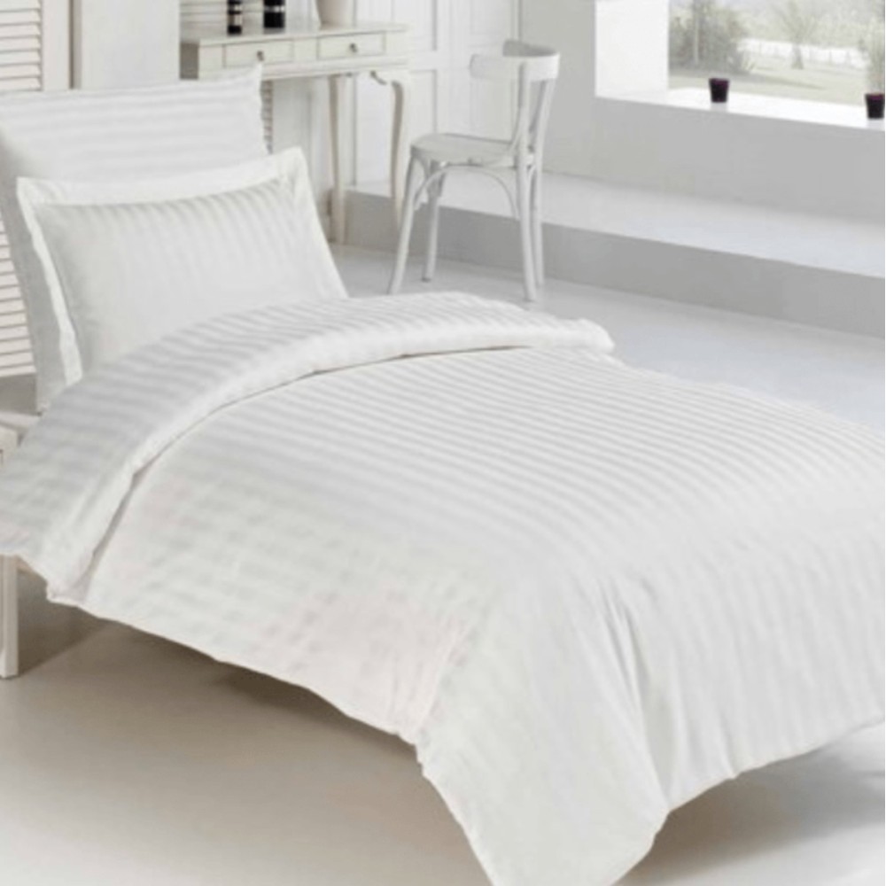 Lenjerie de pat single din damasc finetat, linear (tesatura din fabrica, ci nu imprimata, cu dunga de 1 cm grosime), confectionata din bumbac 70% + 30% poliester, cu 4 piese, folosita cel mai mult in regimul hotelier, datorita simplitatii si calitatii extraordinare. Materialul are un aspect usor lucios pentru o nota de eleganta si rafinament, datorita tesaturii speciale. Damascul este recunoscut pentru rezistenta sa in timp la nenumarate spalari, nemodificandu-si aspectul.
