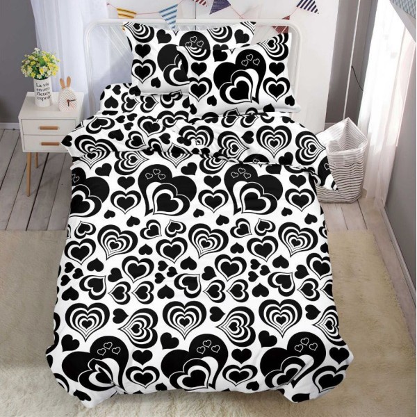 Lenjerie pat 1 PERSOANA, 3 piese, IMPRIMEU 3D Multiplicat, Microfibra, Alb-Negru, inimioare, Johny Home Pucioasa, cod produs: SPR-BG-28