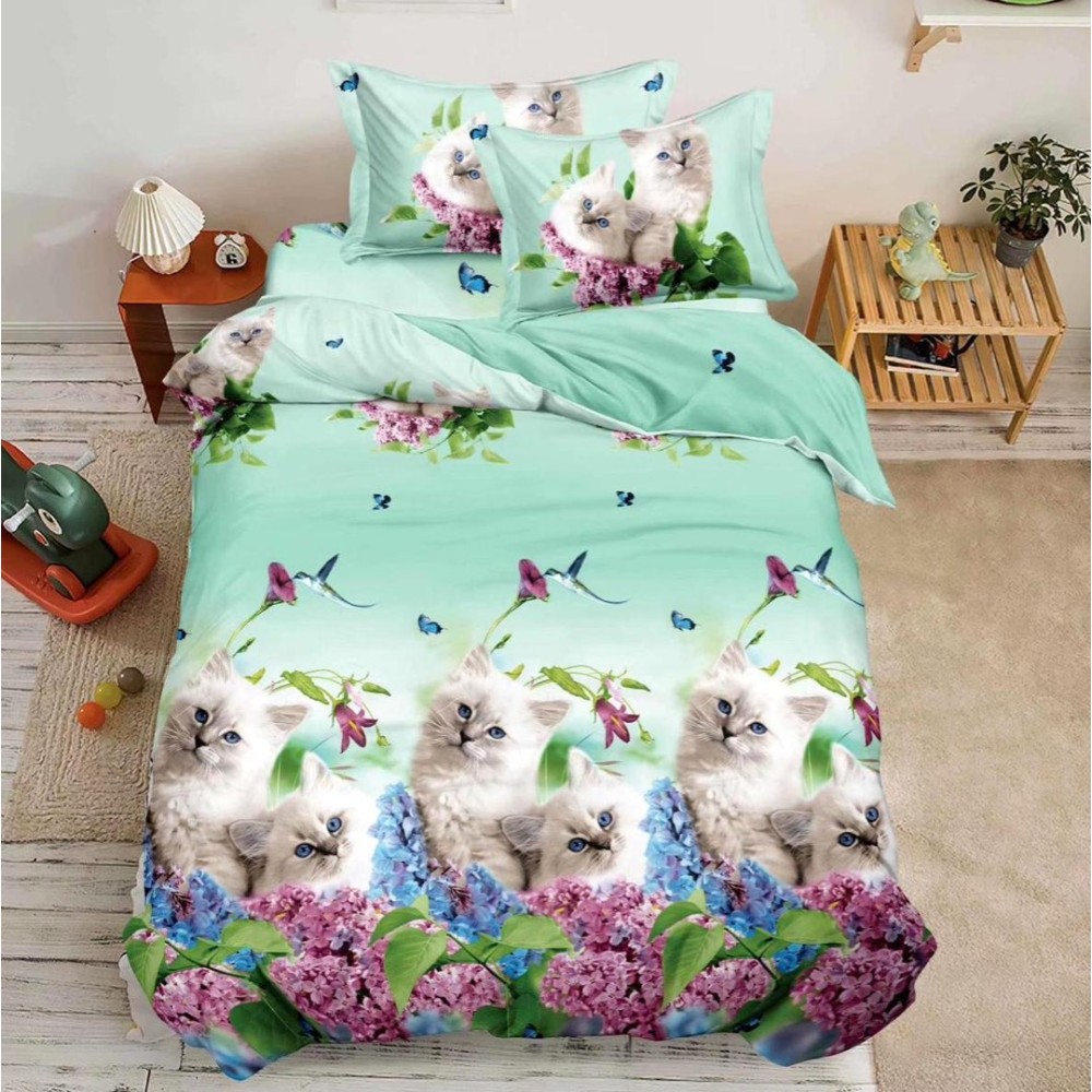 Lenjerie pat 1 PERSOANA, 3 piese, IMPRIMEU 3D Multiplicat, Microfibra, Bleu, pisicute, flori, Johny Home Pucioasa, cod produs: SPR-BG-06