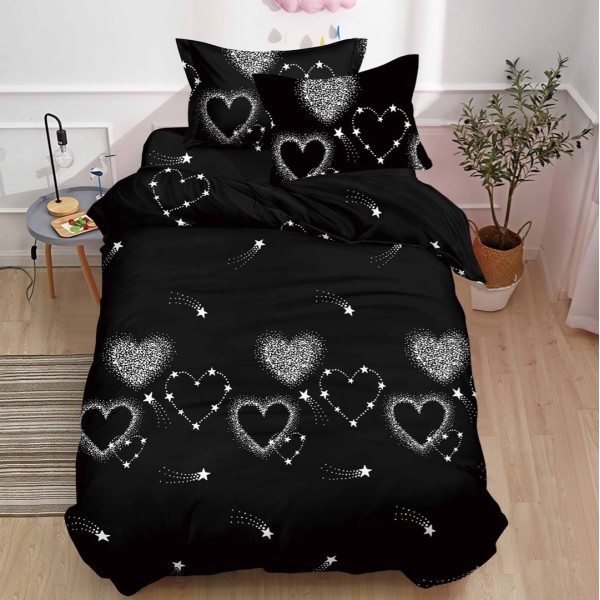 Lenjerie pat 1 PERSOANA, 3 piese, IMPRIMEU 3D Multiplicat, Microfibra, Negru, inimioare, stelute, Johny Home Pucioasa, cod produs: SPR-BG-34