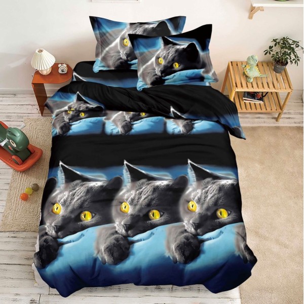 Lenjerie pat 1 PERSOANA, 3 piese, IMPRIMEU 3D Multiplicat, Microfibra, Negru, pisici, Johny Home Pucioasa, cod produs: SPR-BG-19