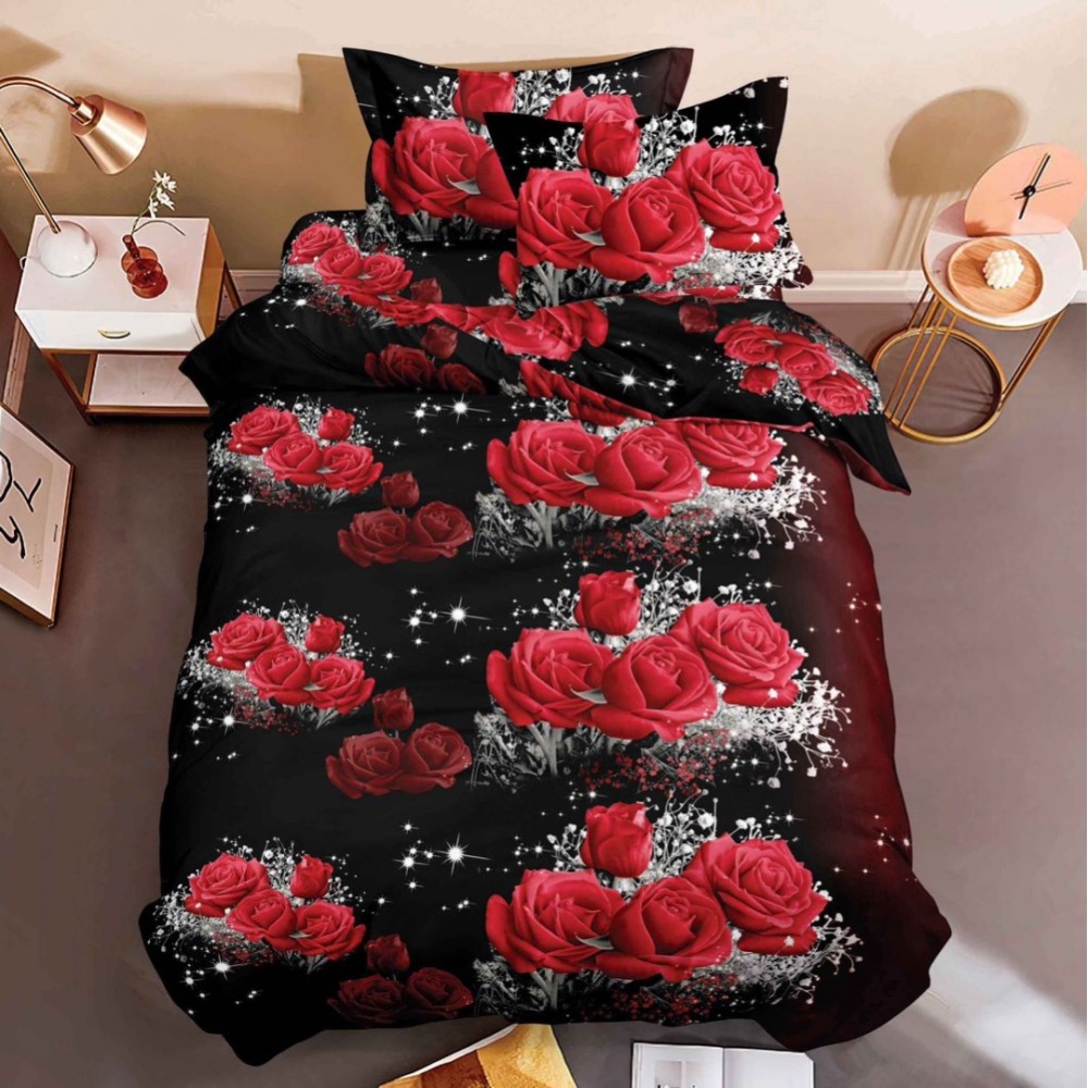 Lenjerie pat 1 PERSOANA, 3 piese, IMPRIMEU 3D Multiplicat, Microfibra, Negru-Rosu, trandafiri, Johny Home Pucioasa, cod produs: SPR-BG-14