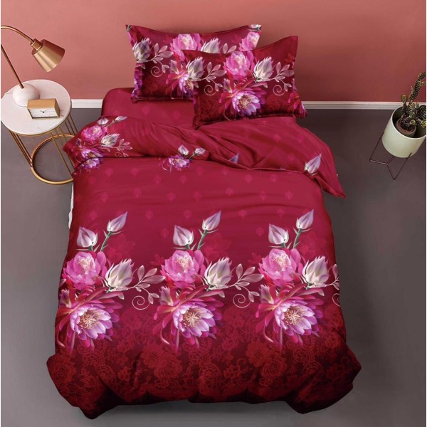 Lenjerie pat 1 PERSOANA, 3 piese, IMPRIMEU 3D Multiplicat, Microfibra, Visiniu, flori, Johny Home Pucioasa, cod produs: SPR-BG-10