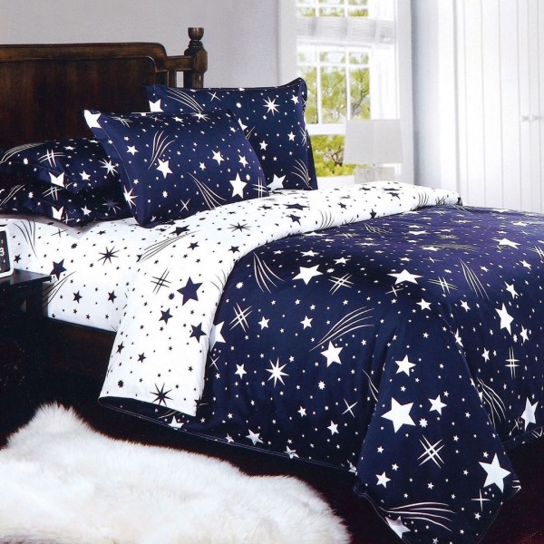 Lenjerie pat 1 PERSOANA, 4 piese, cu ELASTIC, Albastru, stelute, Johny Home Pucioasa, cod produs: SPR-YE-22