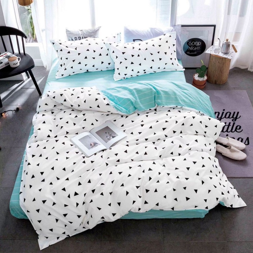 Lenjerie pat 1 PERSOANA, 4 piese, cu ELASTIC, Alb-Bleu, forme geometrice, Johny Home Pucioasa, cod produs: SPR-YE-26