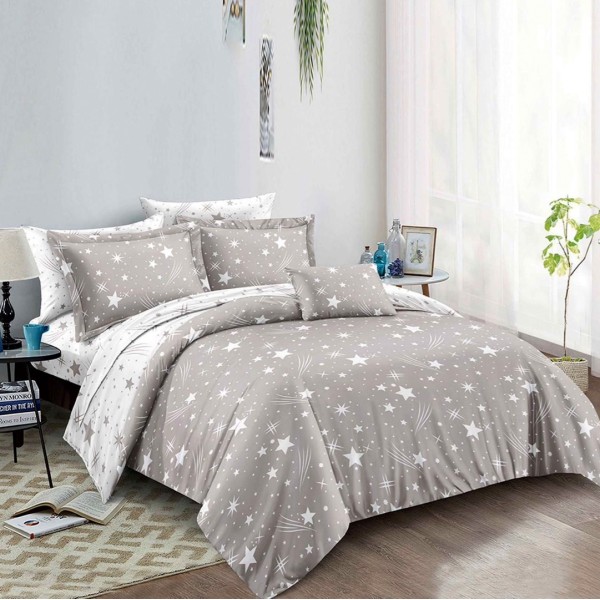 Lenjerie pat 1 PERSOANA, 4 piese, cu ELASTIC, Gri, stelute, Johny Home Pucioasa, cod produs: SPR-YE-11