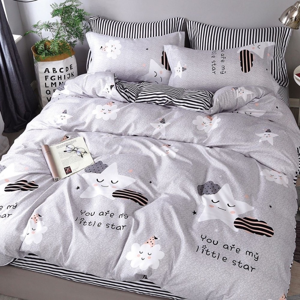 Lenjerie pat 1 PERSOANA, 4 piese, cu ELASTIC, Gri, stelute, norisori, Johny Home Pucioasa, cod produs: SPR-YE-16