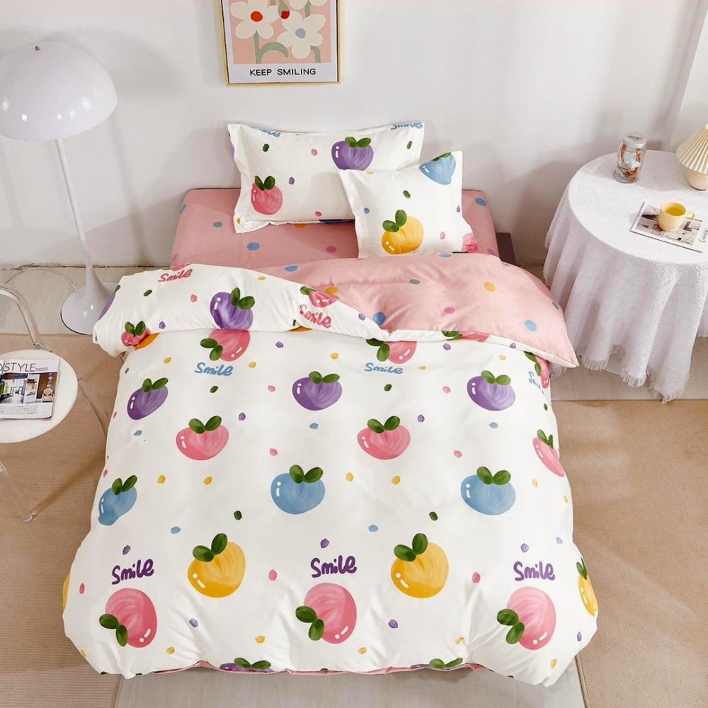 Lenjerie pat 1 PERSOANA, FINET, 4 piese, cu ELASTIC, Alb-Roz, fructe, buline, Johny Home Pucioasa, cod produs: SPR-T60-80