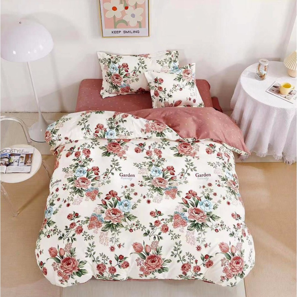 Lenjerie pat 1 PERSOANA, FINET, 4 piese, cu ELASTIC, Roz pudra, flori, Johny Home Pucioasa, cod produs: SPR-T60-86