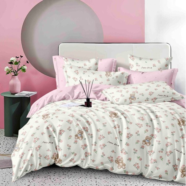 Lenjerie pat 1 PERSOANA, FINET, 4 piese, Jojo Home, Alb-Roz, flori, ursuleti, cod produs: JOS204