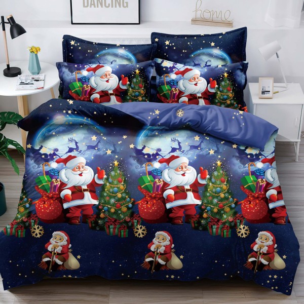Lenjerie pat 1 PERSOANA, FINET, 4 piese, Jojo Home, Craciun, Bleumarin-Multicolor, Mos Craciun, brazi, cod produs: JOS318