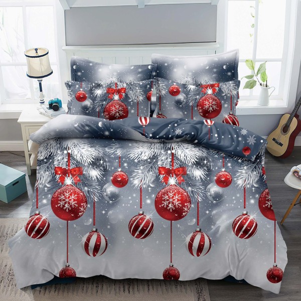 Lenjerie pat 1 PERSOANA, FINET, 4 piese, Jojo Home, Craciun, Gri-Rosu, globulete, cod produs: JOS310