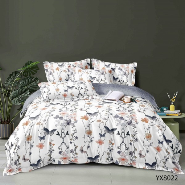 Lenjerie pat 140x200cm, FINET, cu elastic, 4 piese, Alb, Gri, Flori si Fluturi, Primavara Casa, cod produs: PRM-FS-YX8022