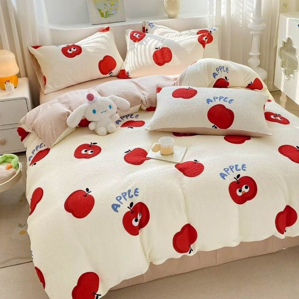 Lenjerie pat 1 PERSOANA, Soft Touch CREPONAT DELUXE, 4 piese, cu ELASTIC, Rosu, mere, Johny Home Pucioasa, cod produs: PRM-DR008