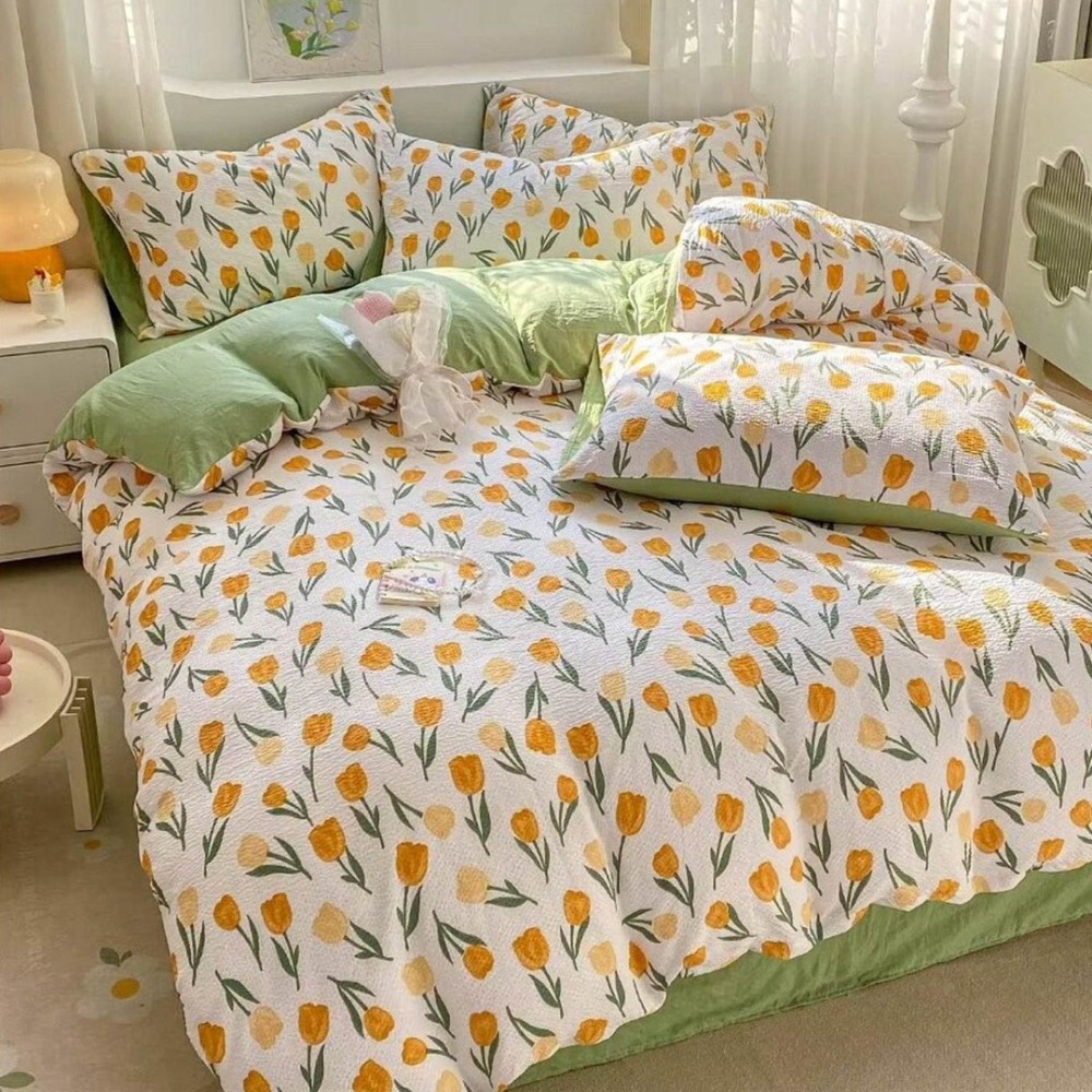 Lenjerie pat 1 PERSOANA, Soft Touch CREPONAT DELUXE, 4 piese, cu ELASTIC, Verde-Galben, lalele, Johny Home Pucioasa, cod produs: PRM-DR005