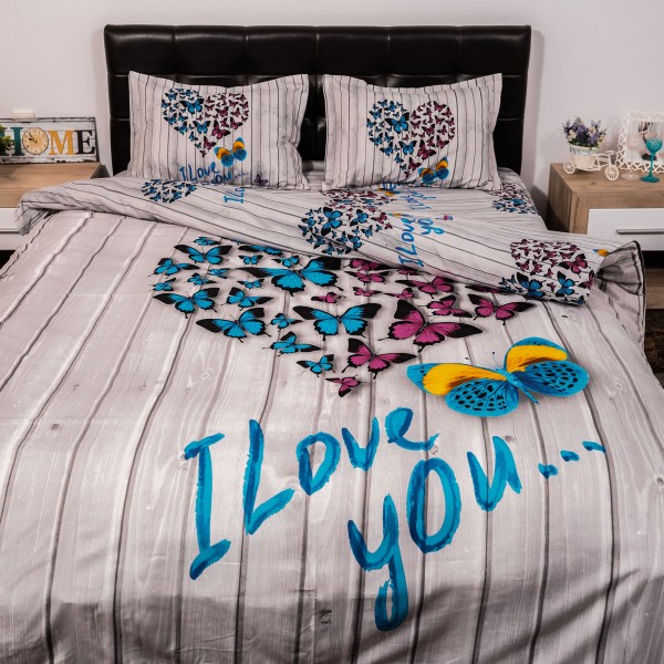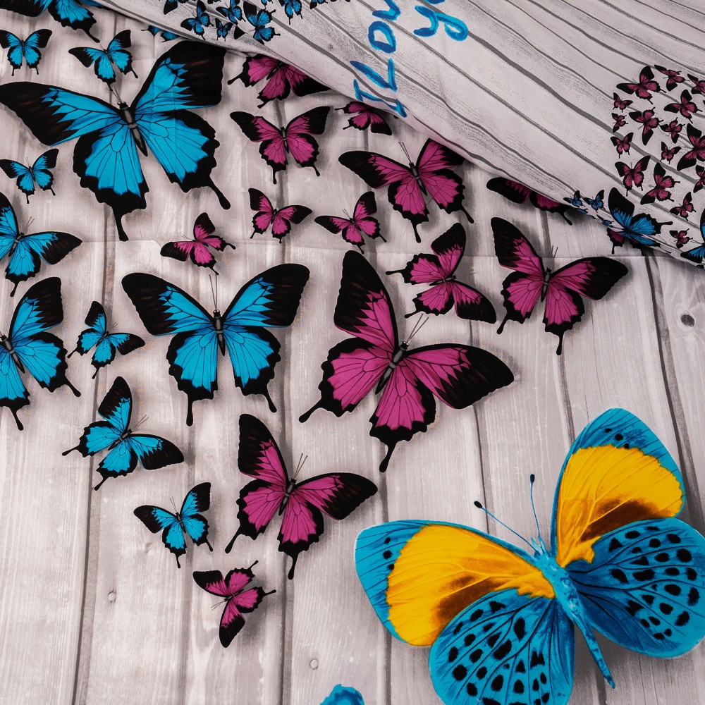 Lenjerie pat dublu, Ralex Pucioasa, Bumbac Satinat, 4 piese, 3D Digital Print, Gri-Albastru , fluturi, cod produs: RXE72